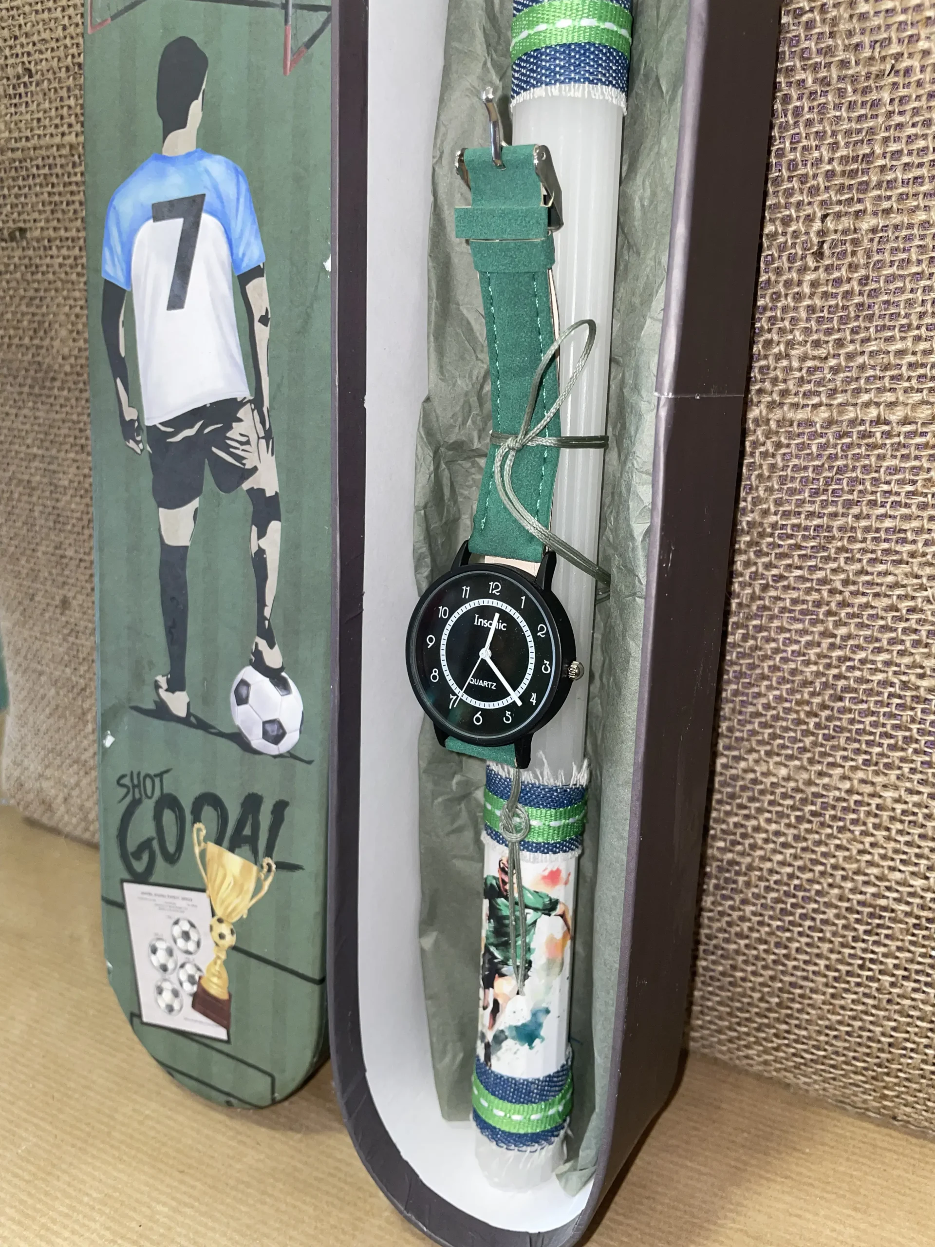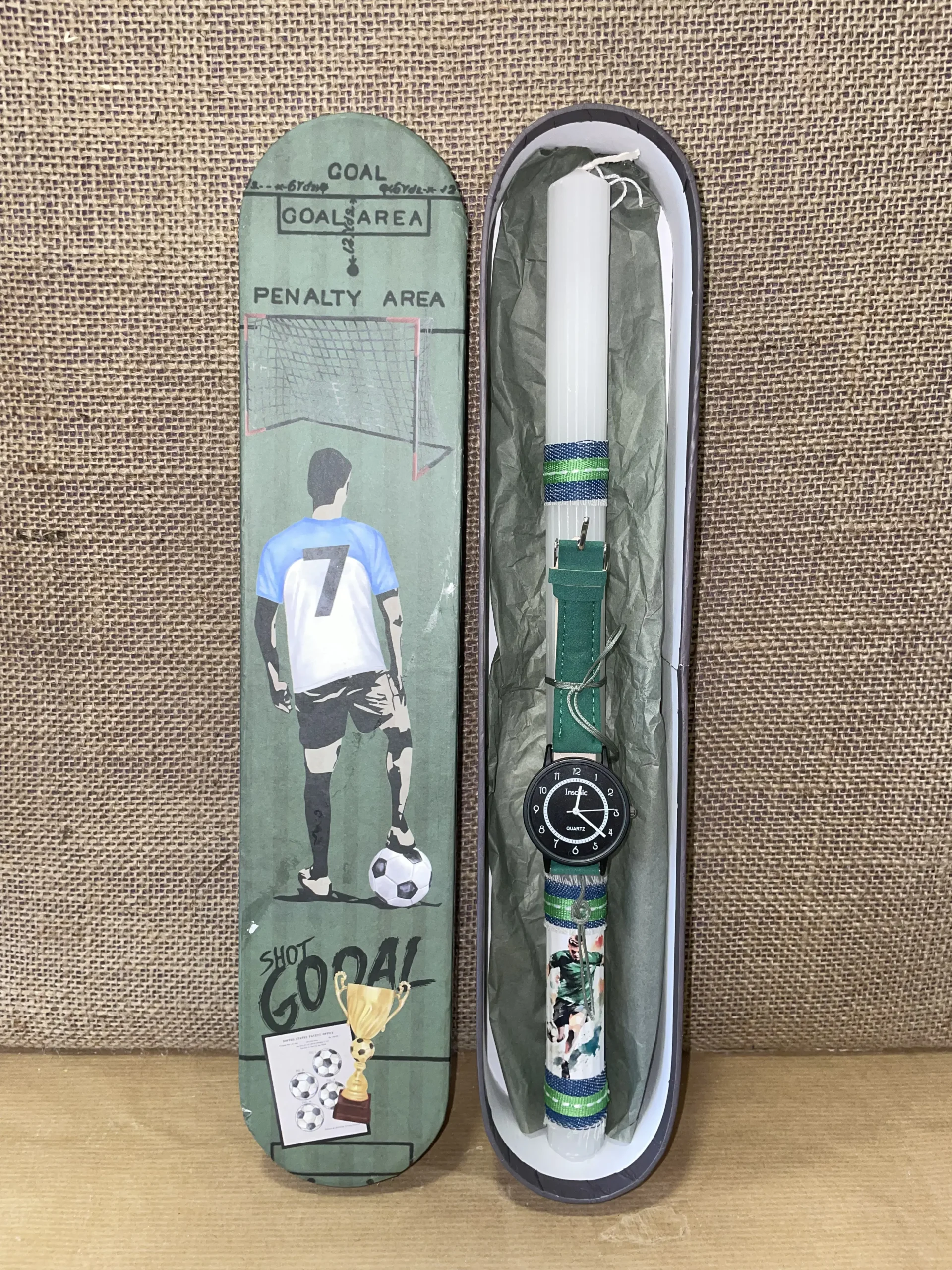 Λευκή με πράσινο στρογγυλή λαμπάδα με ρολόϊ χειρός πράσινο
