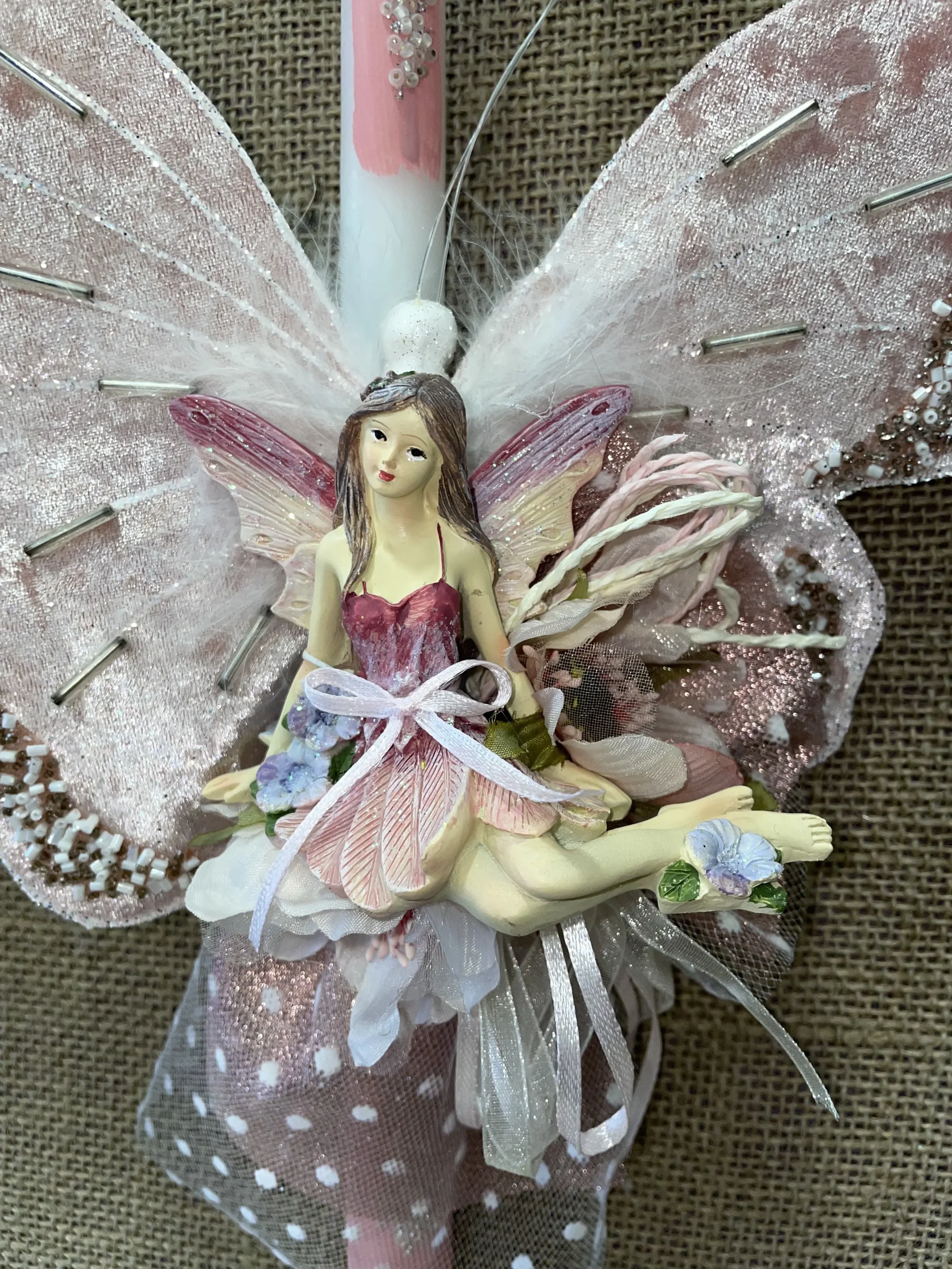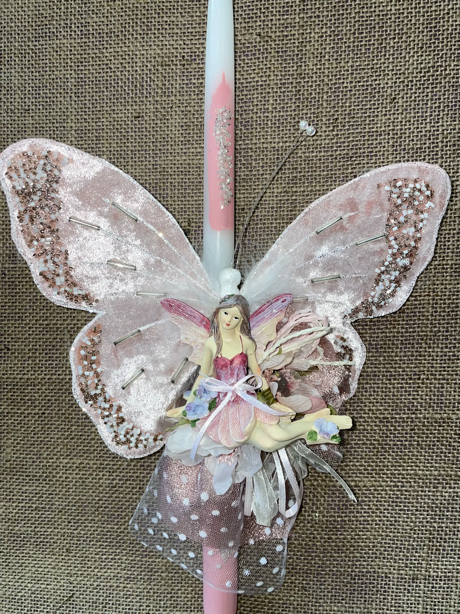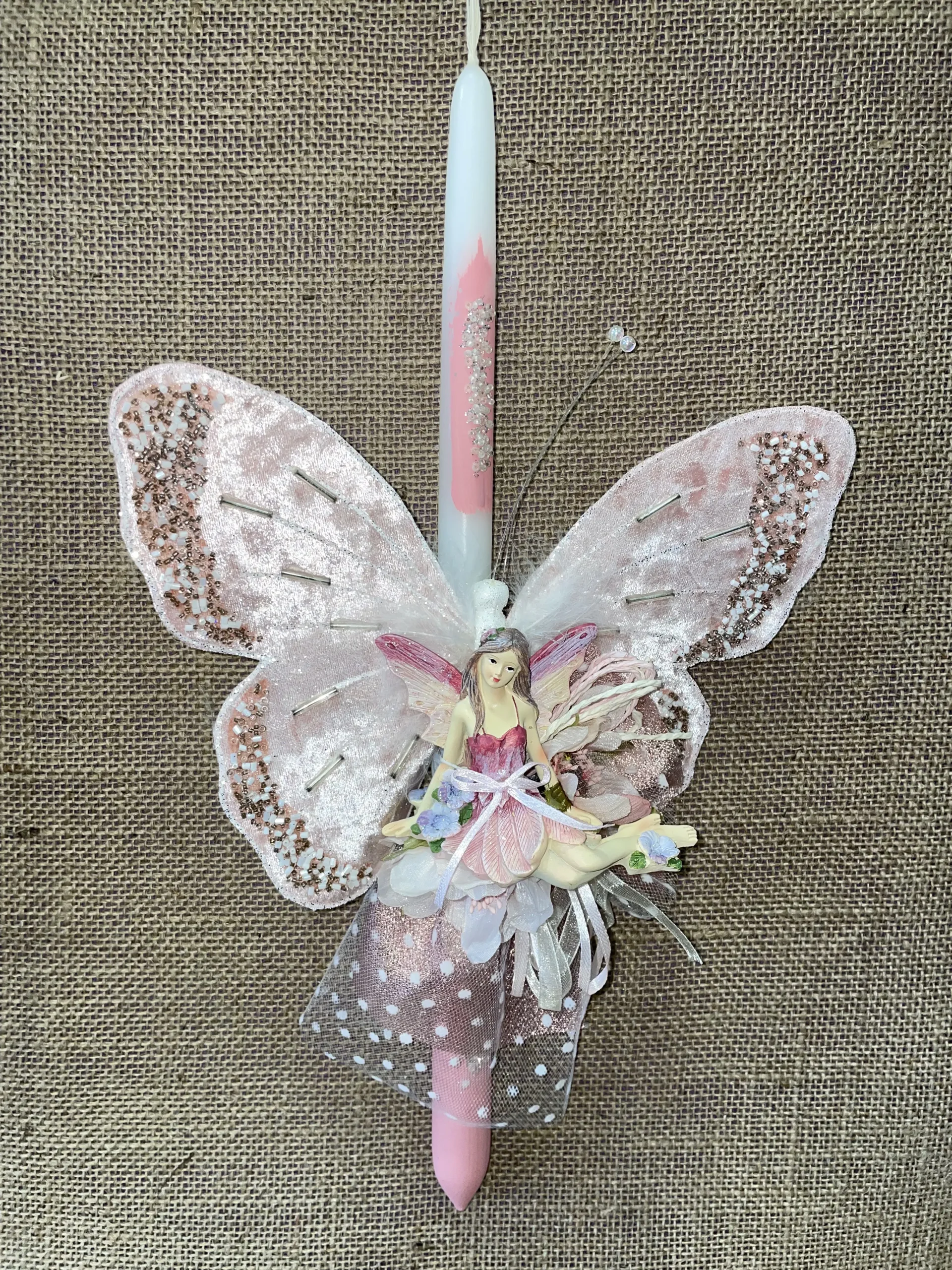 Ετικέτα: Λευκή με ροζ στρογγυλή λαμπάδα με πεταλούδα και νεράϊδα