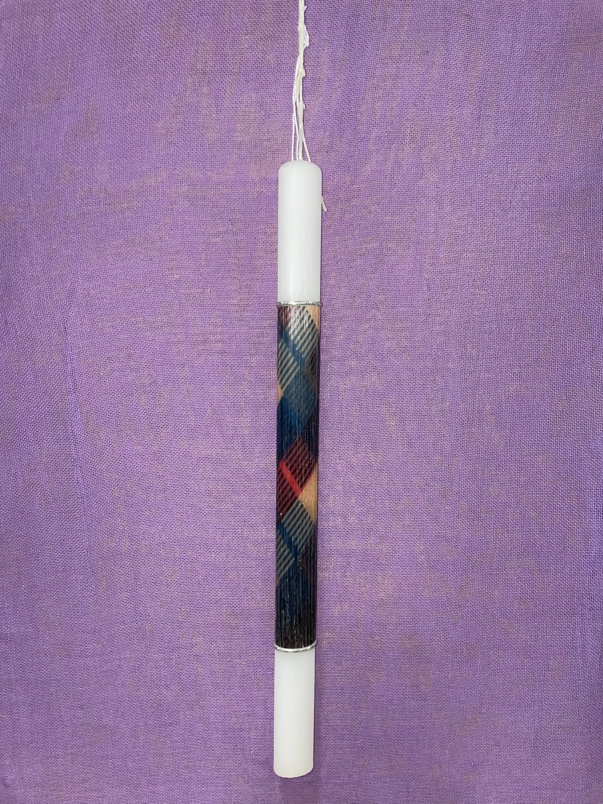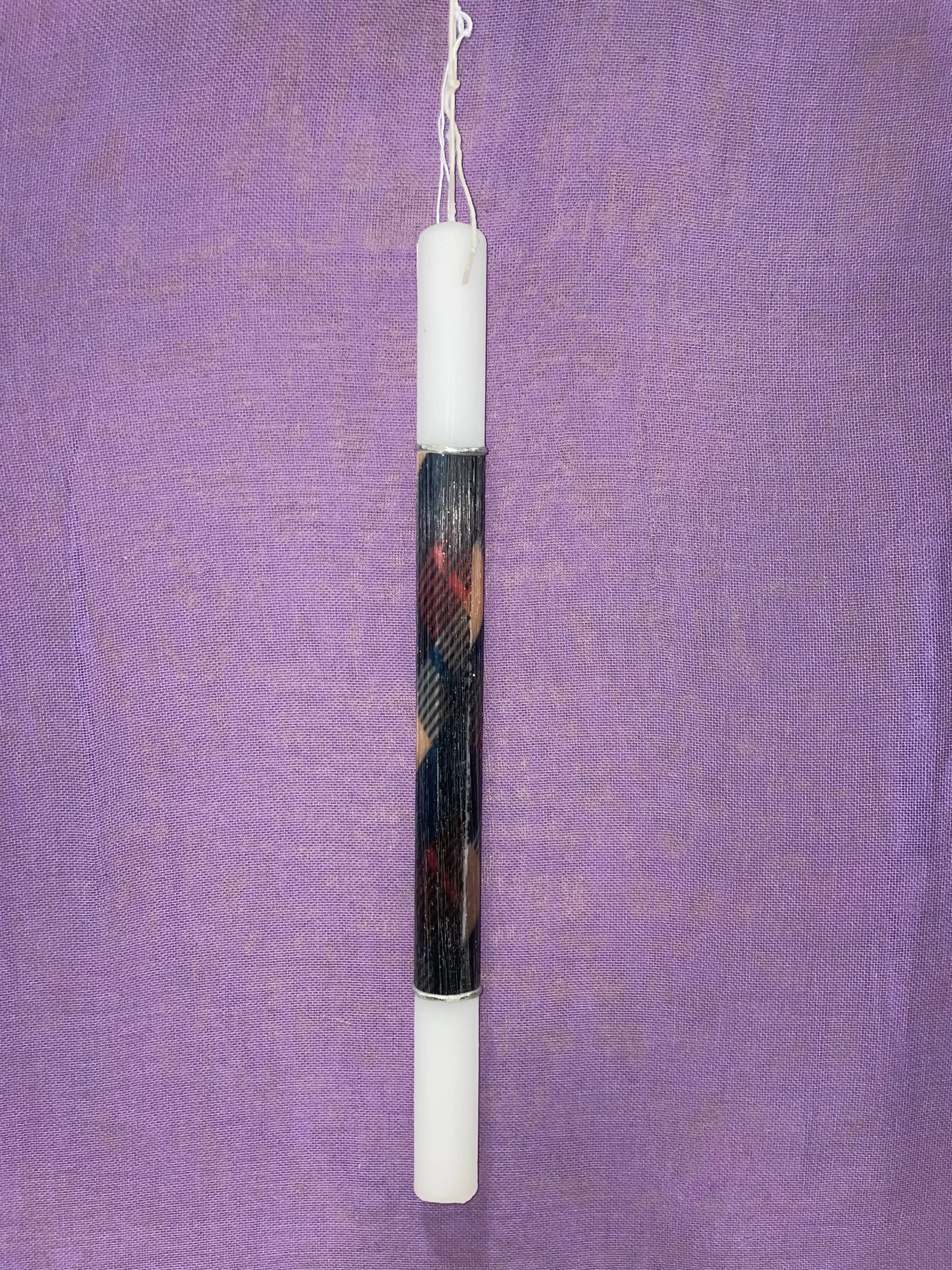 Ετικέτα: Λευκή οβάλ λαμπάδα με γεωμετρικά σχέδια μαύρο/καφέ/κεραμιδί