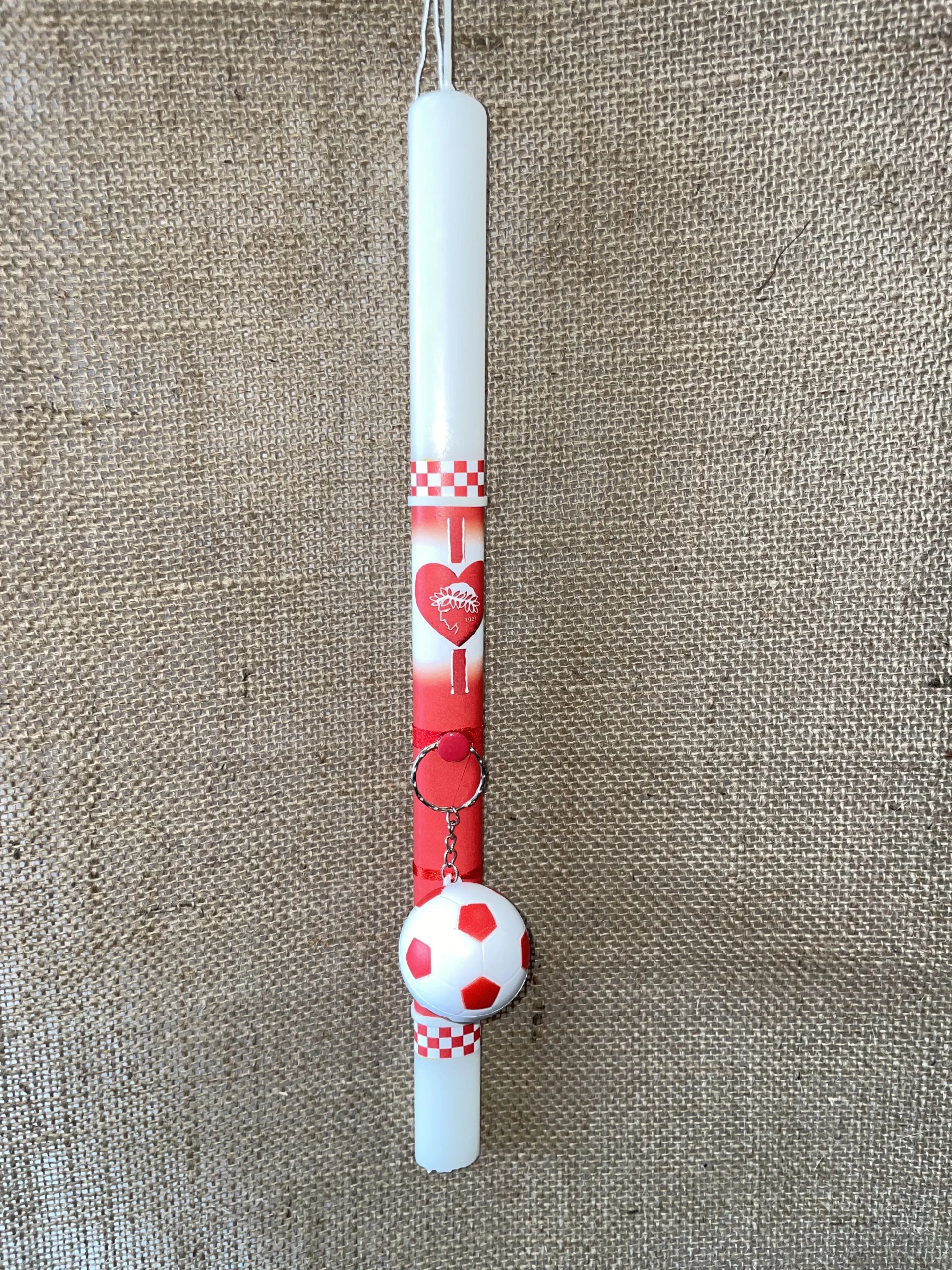 Λευκή οβάλ λαμπάδα με ντεκουπάζ ΟΣΦΠ και μπρελόκ με λευκή/κόκκινη μπάλα ποδοσφαίρου