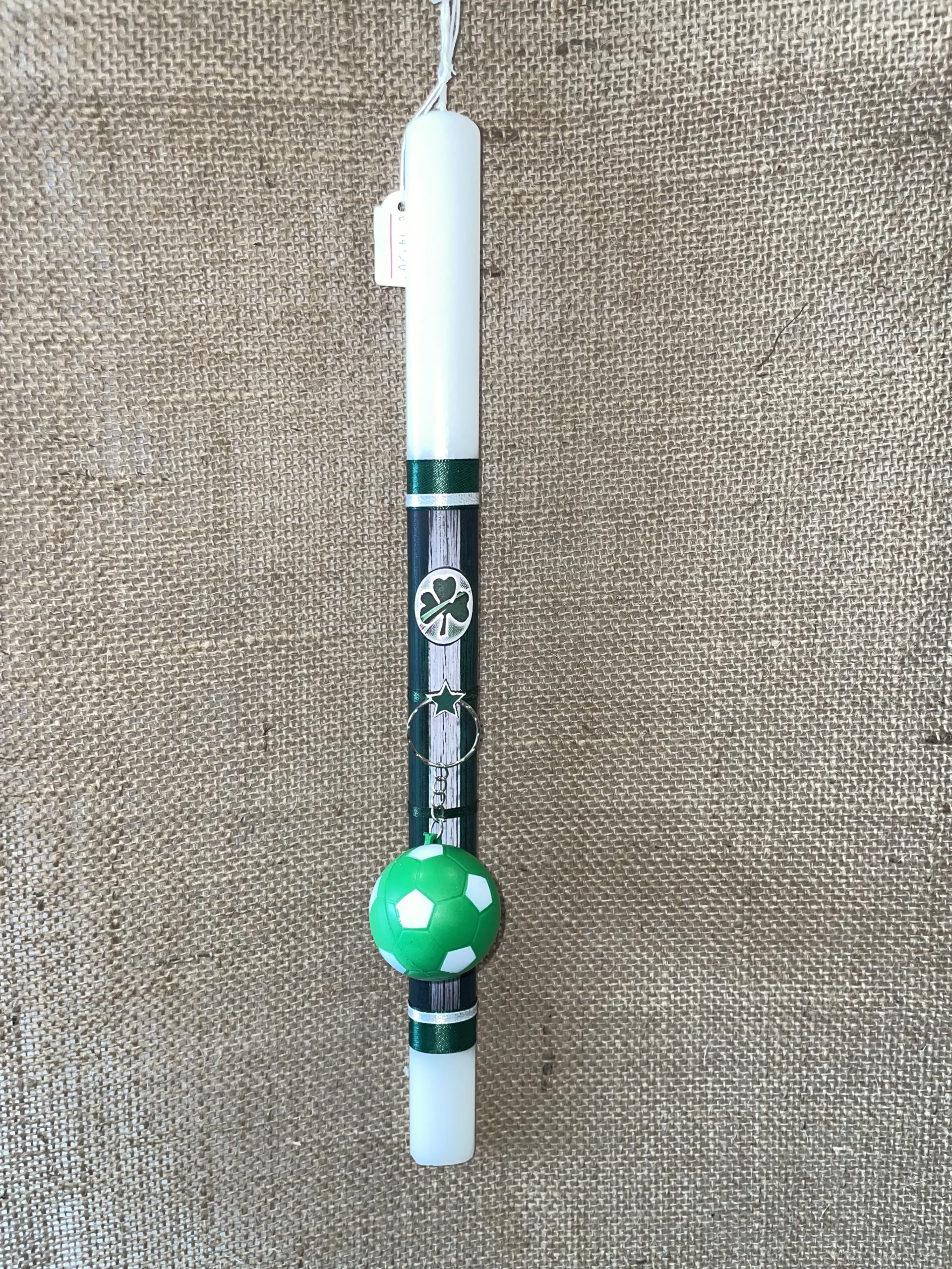 Λευκή οβάλ λαμπάδα με ντεκουπάζ ΠΑΟ και μπρελόκ με άσπρη/πράσινη μπάλα ποδοσφαίρου