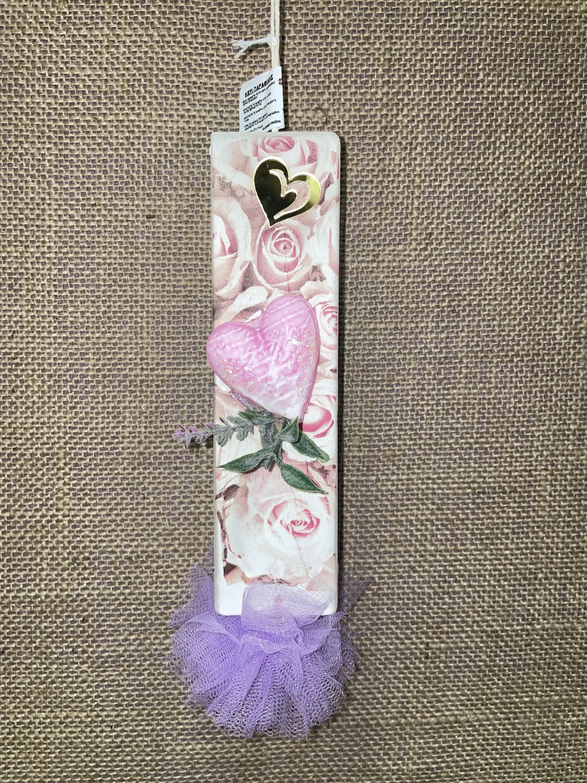Λευκή πλακέ αρωματική λαμπάδα φλοράλ με φούξια καρδιά και μωβ τούλι