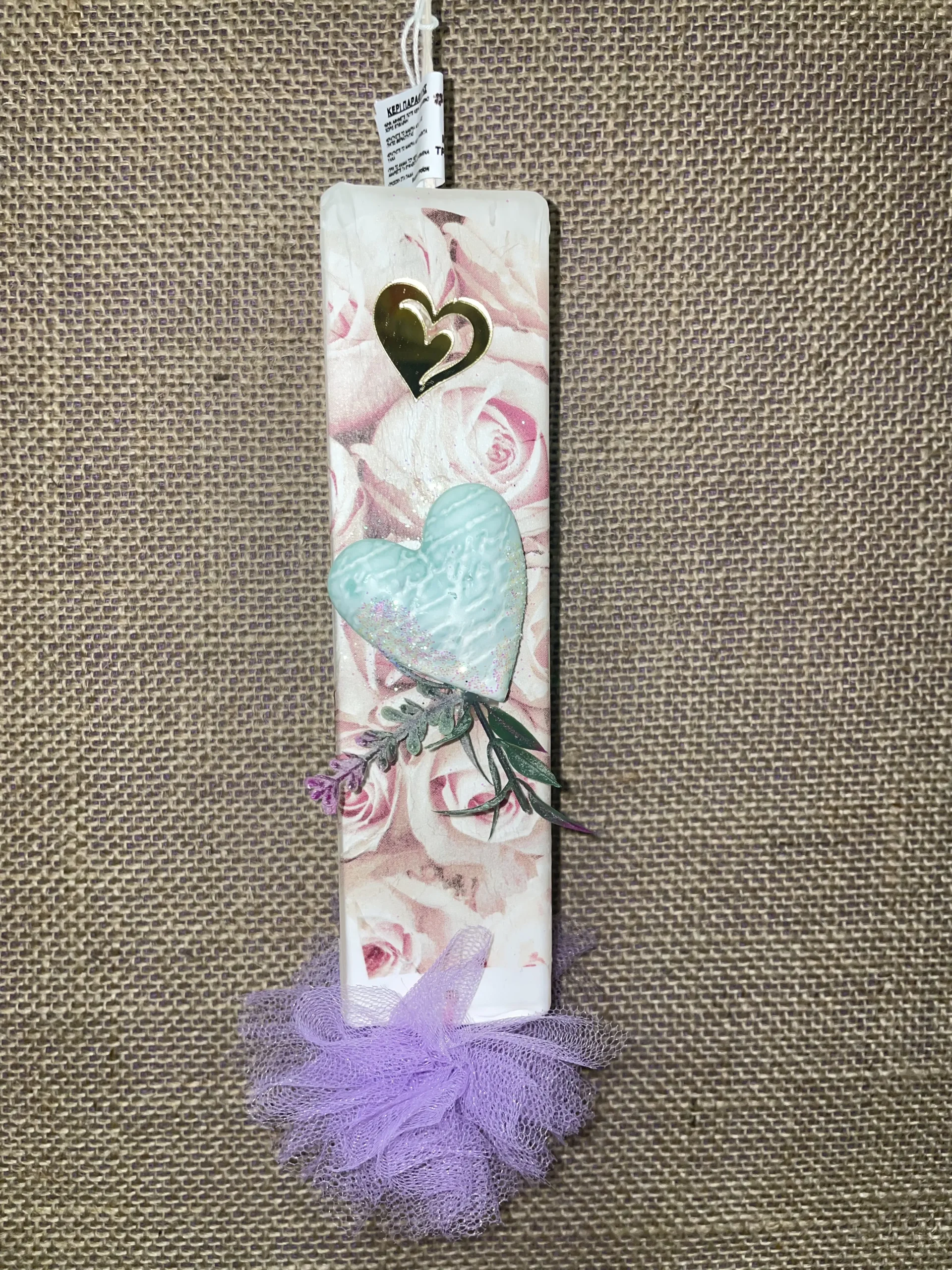 Λευκή πλακέ αρωματική λαμπάδα φλοράλ με μέντα καρδιά και μωβ τούλι
