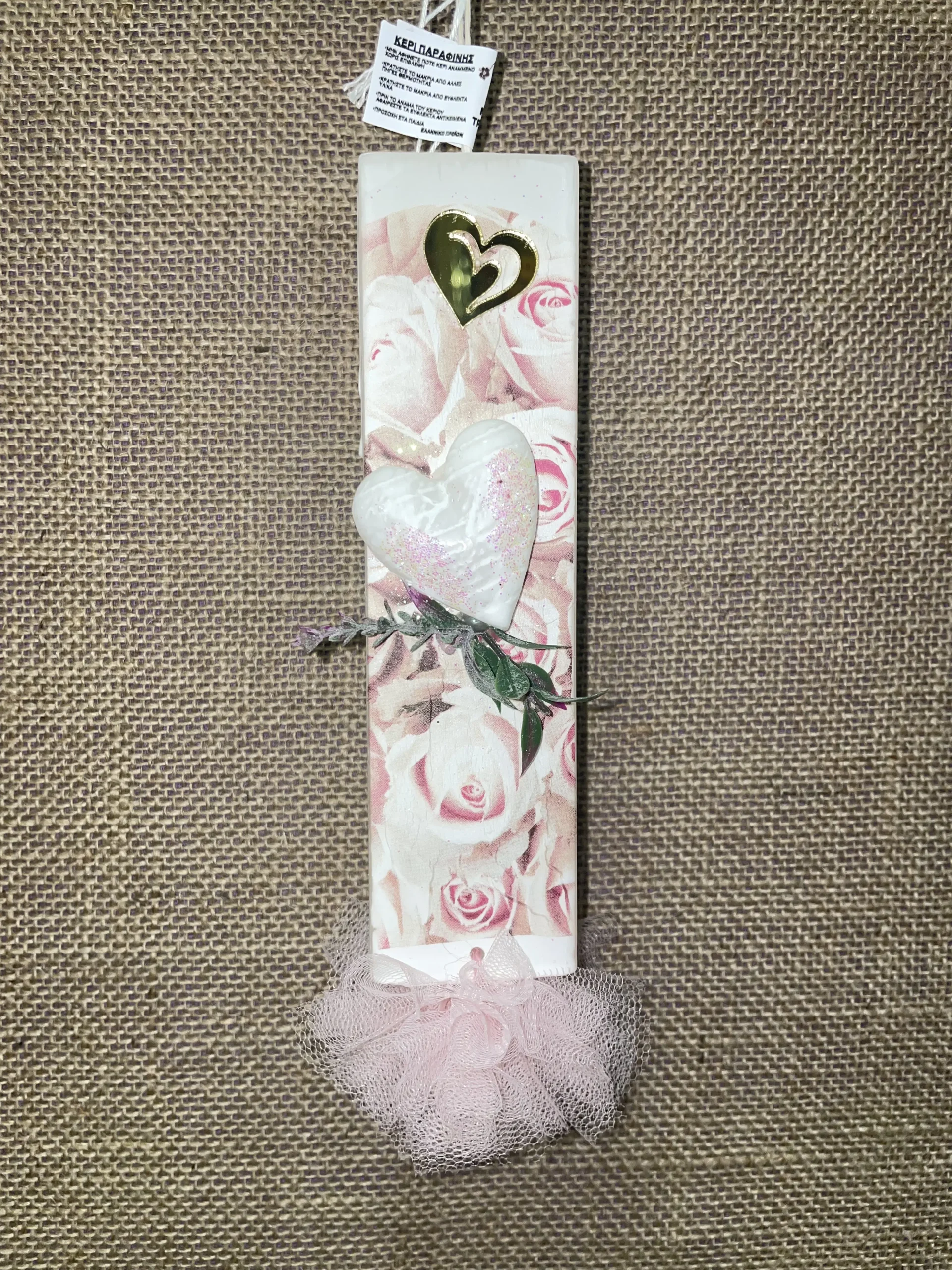 Λευκή πλακέ αρωματική λαμπάδα φλοράλ με ροζ απαλό καρδιά και λευκό τούλι