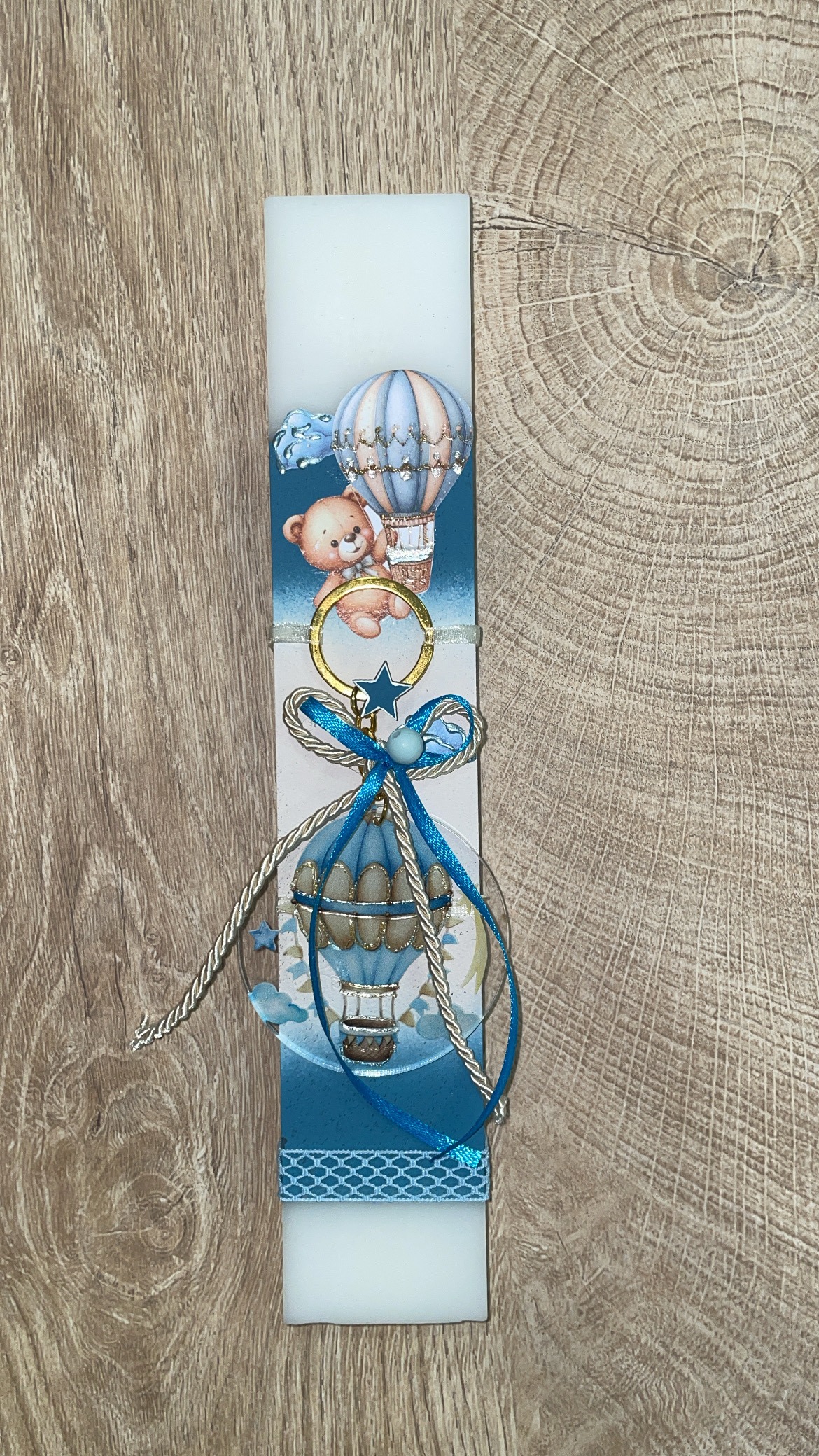 Λευκή πλακέ λαμπάδα με γαλάζιο μπρελόκ με αρκουδάκι και αερόστατο