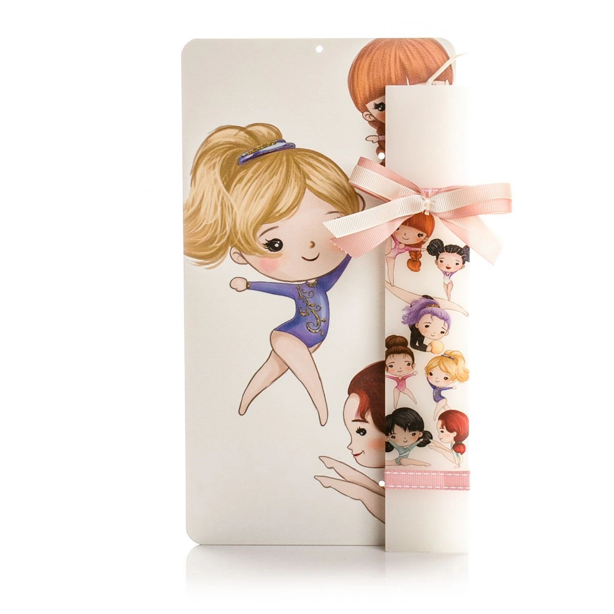 Ετικέτα: Λευκή πλακέ λαμπάδα με θέμα την Ενόργανη Γυμναστική και ίδια ξύλινη πλάτη