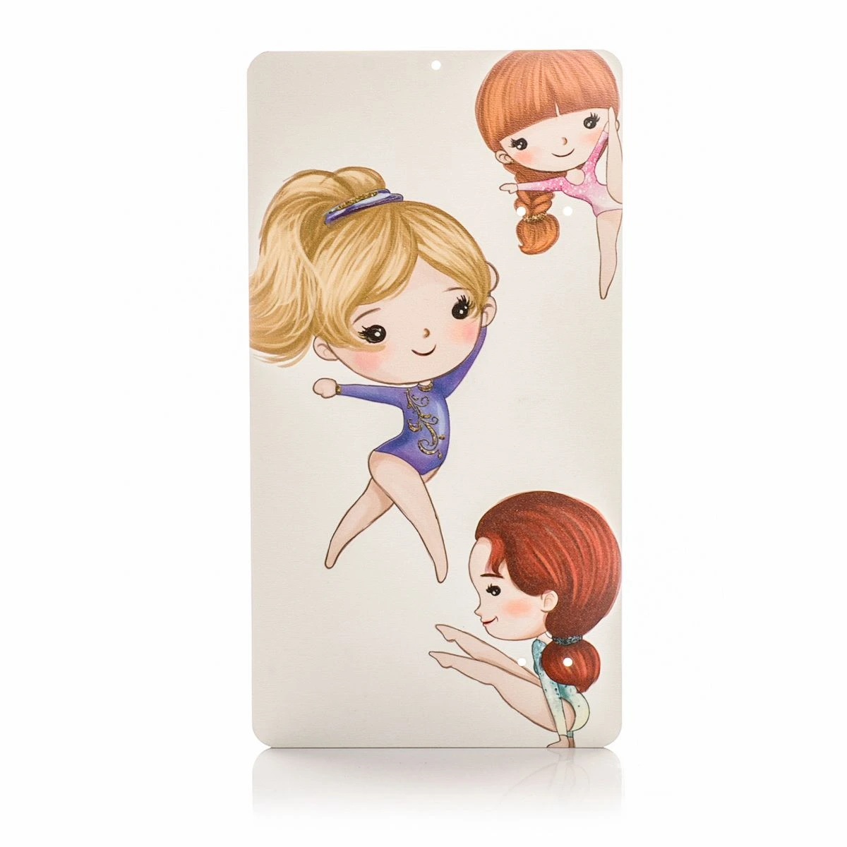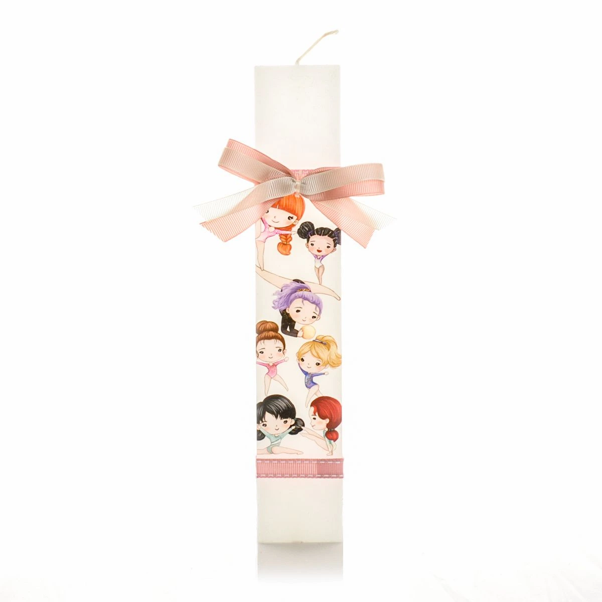 Λευκή πλακέ λαμπάδα με θέμα την Ενόργανη Γυμναστική και ίδια ξύλινη πλάτη