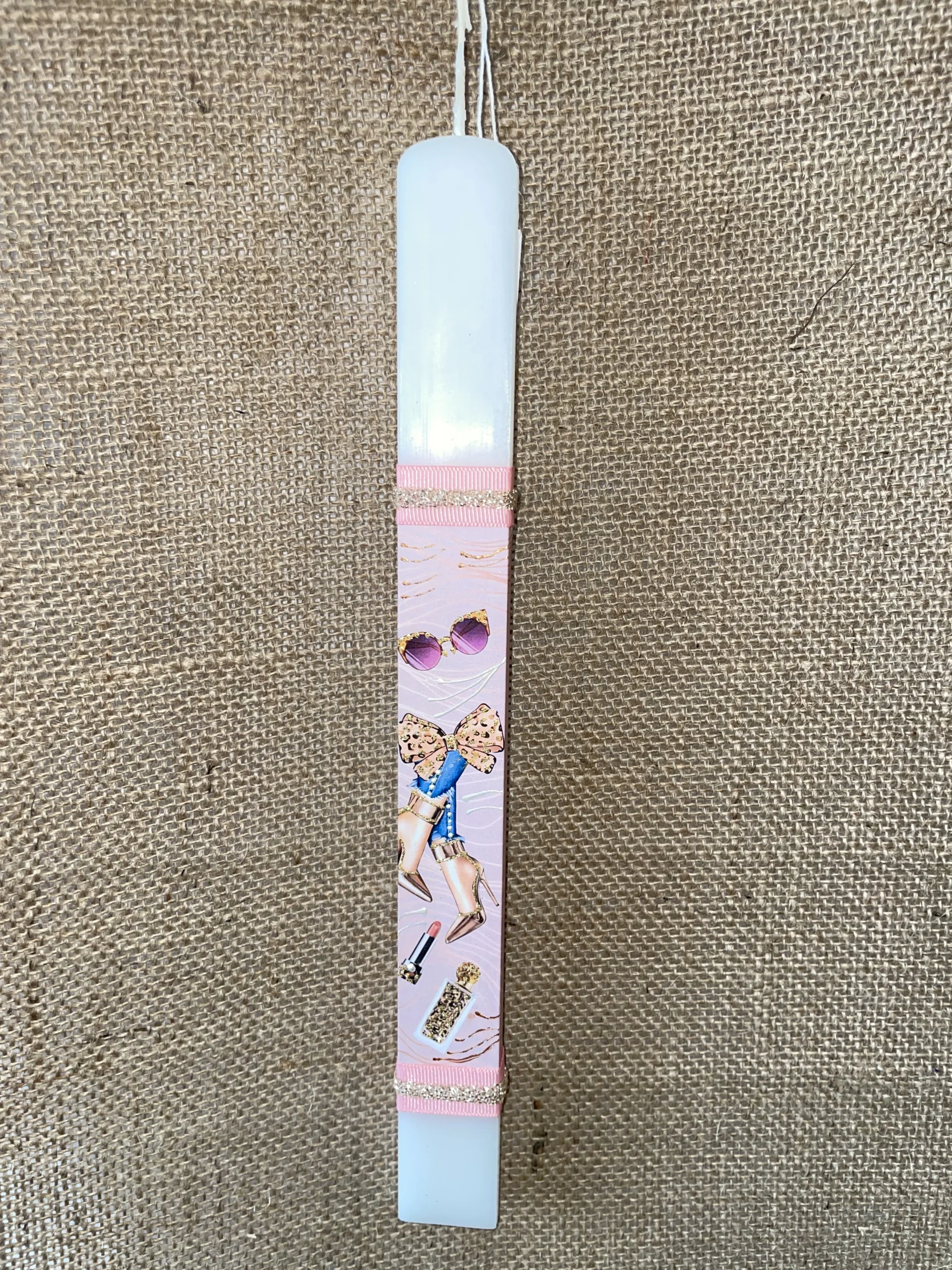 Λευκή πλακέ λαμπάδα με θέμα Fashion (άρωμα, κραγιόν, γυαλιά ηλίου, γόβες)