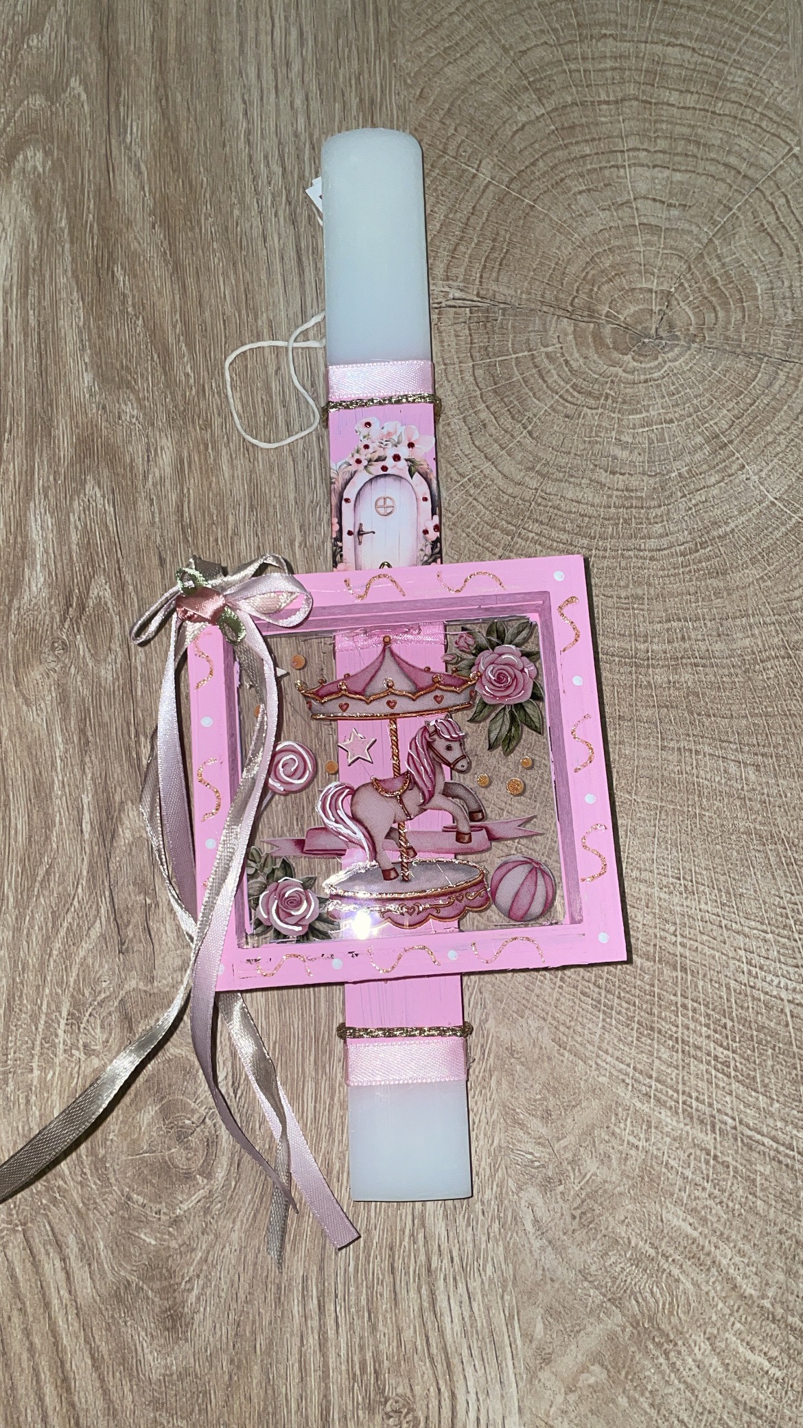 Λευκή πλακέ λαμπάδα με καρουζέλ ροζ