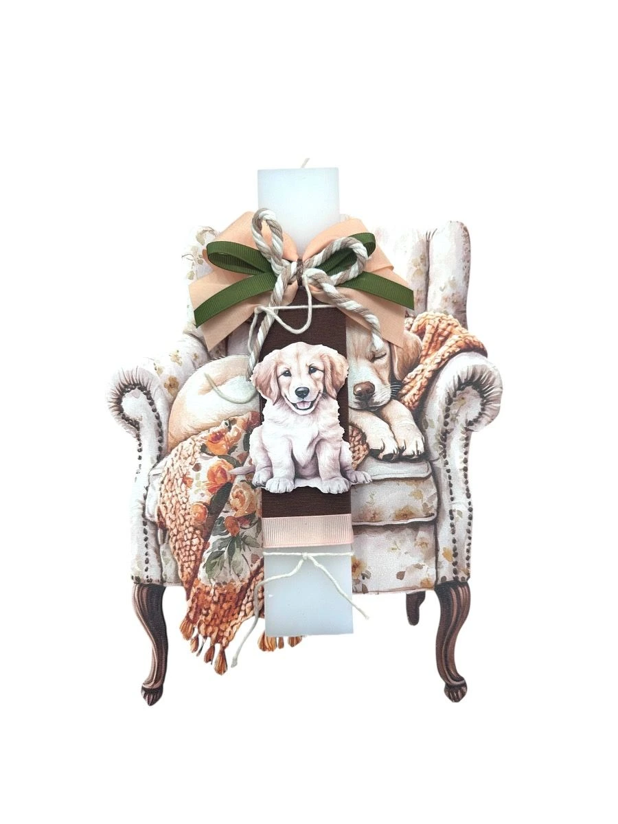 Λευκή πλακέ λαμπάδα με Λαμπραντόρ και ξύλινη πλάτη με Λαμπραντόρ σε πολυθρόνα
