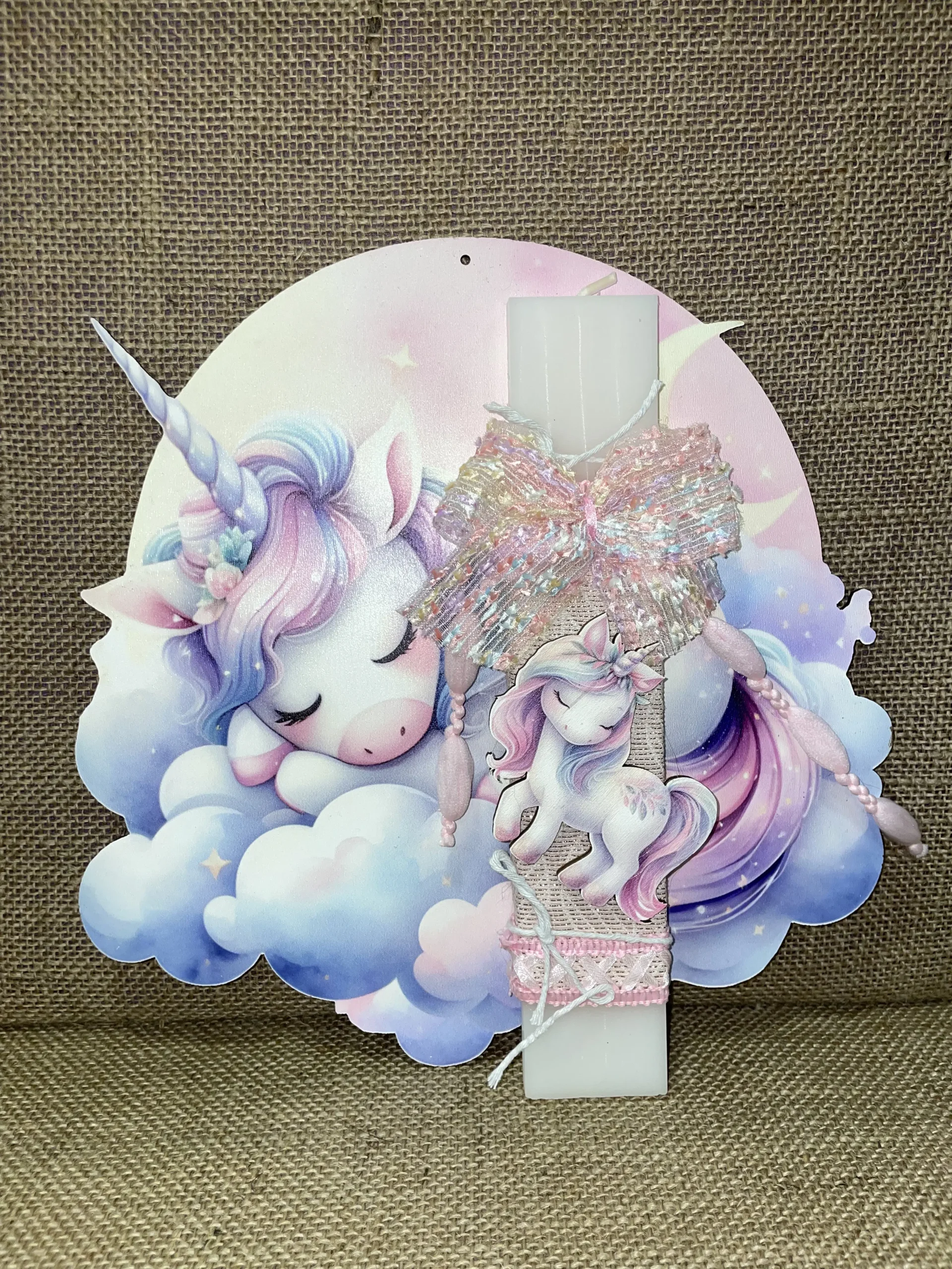 Λευκή πλακέ λαμπάδα με μονόκερο και ξύλινη πλάτη με μονόκερο που κοιμάται