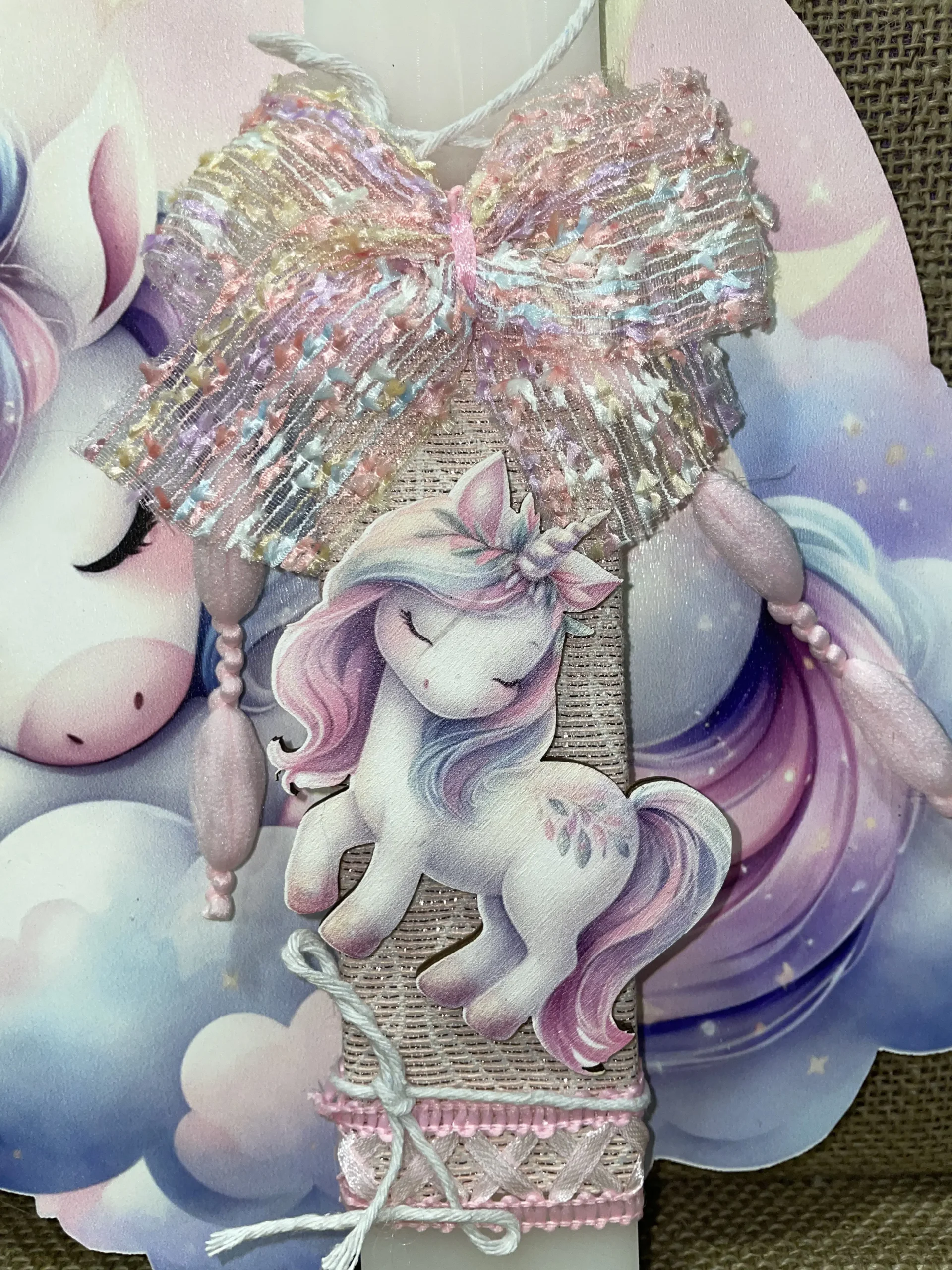 Ετικέτα: Λευκή πλακέ λαμπάδα με μονόκερο και ξύλινη πλάτη με μονόκερο πάνω σε μισοφέγγαρο