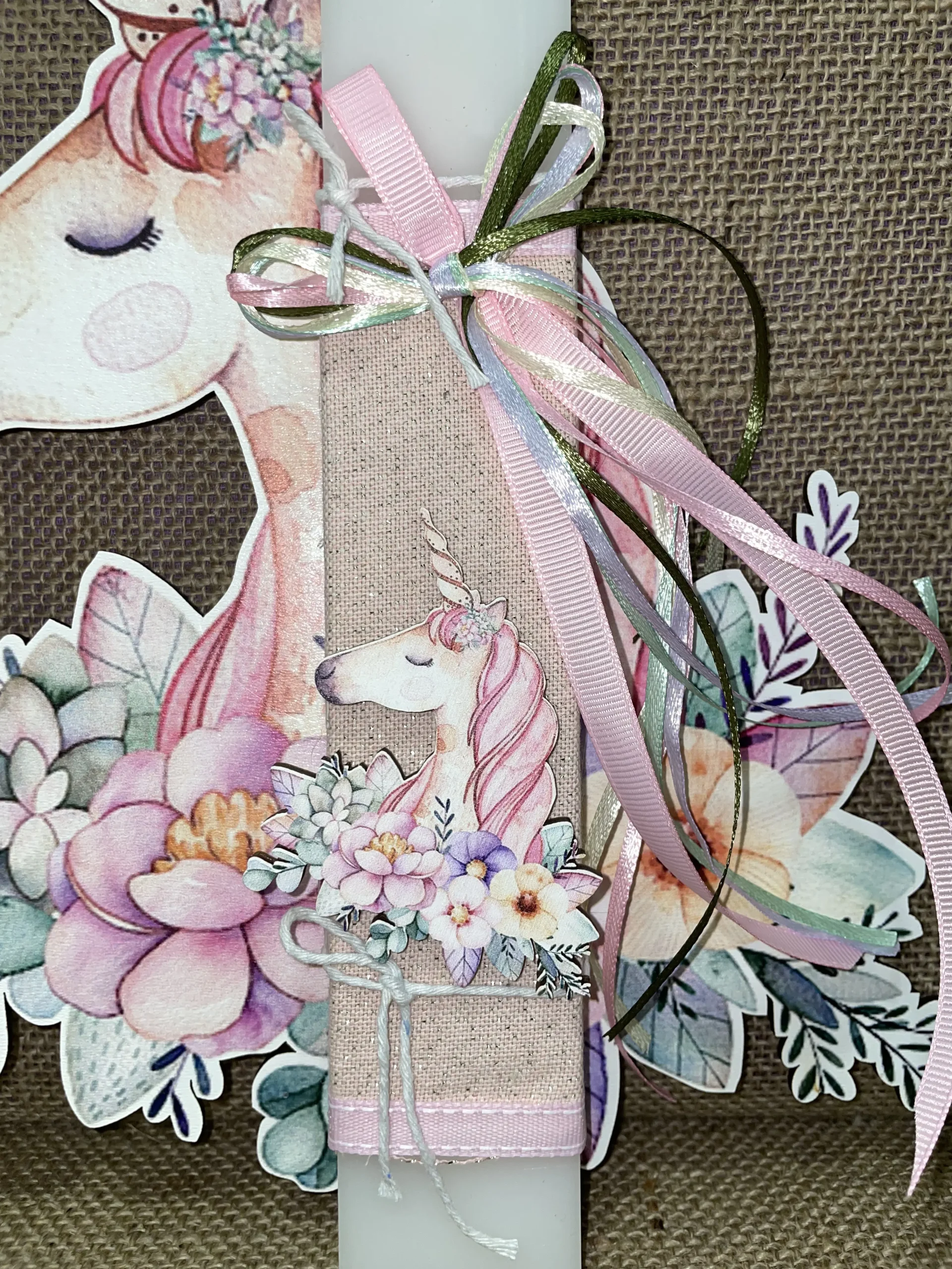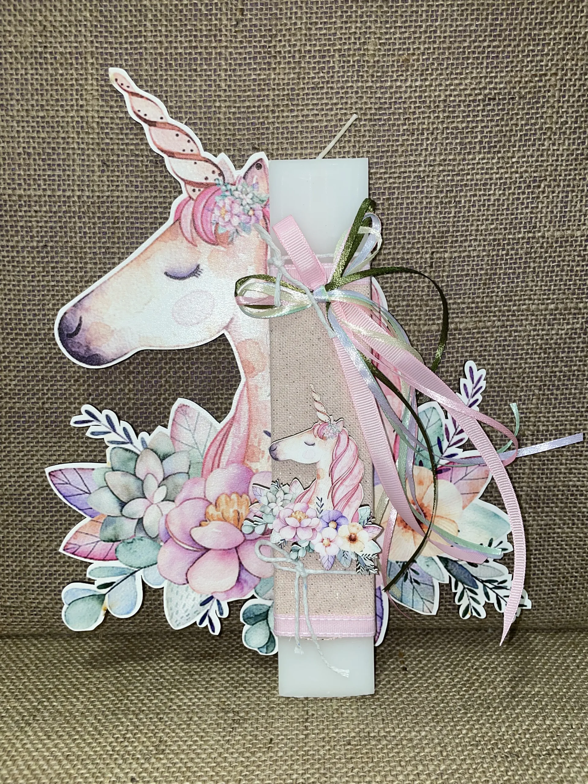Λευκή πλακέ λαμπάδα με μονόκερο με ξύλινη πλάτη με μονόκερο με λουλούδια