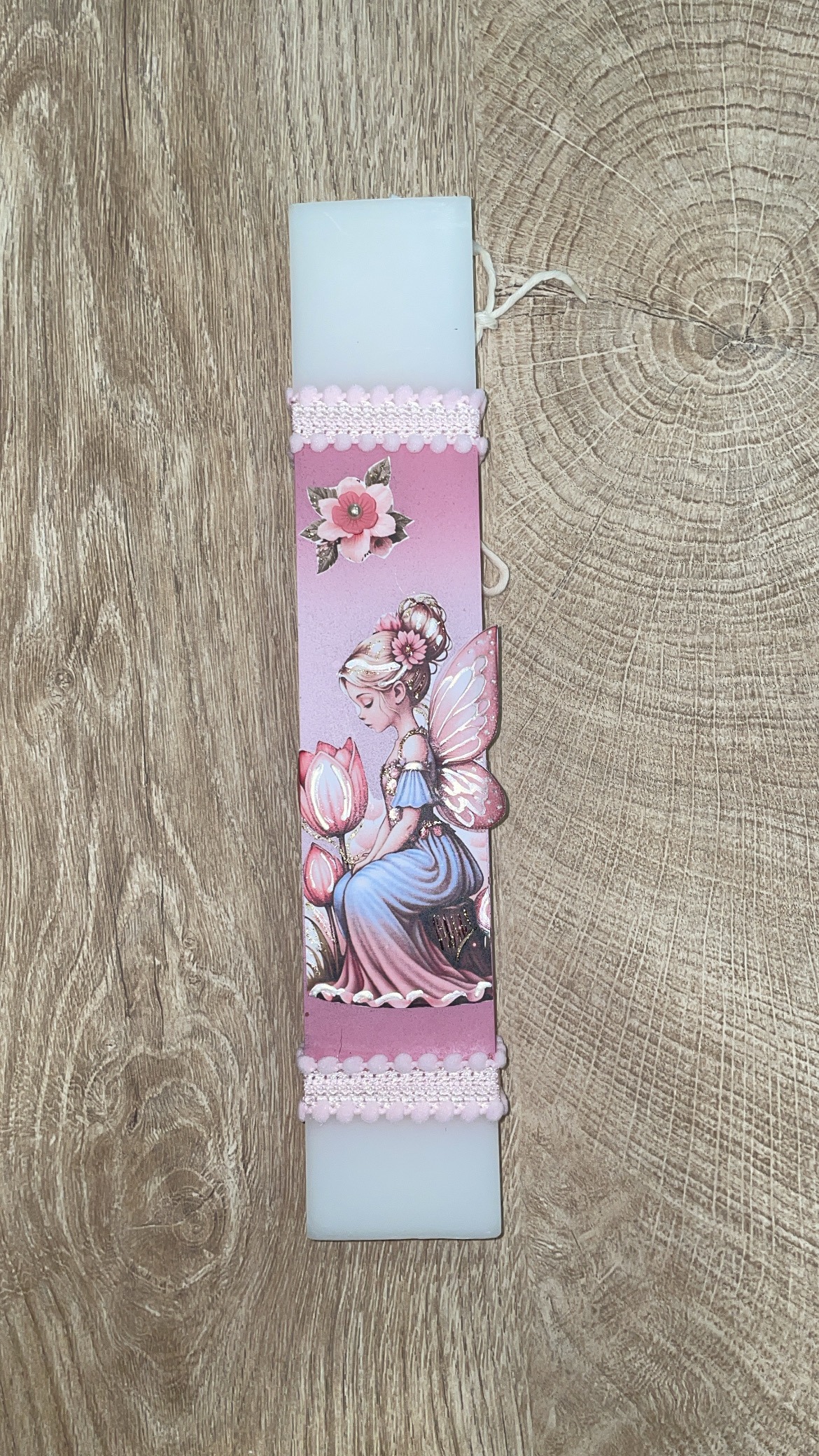 Λευκή πλακέ λαμπάδα με νεράϊδα με τρισδιάστατα φτερά