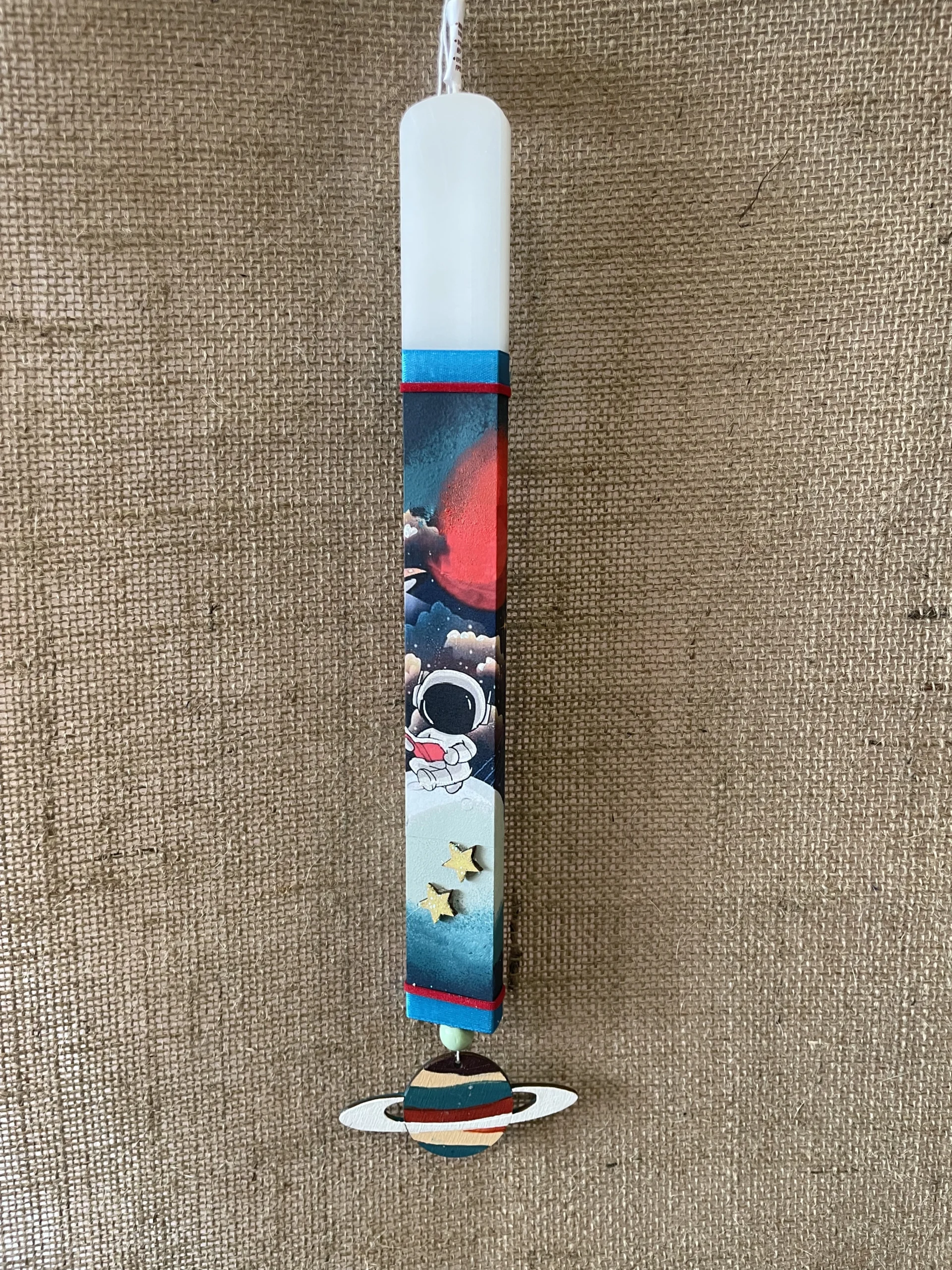 Λευκή πλακέ λαμπάδα με ντεκουπάζ το διάστημα και κρεμαστό ξύλινο πλανήτη