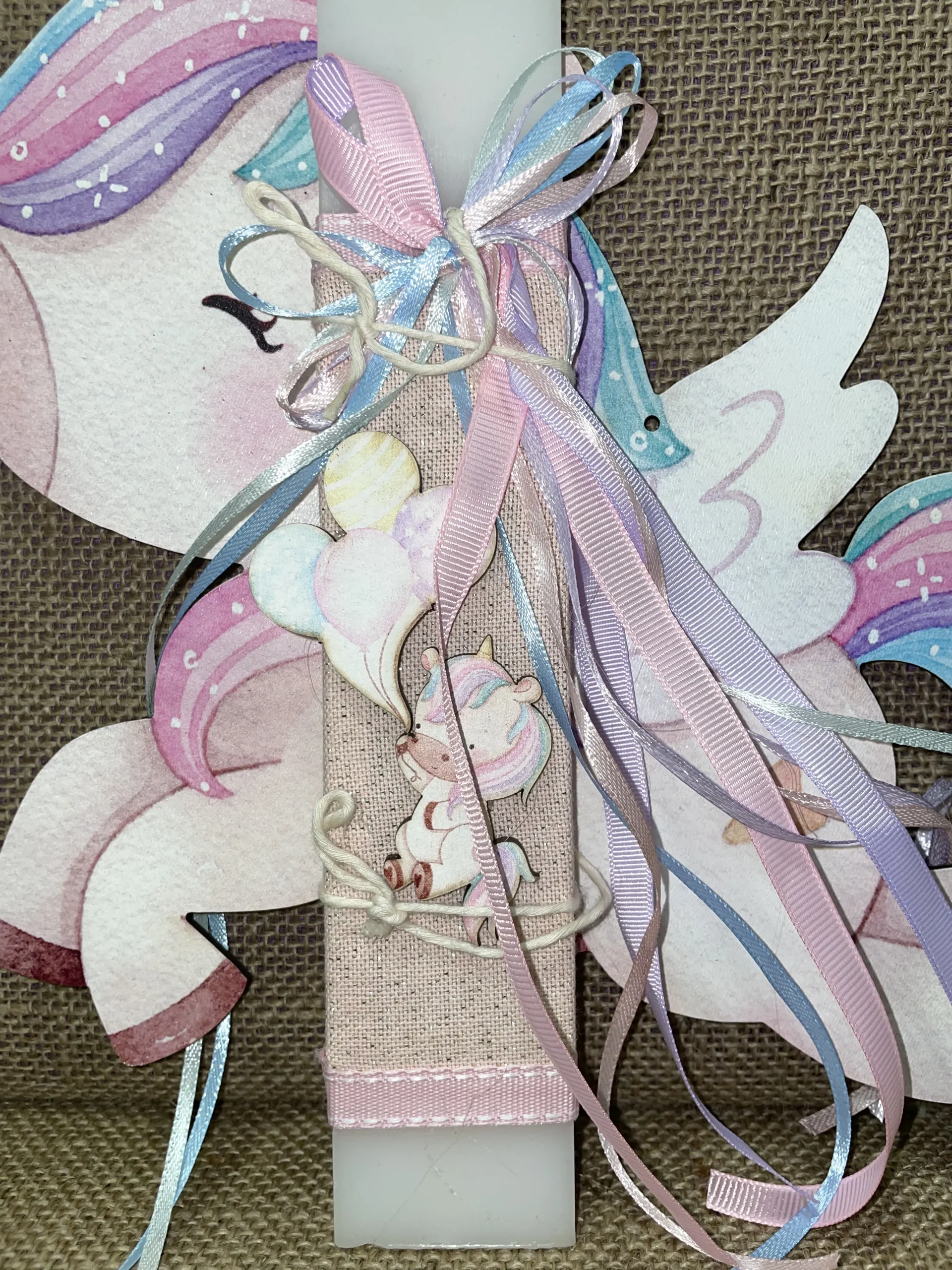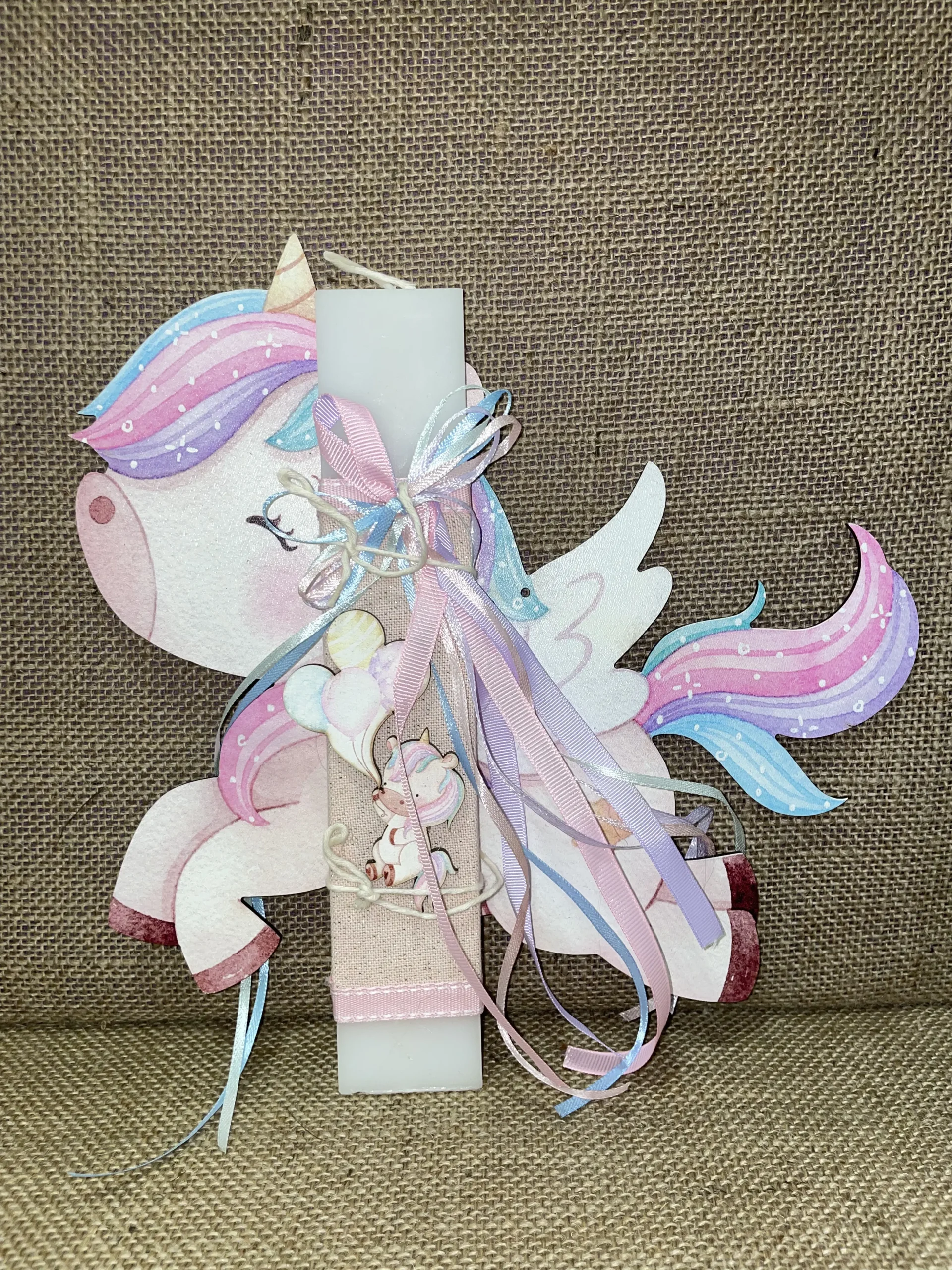 Ετικέτα: Λευκή πλακέ λαμπάδα με ξύλινη πλάτη μικρό μονόκερο