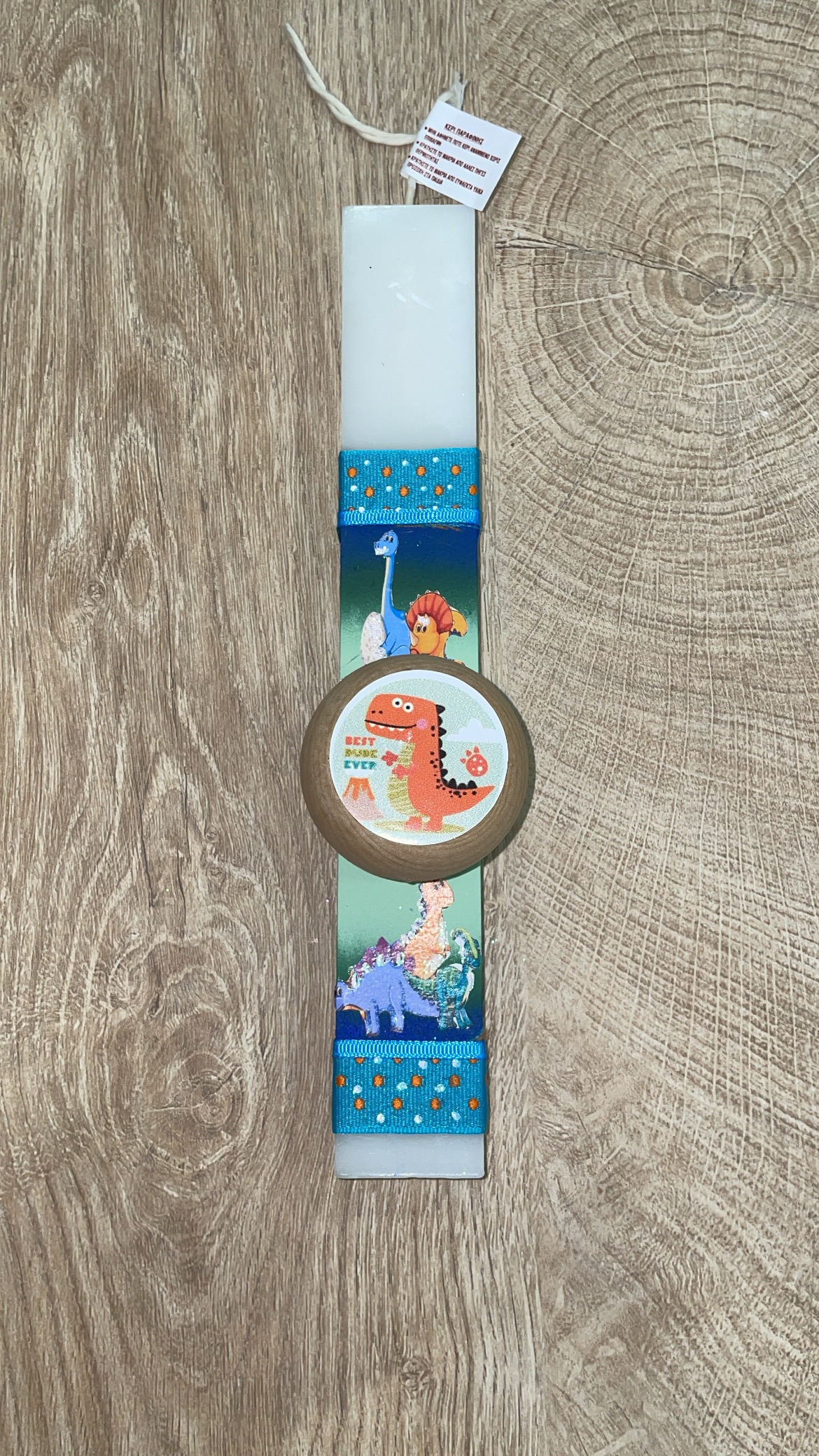 Tag: Λευκή πλακέ λαμπάδα με ξύλινο γιογιό με γαλάζιο δεινοσαυράκι