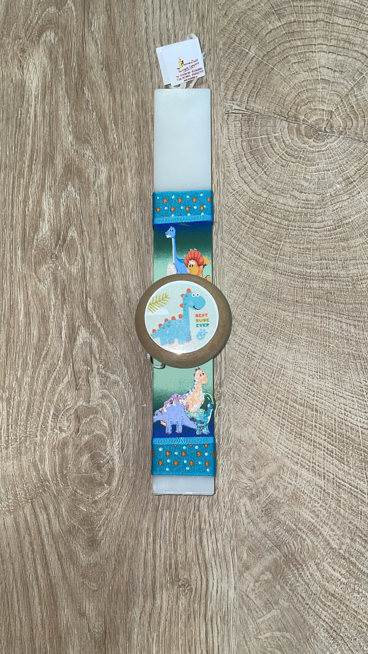 Λευκή πλακέ λαμπάδα με ξύλινο γιογιό με γαλάζιο δεινοσαυράκι