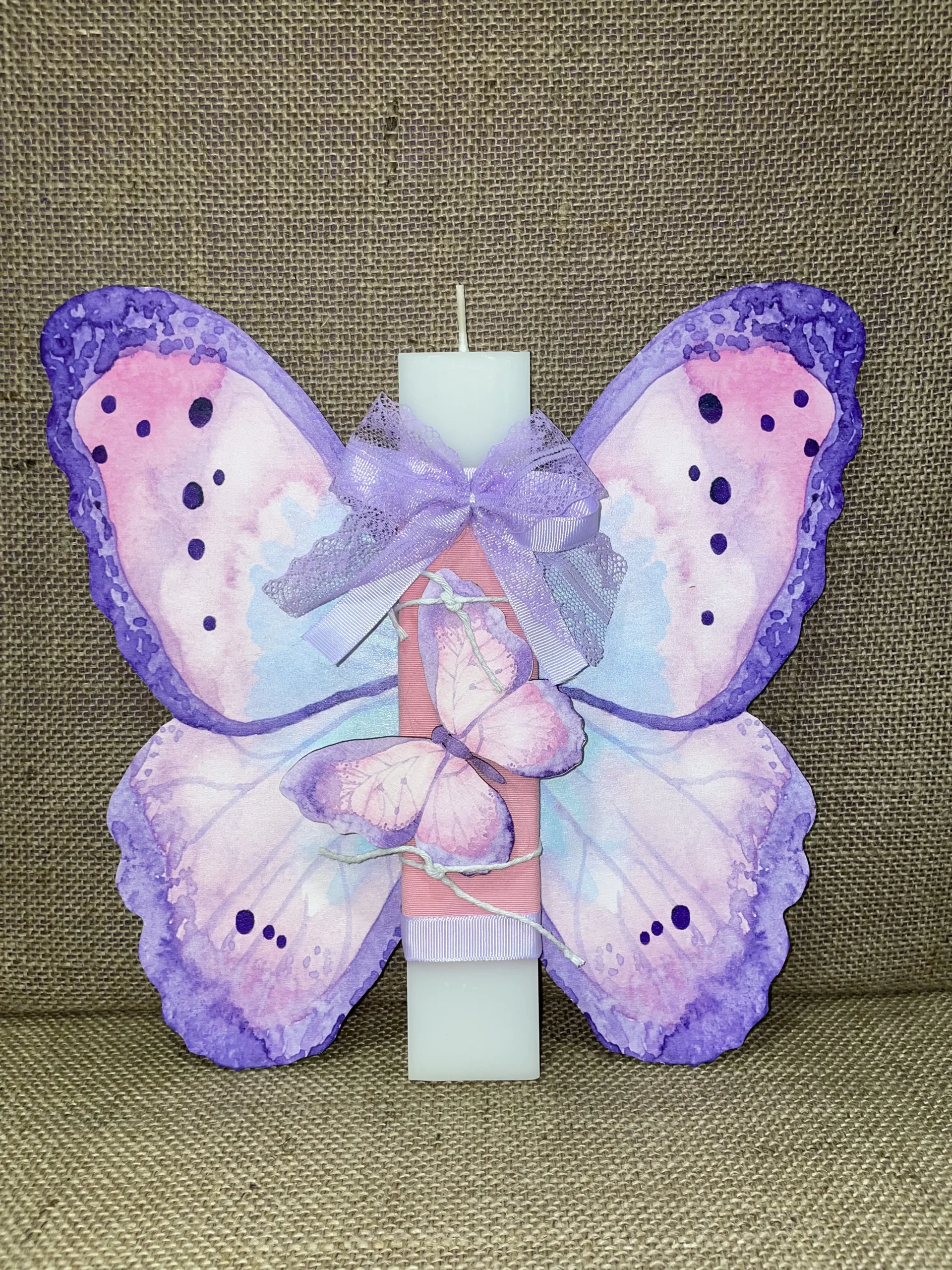 Ετικέτα: Λευκή πλακέ λαμπάδα με πεταλουδίτσα και πλάτη ξύλινη πεταλούδα