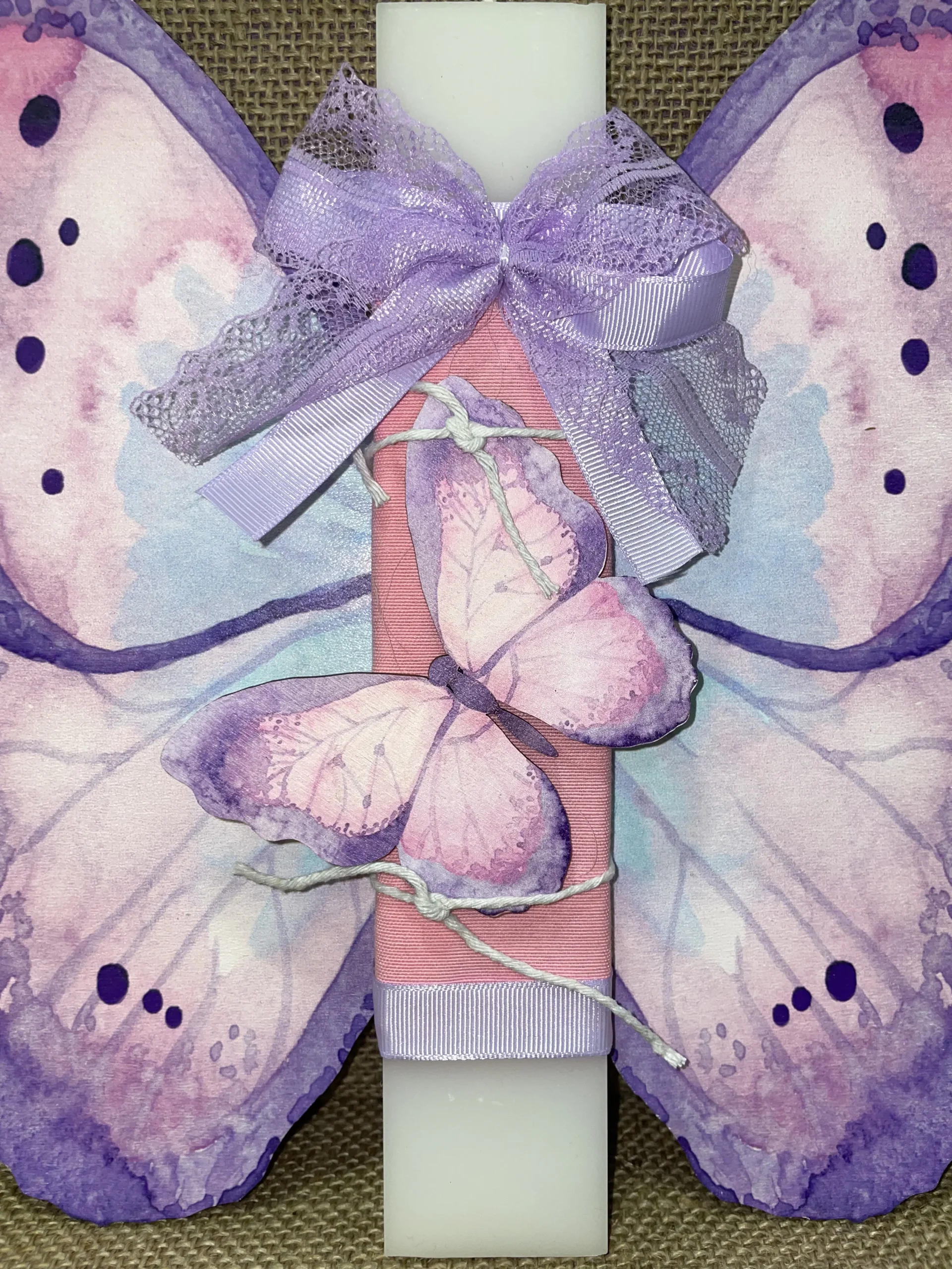 Λευκή πλακέ λαμπάδα με πεταλουδίτσα και πλάτη ξύλινη πεταλούδα για να την κρεμάσετε στο δωμάτιο σας!