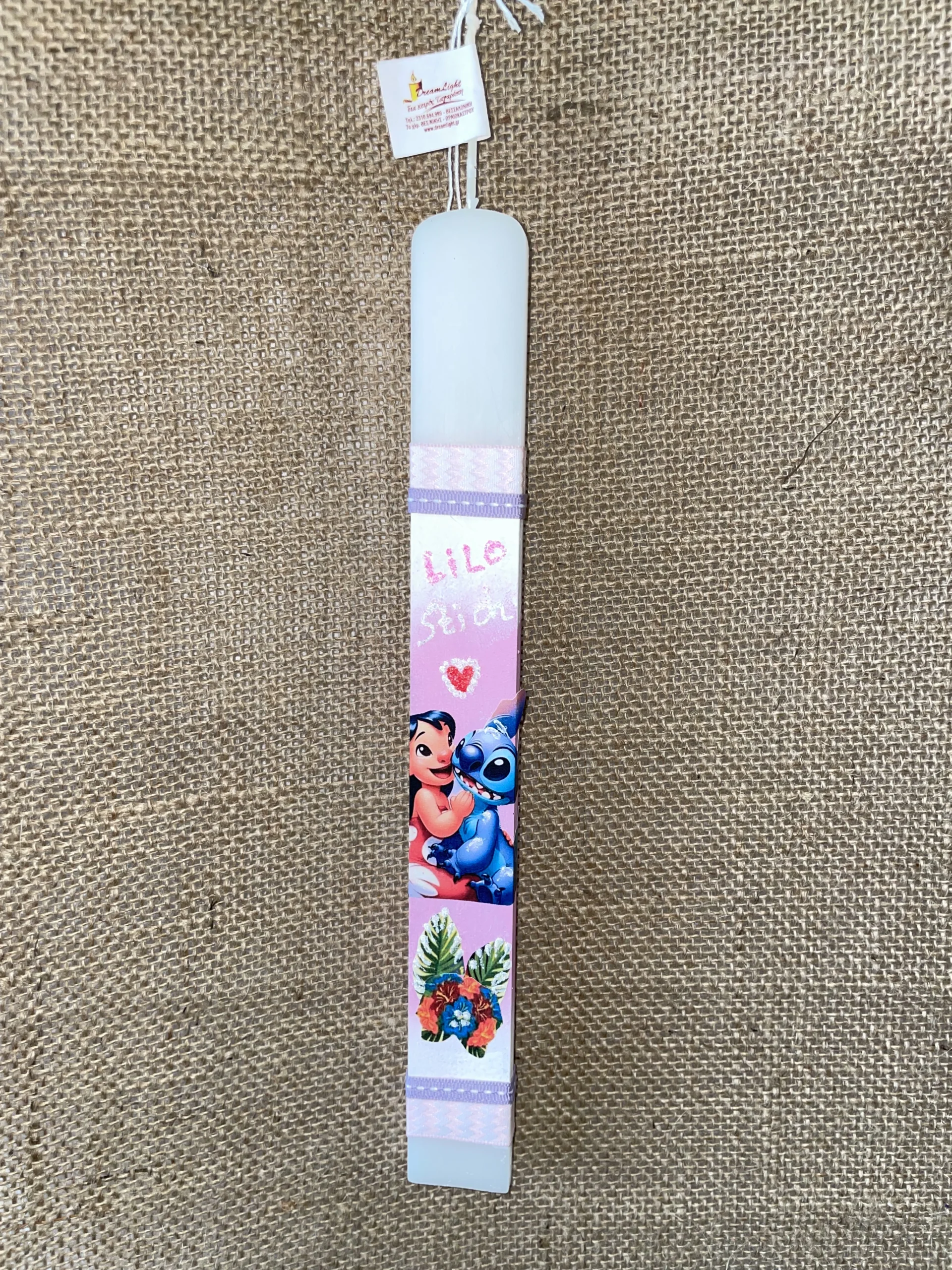 Ετικέτα: Λευκή πλακέ λαμπάδα με ροζ ντεκουπάζ Lilo & Stitch