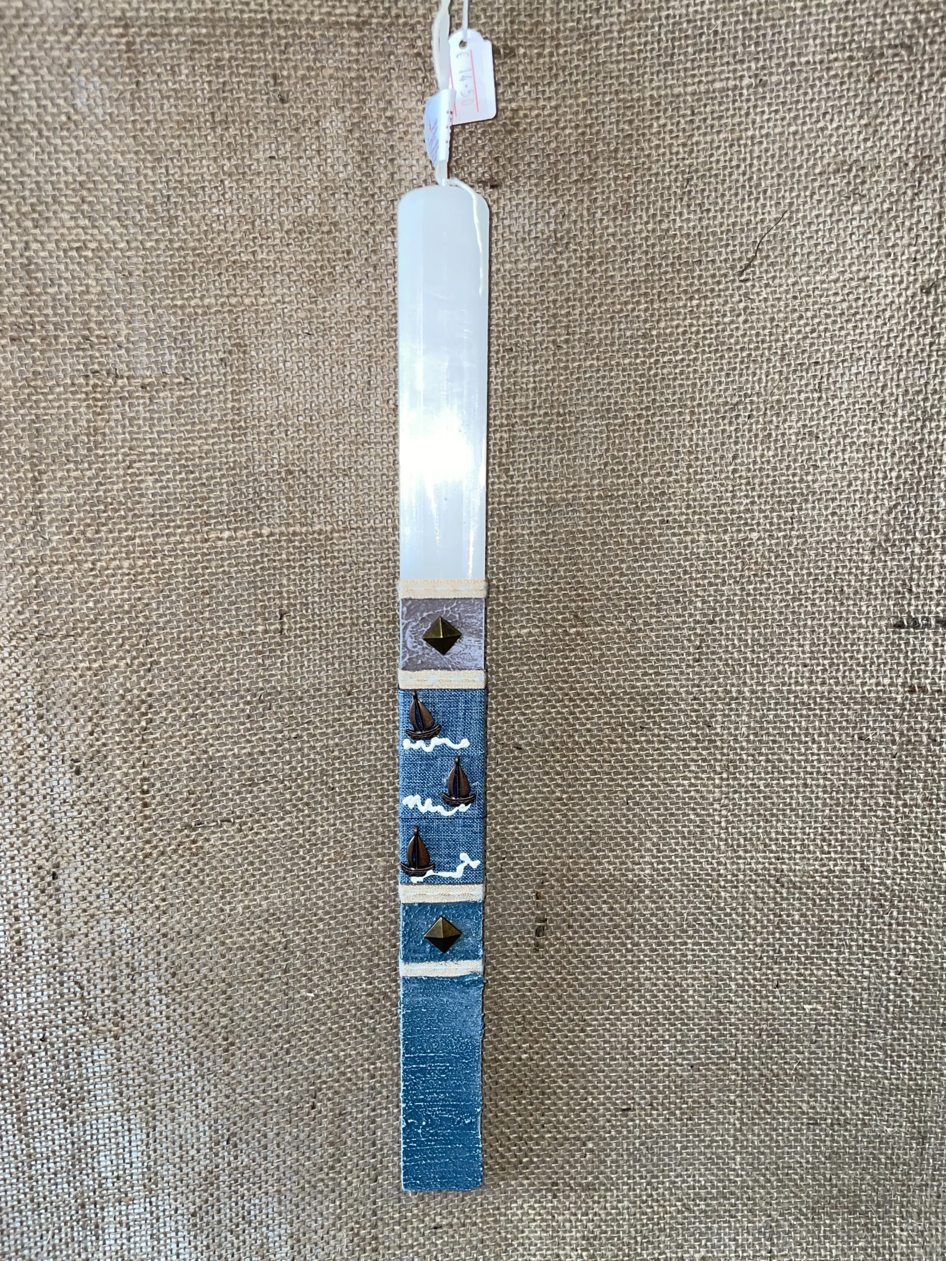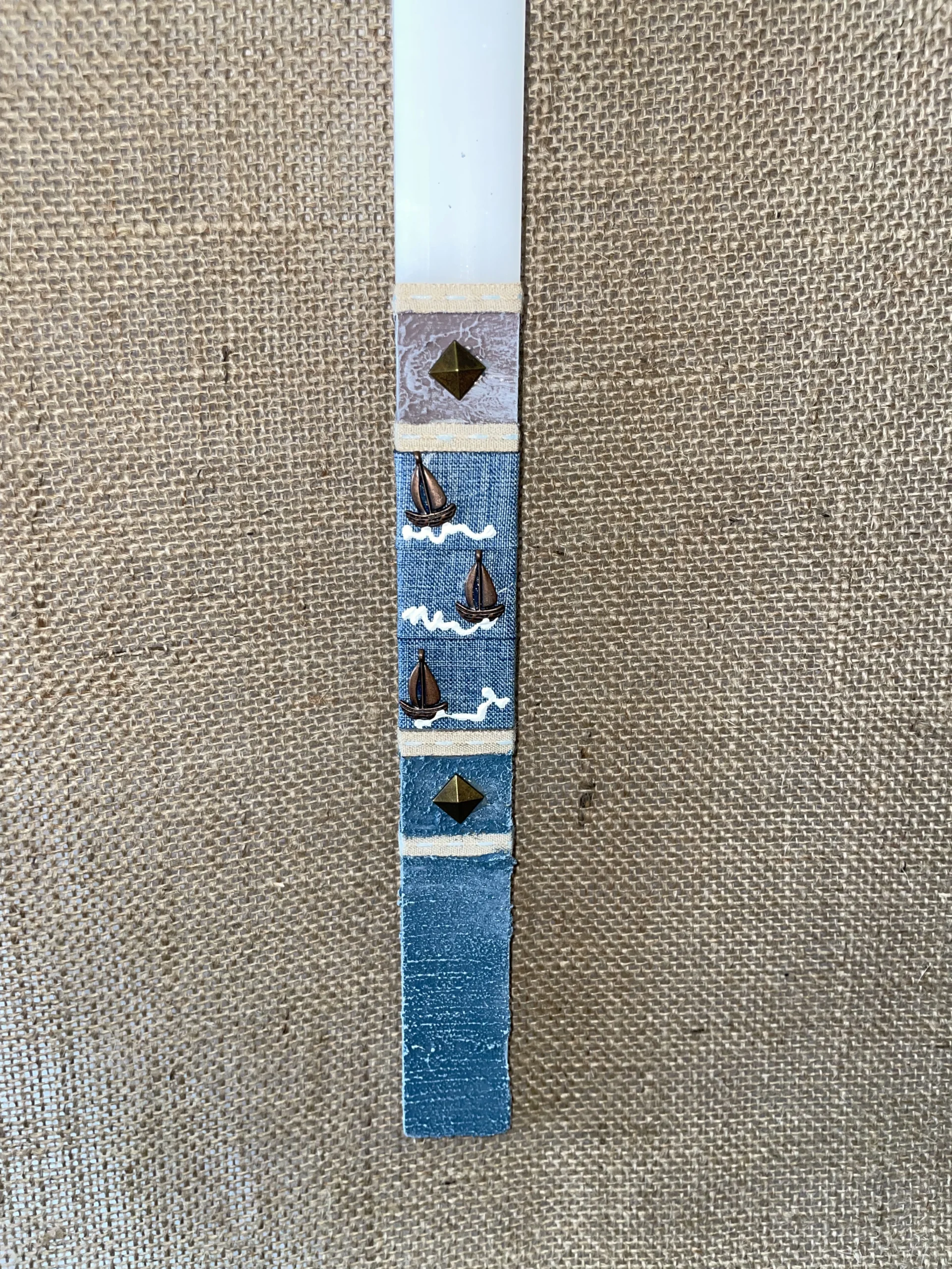 Ετικέτα: Λευκή πλακέ λαμπάδα με ''τζιν'' ύφασμα και μεταλλικά καραβάκια