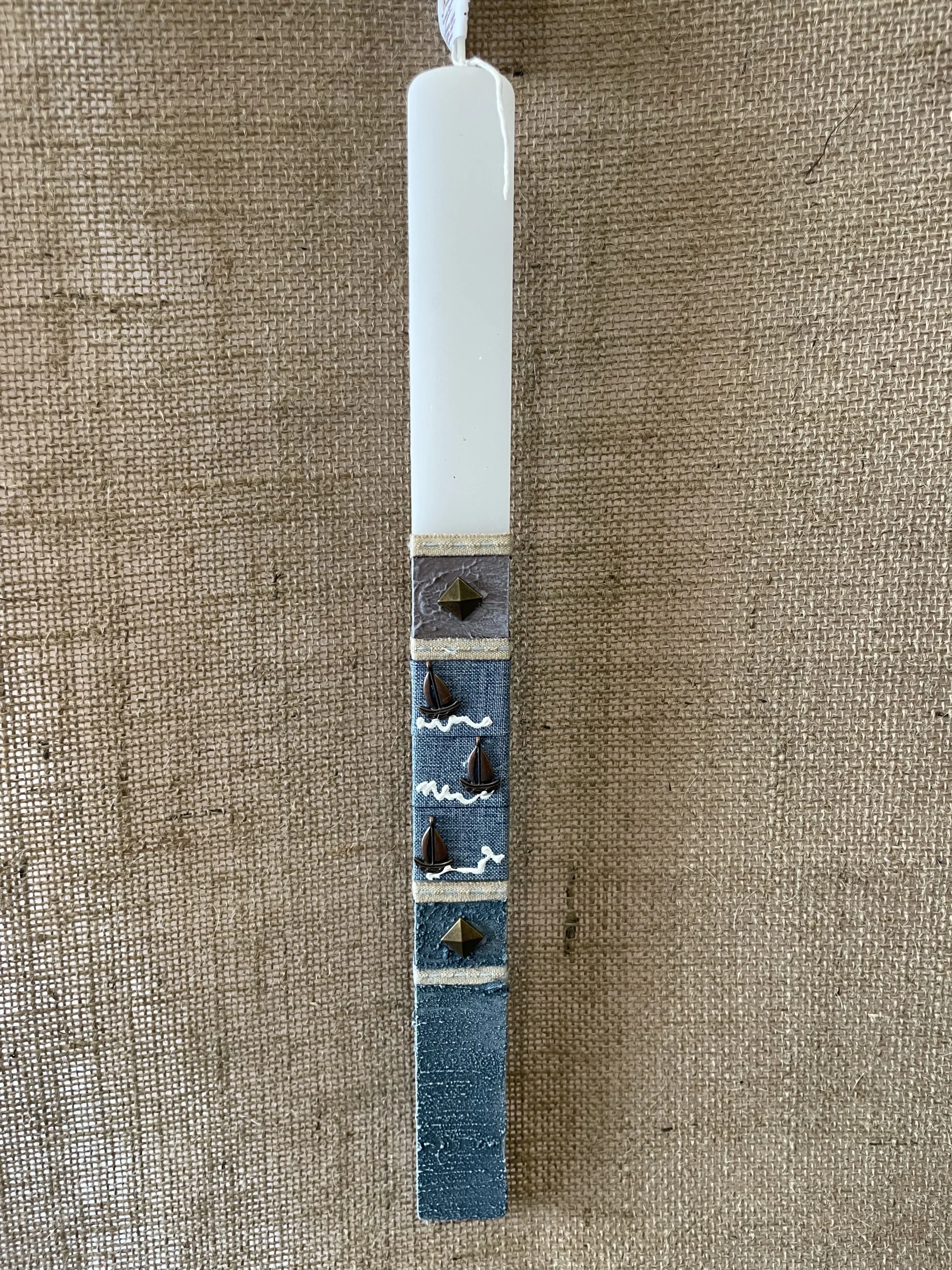 Λευκή πλακέ λαμπάδα με ”τζιν” ύφασμα και μεταλλικά καραβάκια