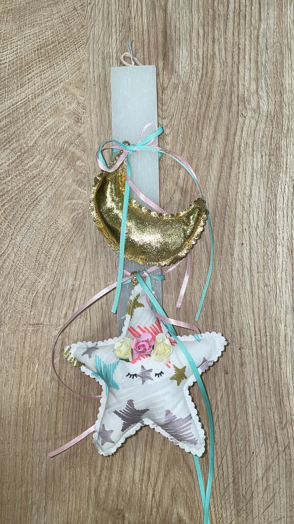 Tag: Λευκή πλακέ λαμπάδα με υφασμάτινο αστέρι και φεγγάρι