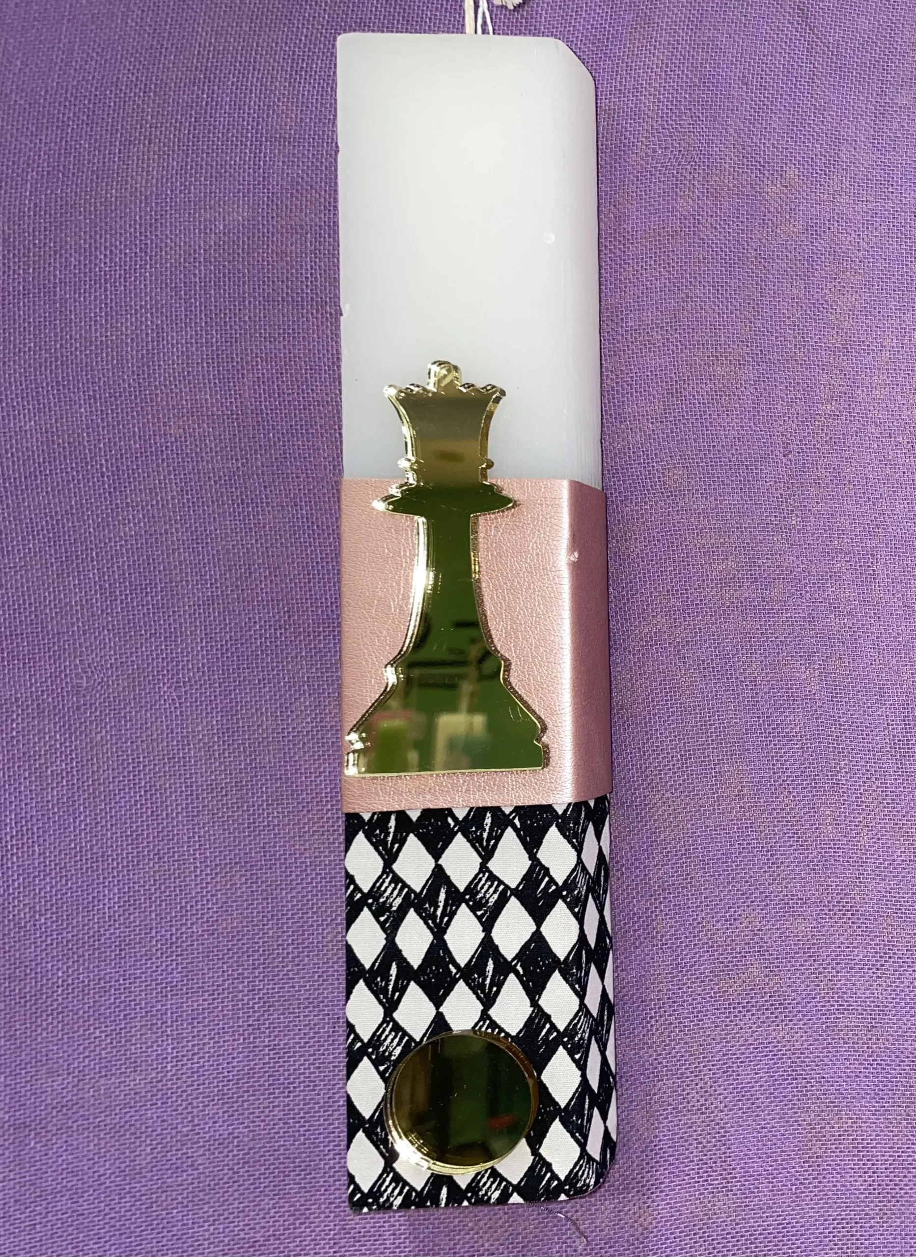 Ετικέτα: Λευκή πλακέ λαμπάδα με χρυσό plexiglass πιόνι σκακιού
