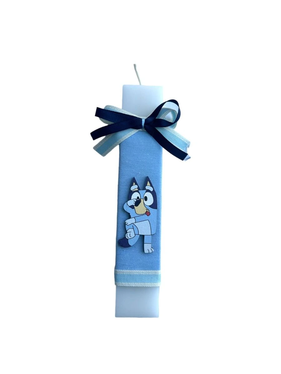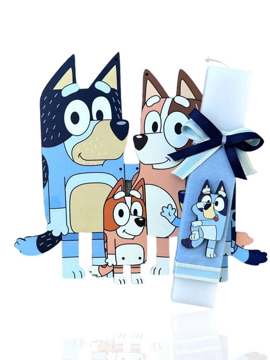 Ετικέτα: Λευκή πλακέ λαμπάδα με Bluey και ξύλινη πλάτη με οικογένεια Bluey