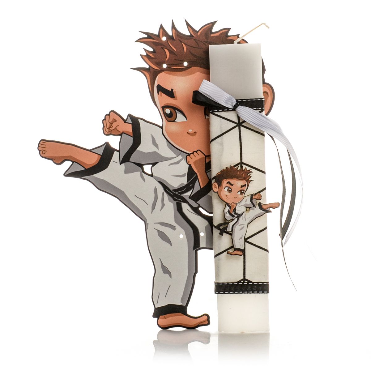 Ετικέτες: karate boy, Λευκή πλακέ λαμπάδα με Karate Boy, με ξύλινη πλάτη, πασχαλινή λαμπάδα