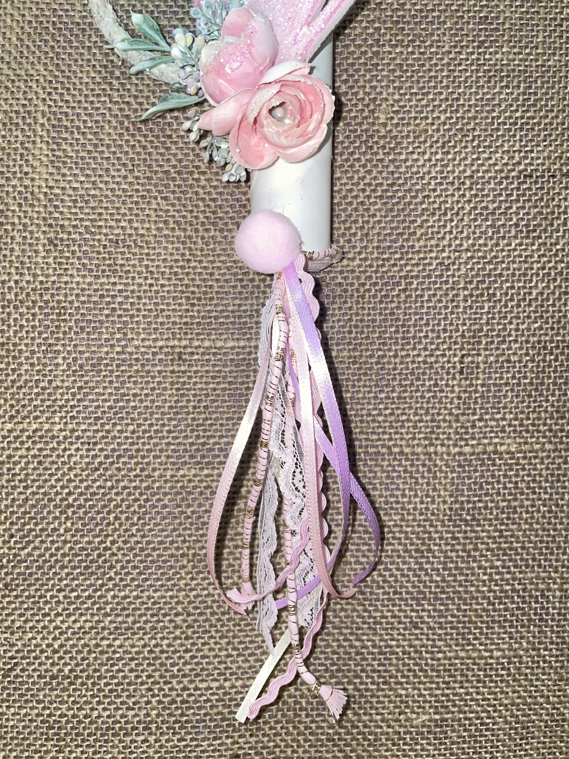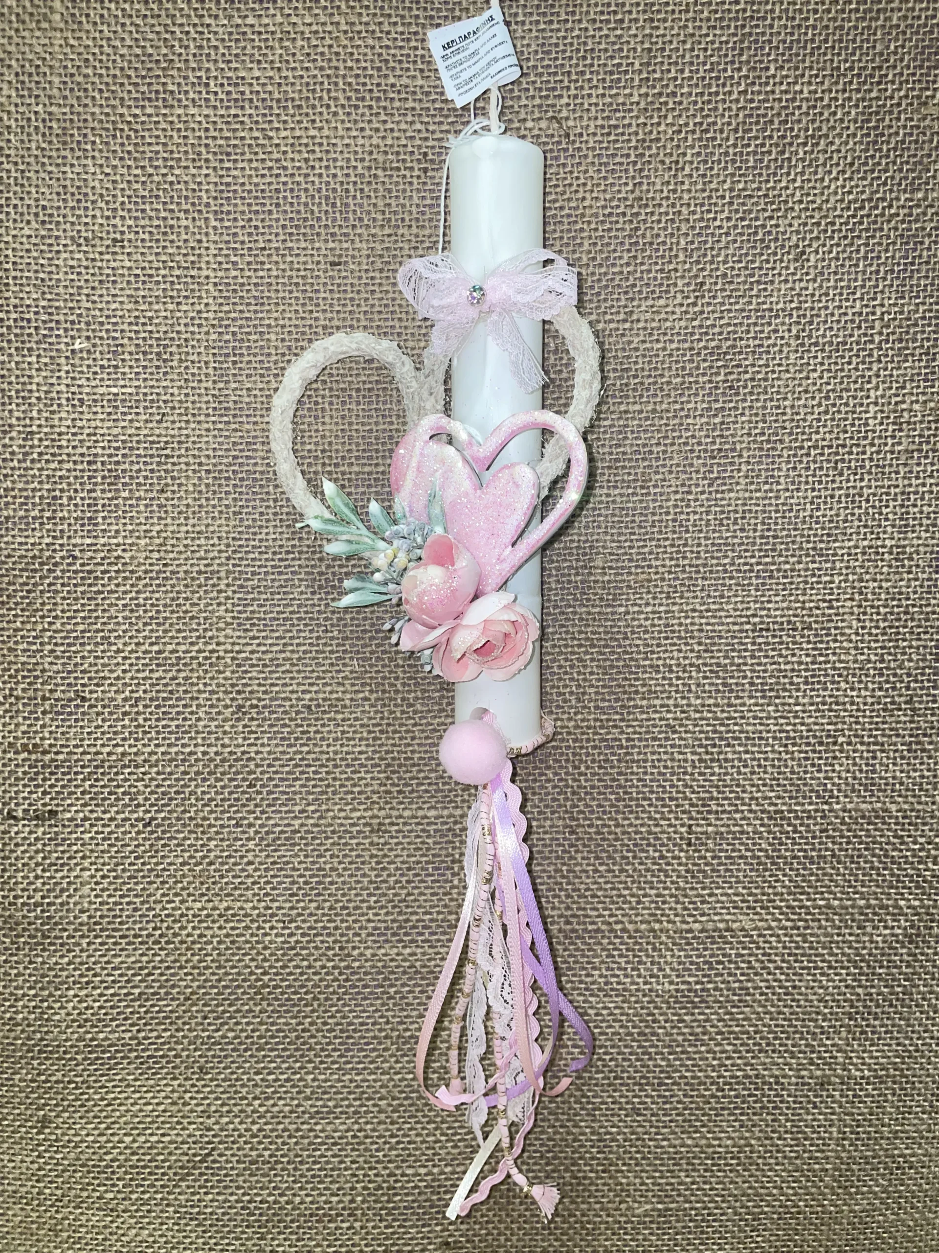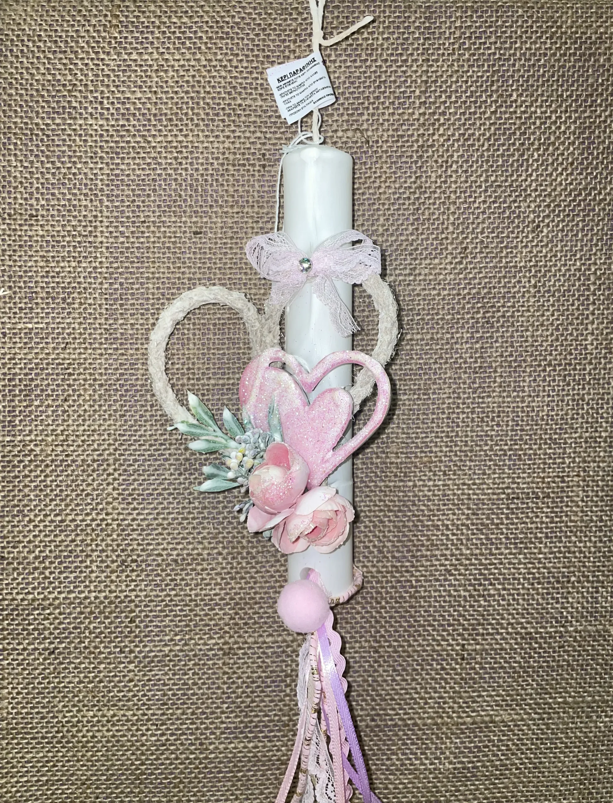 Λευκή στρογγυλή αρωματική λαμπάδα με ροζ καρδιά από σχοινί και ροζ λουλούδια