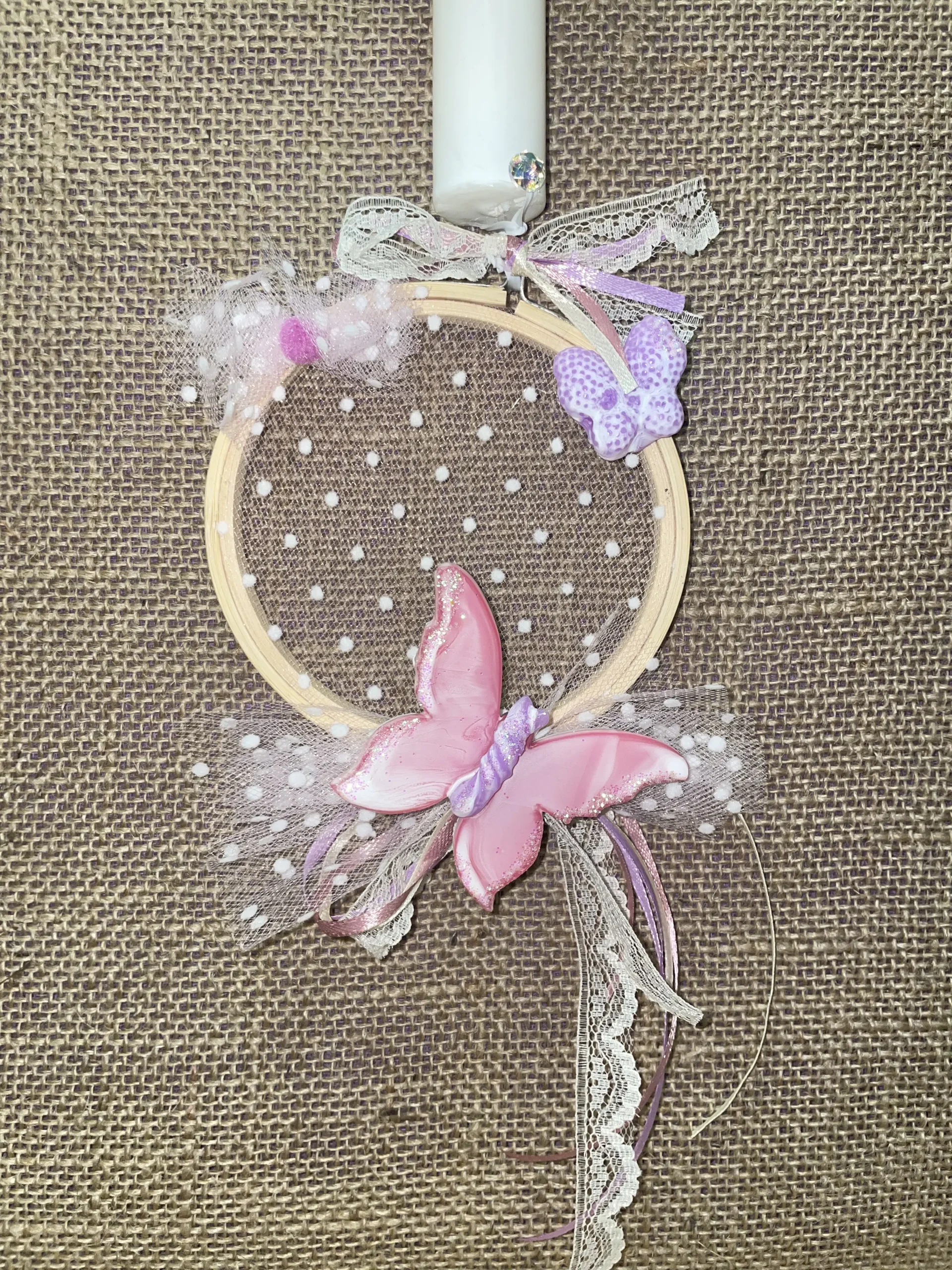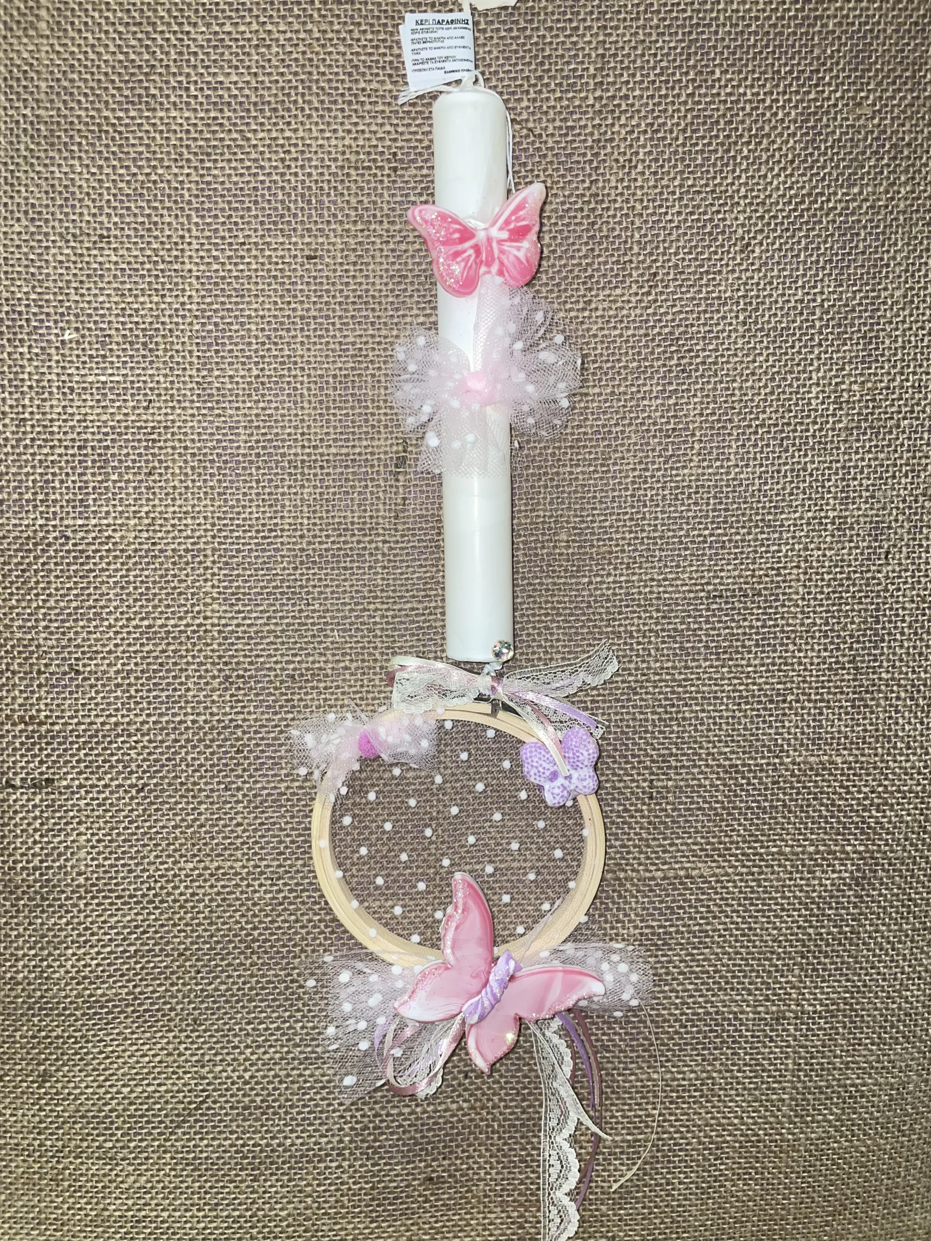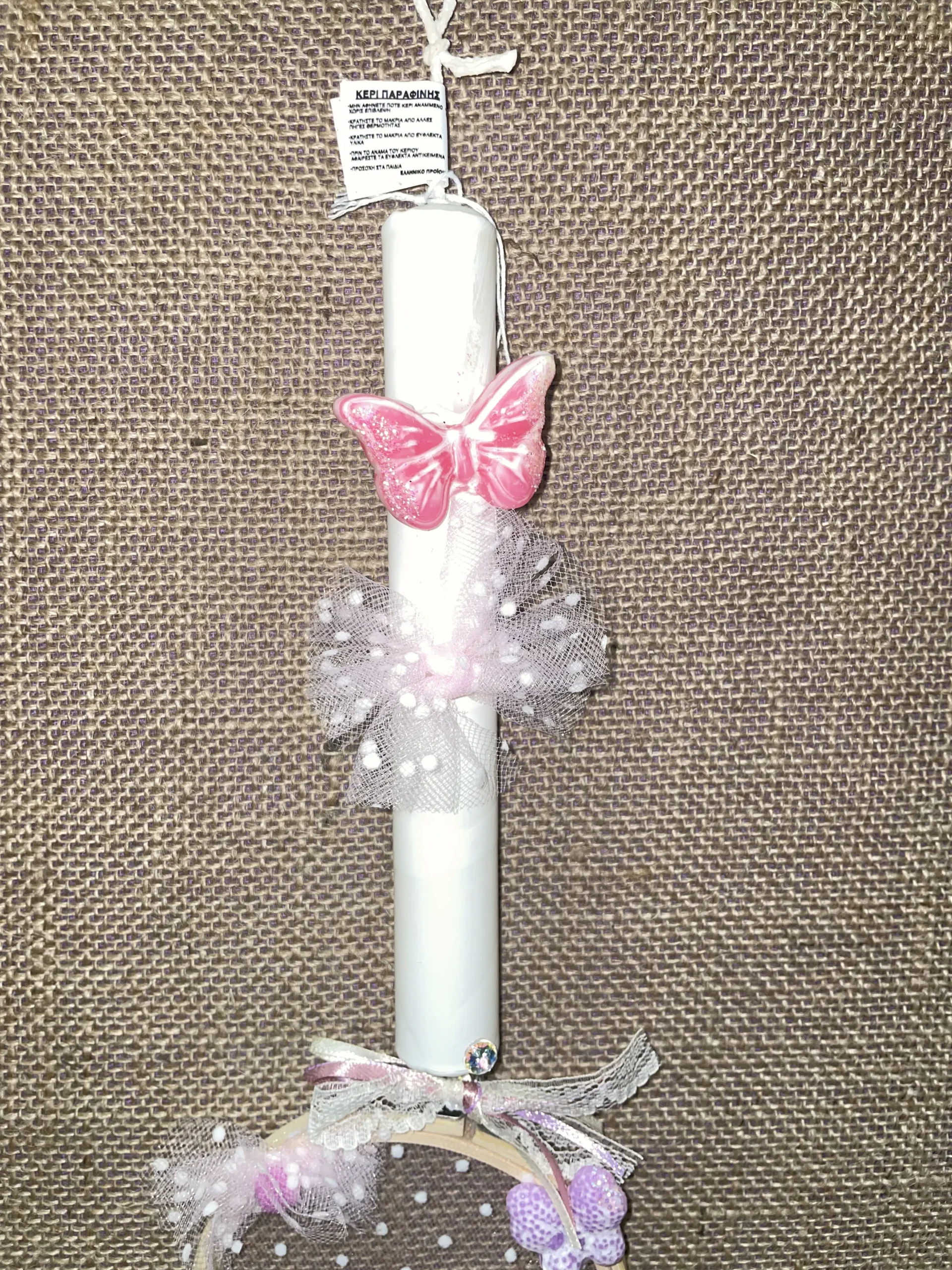 Ετικέτα: Λευκή στρογγυλή αρωματική λαμπάδα με ξύλινο τελάρο και δύο φούξια πεταλούδες