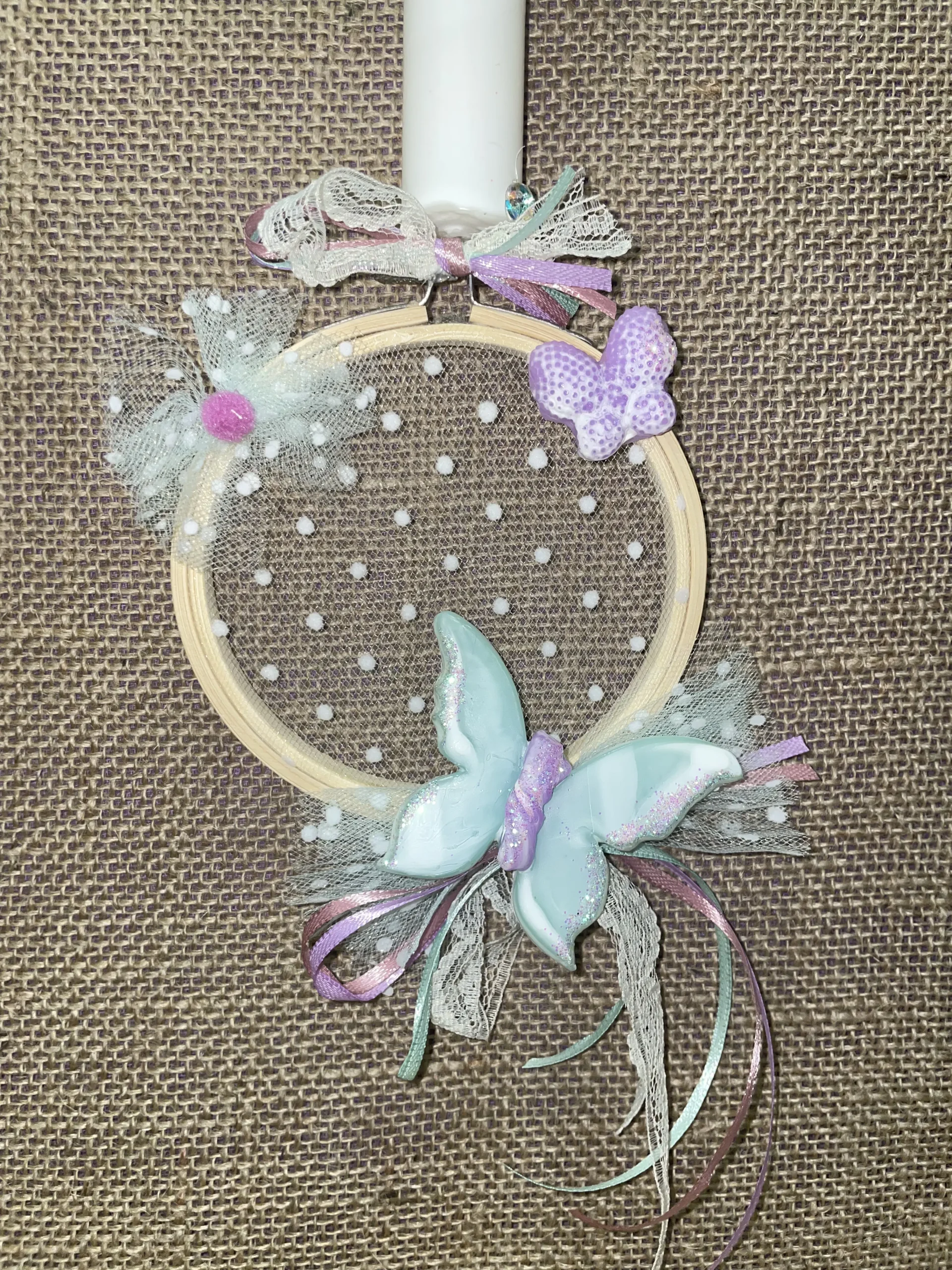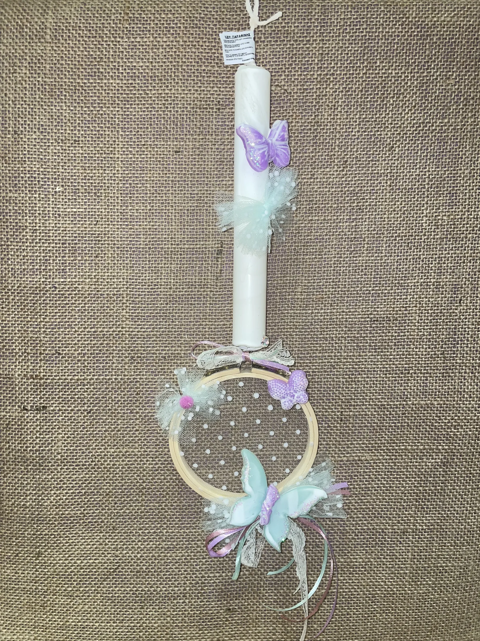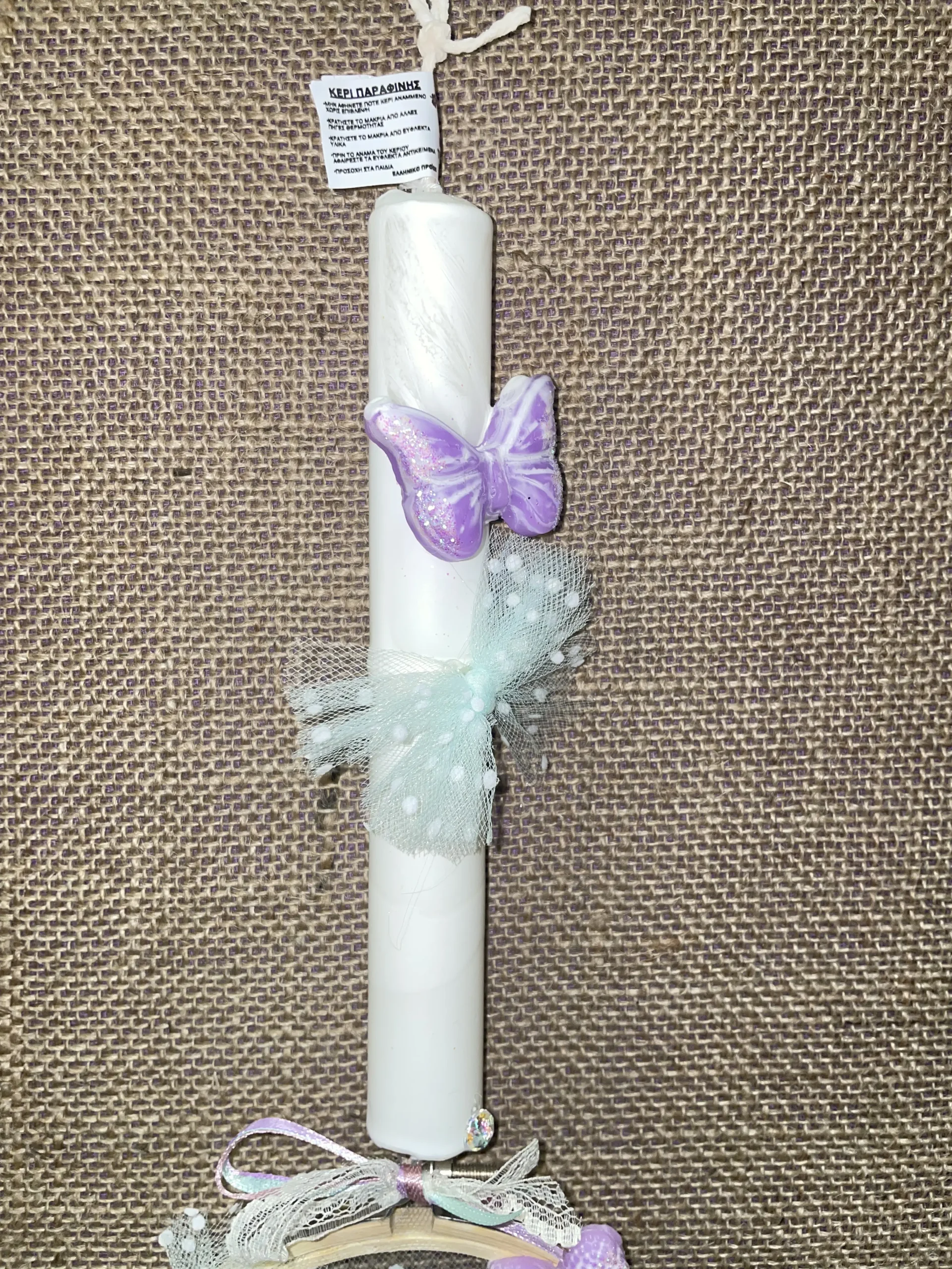 Λευκή στρογγυλή αρωματική λαμπάδα με ξύλινο τελάρο και μωβ και μέντα πεταλούδα