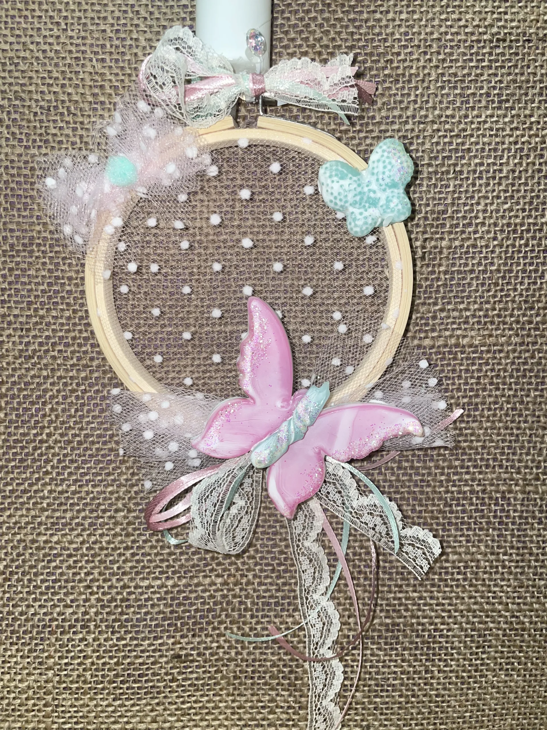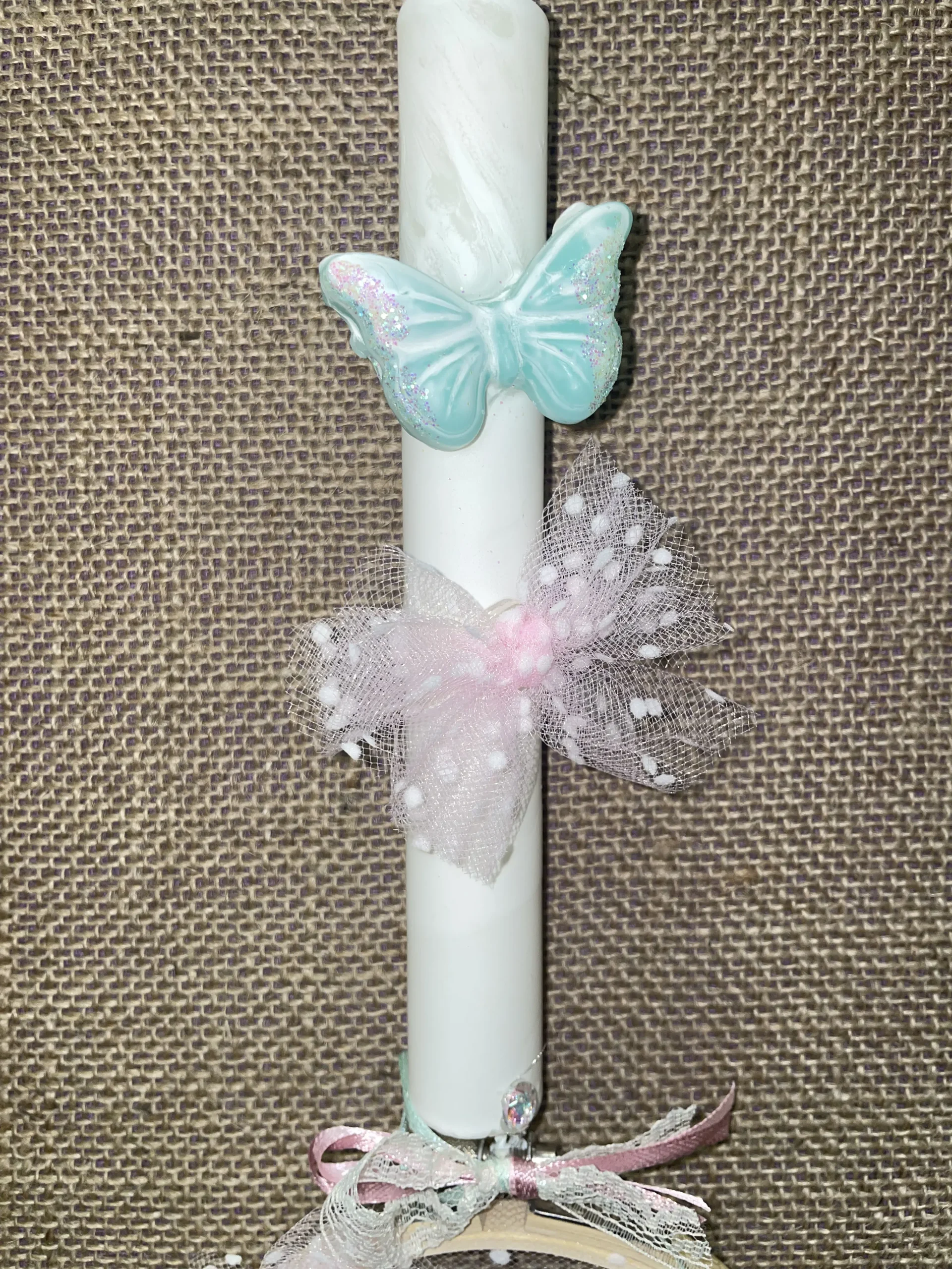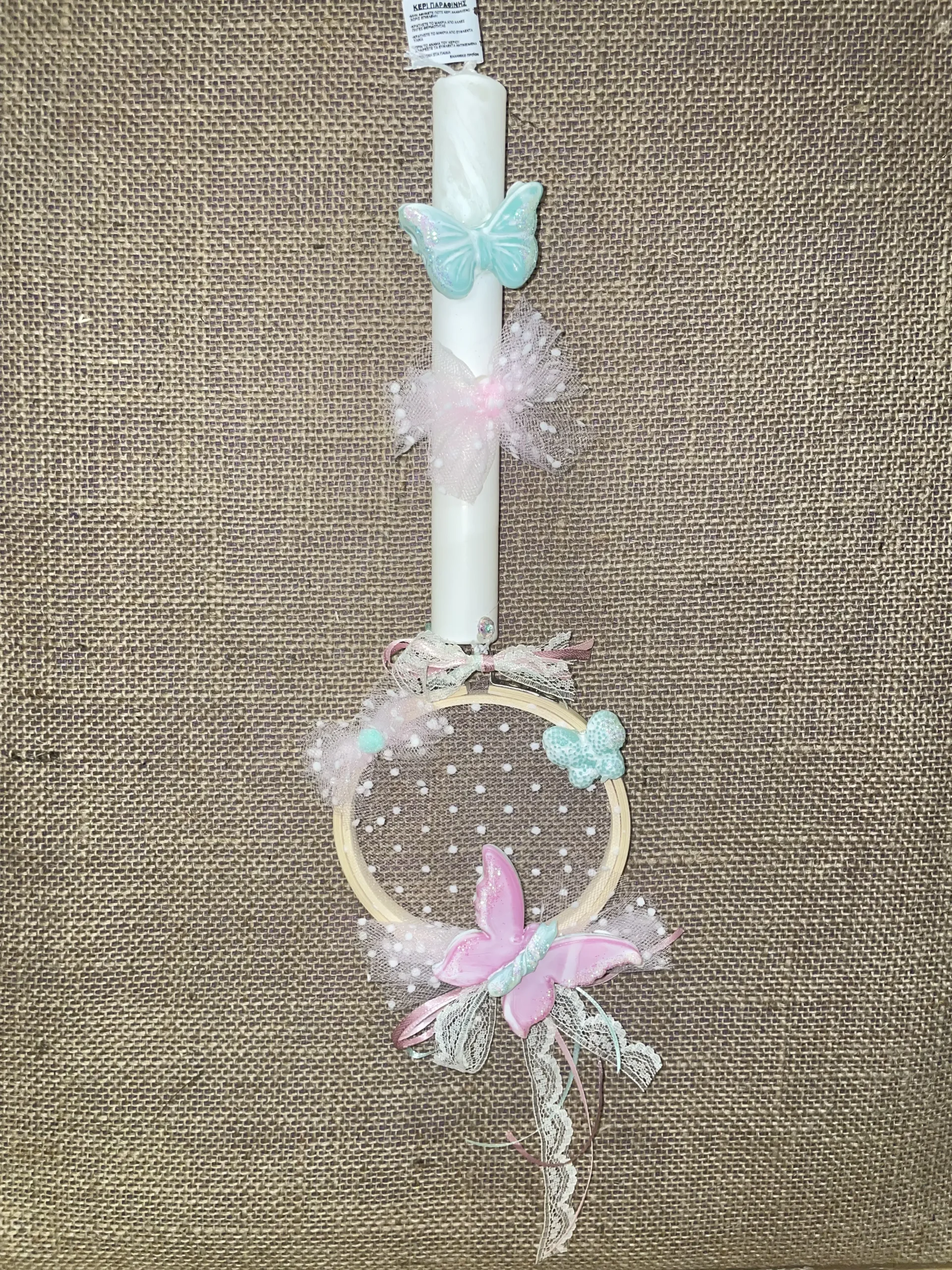 Λευκή στρογγυλή αρωματική λαμπάδα με ξύλινο τελάρο και μέντα και ροζ πεταλούδα