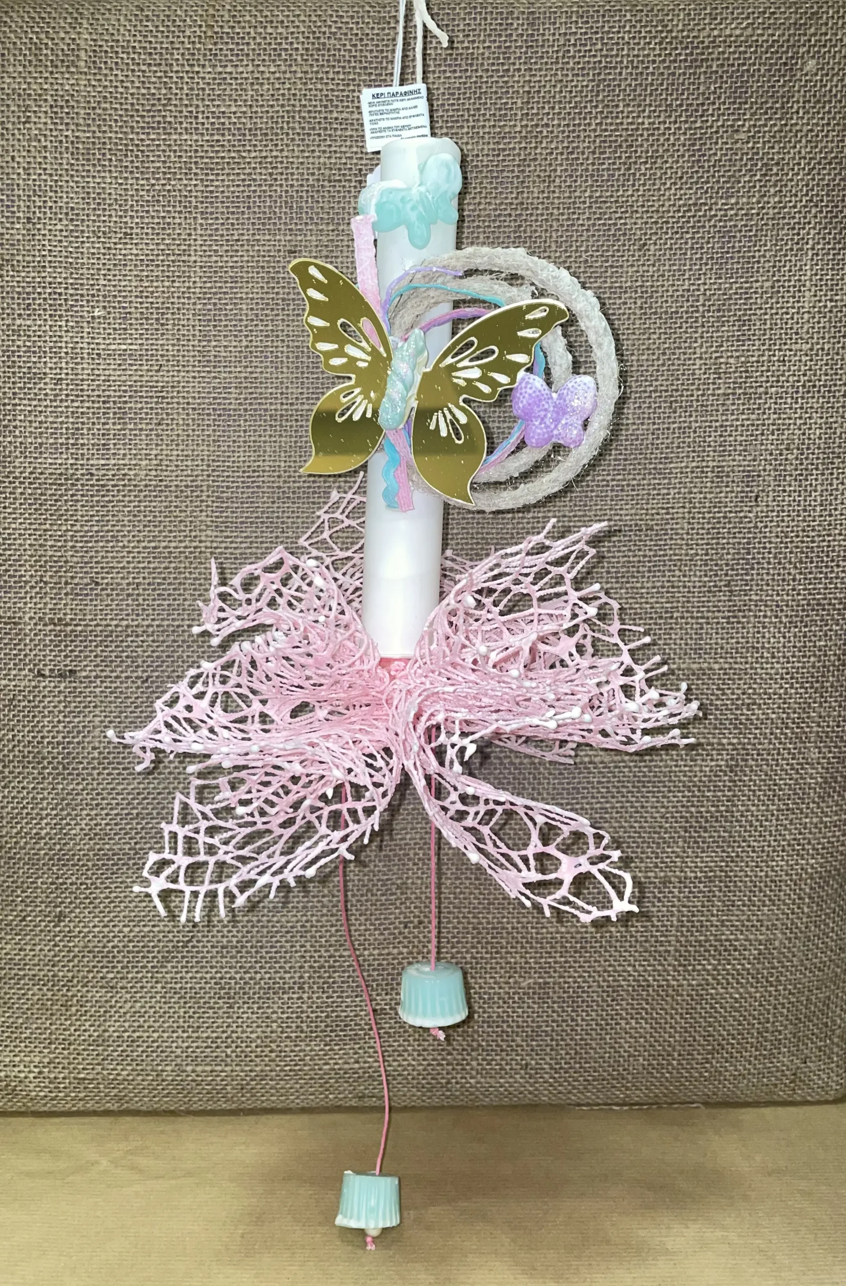 Ετικέτα: Λευκή στρογγυλή λαμπάδα αρωματική με plexiglass πεταλούδα και μέντα και μωβ κέρινη πεταλούδα