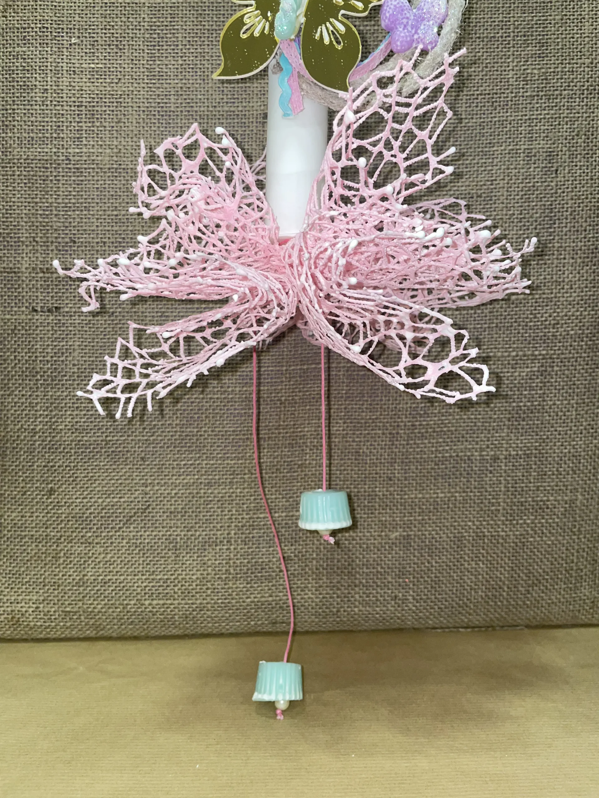 Λευκή στρογγυλή λαμπάδα αρωματική με plexiglass πεταλούδα και μέντα και μωβ κέρινη πεταλούδα