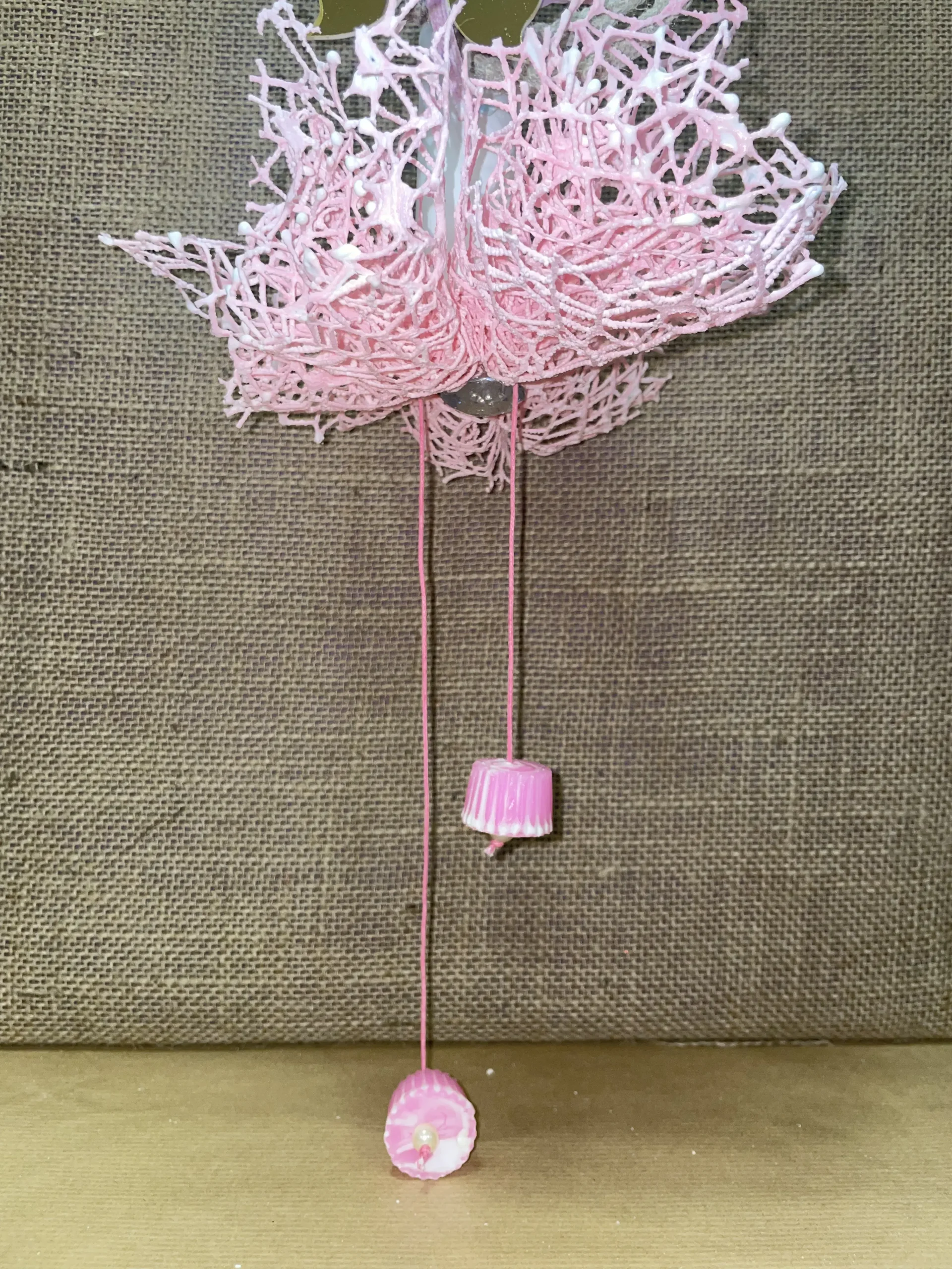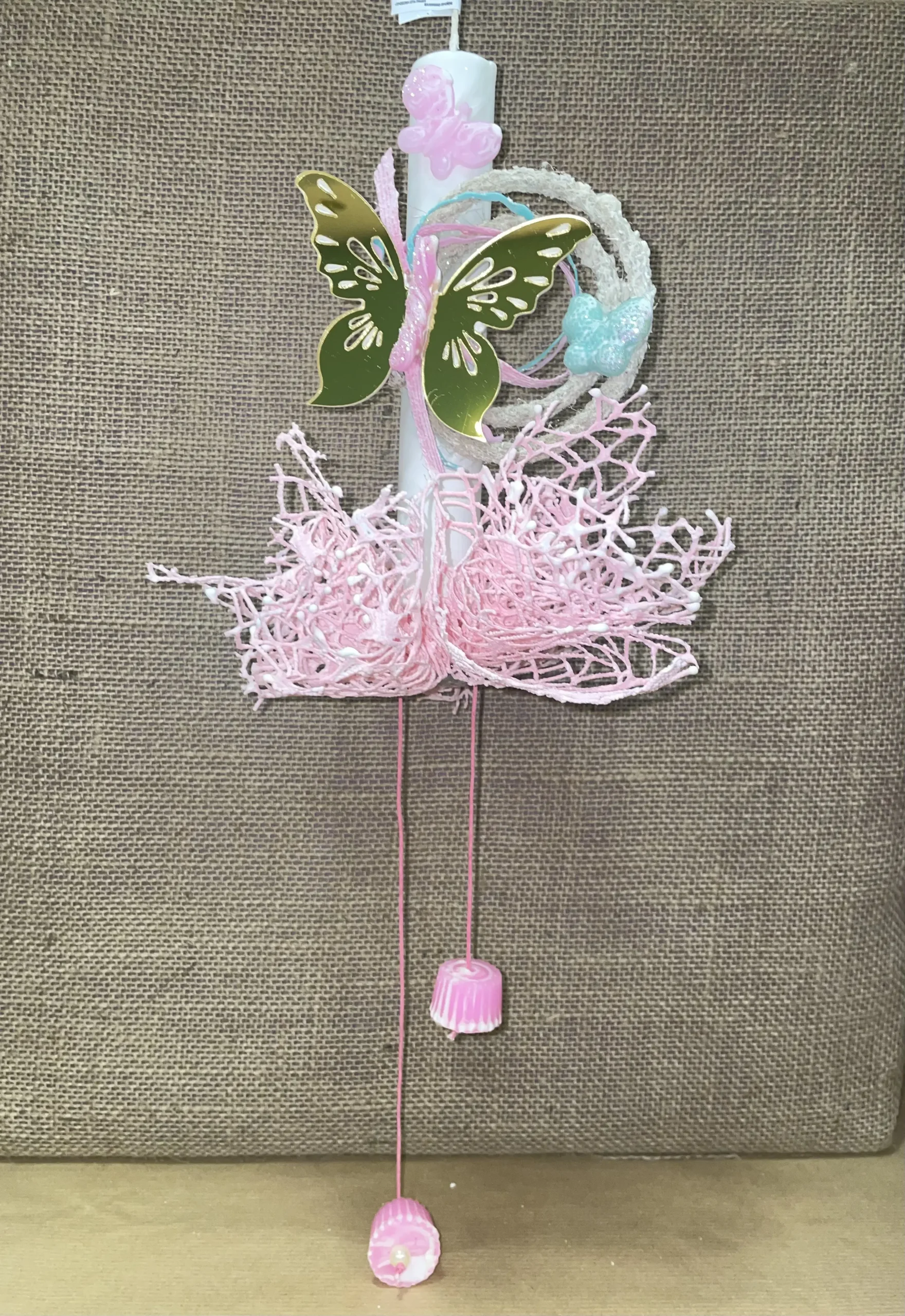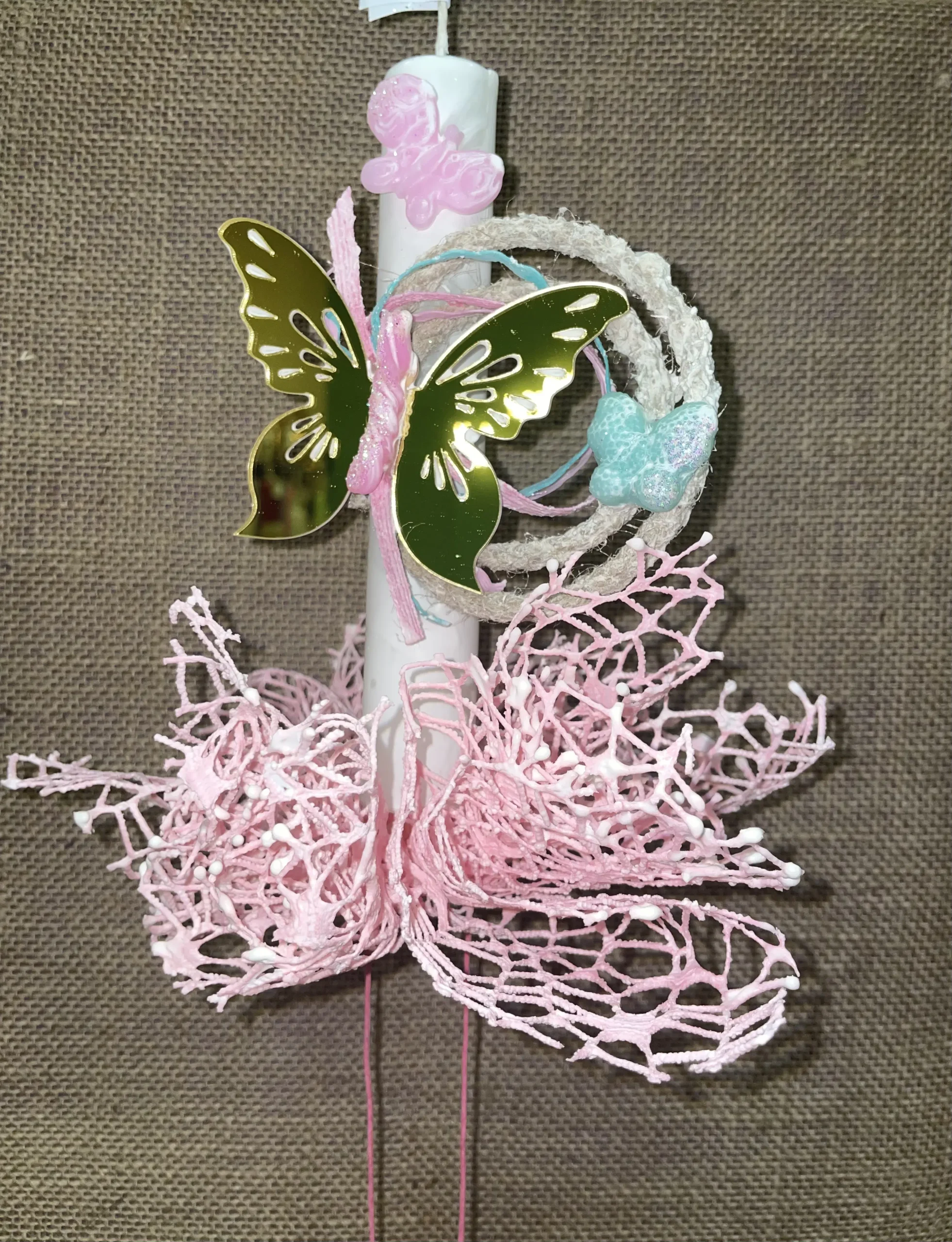 Λευκή στρογγυλή λαμπάδα αρωματική με plexiglass πεταλούδα και ροζ και μέντα κέρινη πεταλούδα