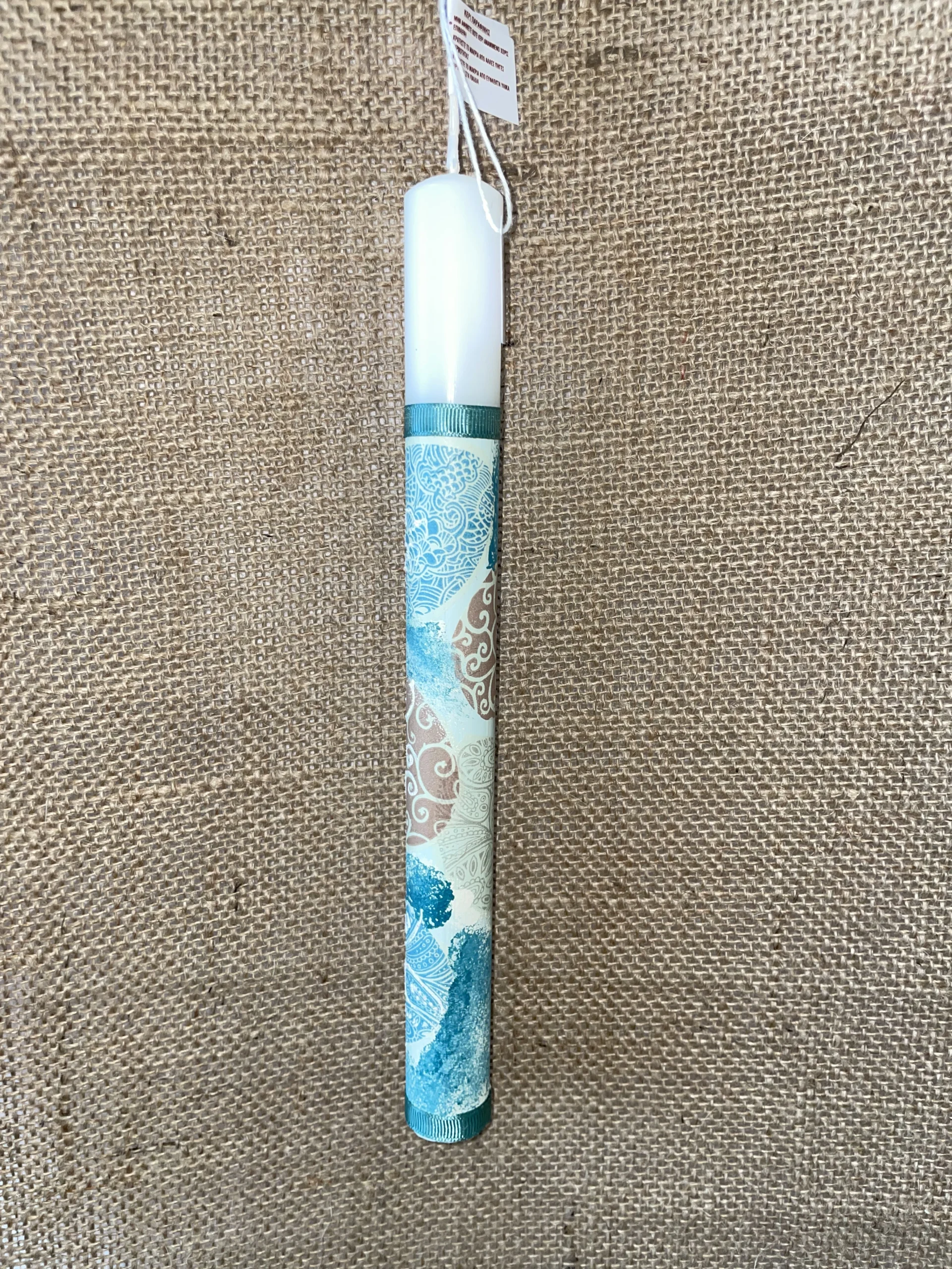 Λευκή στρογγυλή λαμπάδα με γαλάζιο φόντο με γεωμετρικά σχέδια