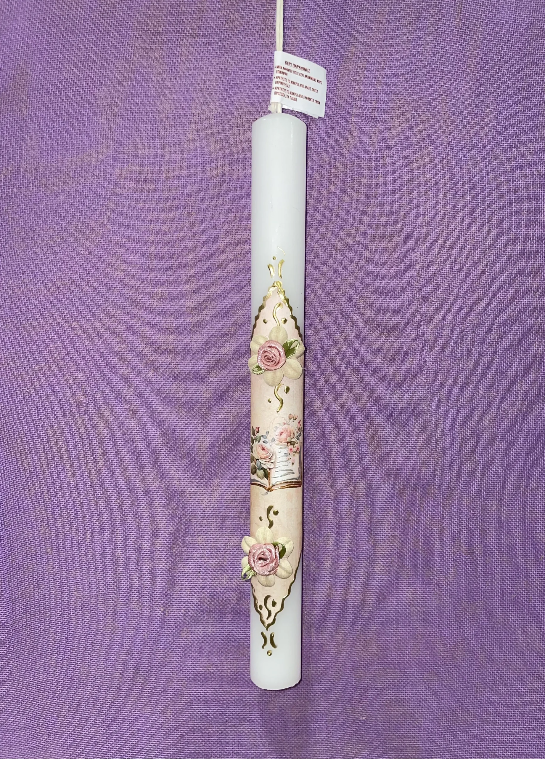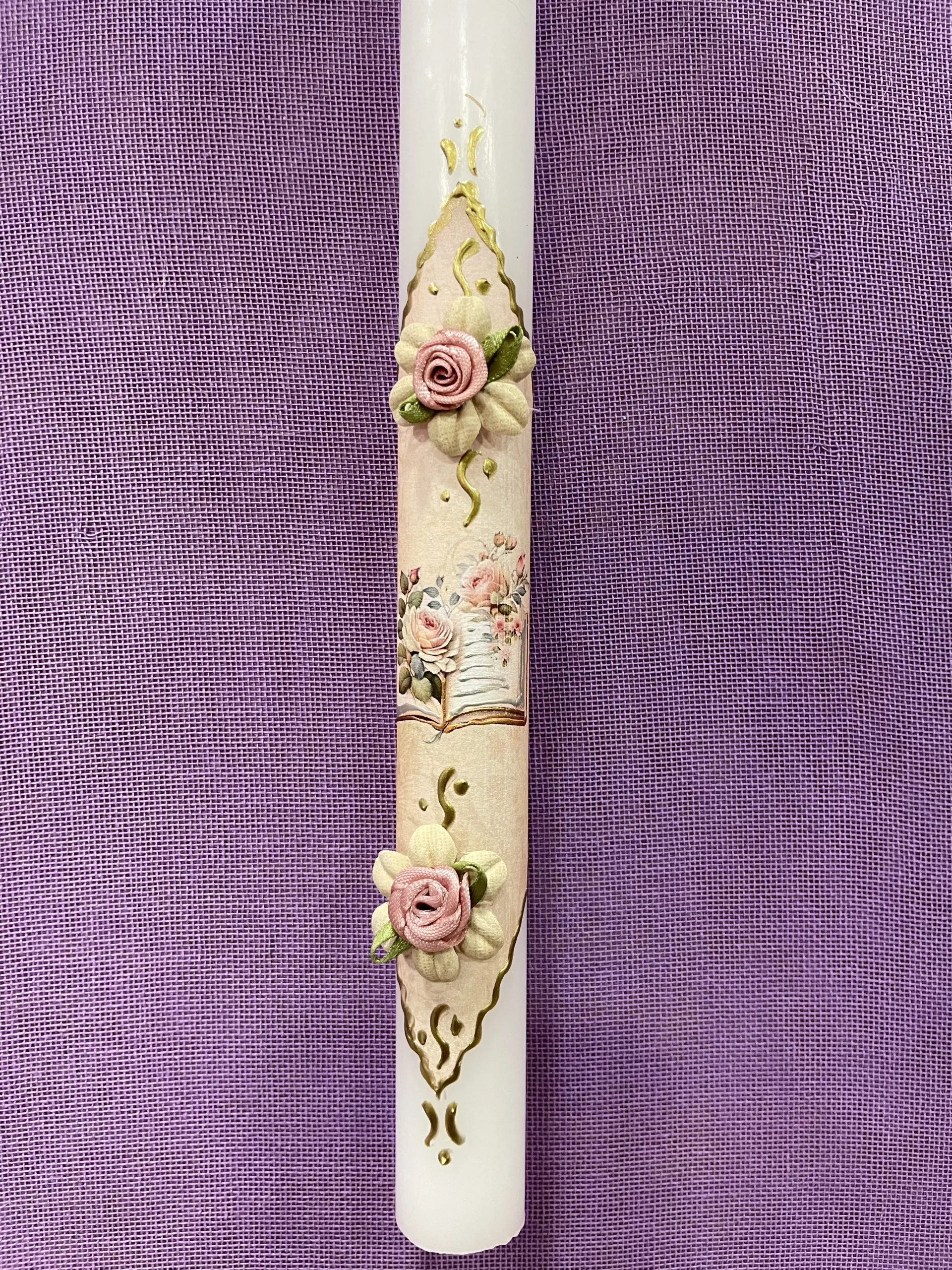 Ετικέτα: Λευκή στρογγυλή λαμπάδα με εκρού ζωγραφισμένο βιβλίο και ροζ τριαντάφυλλα