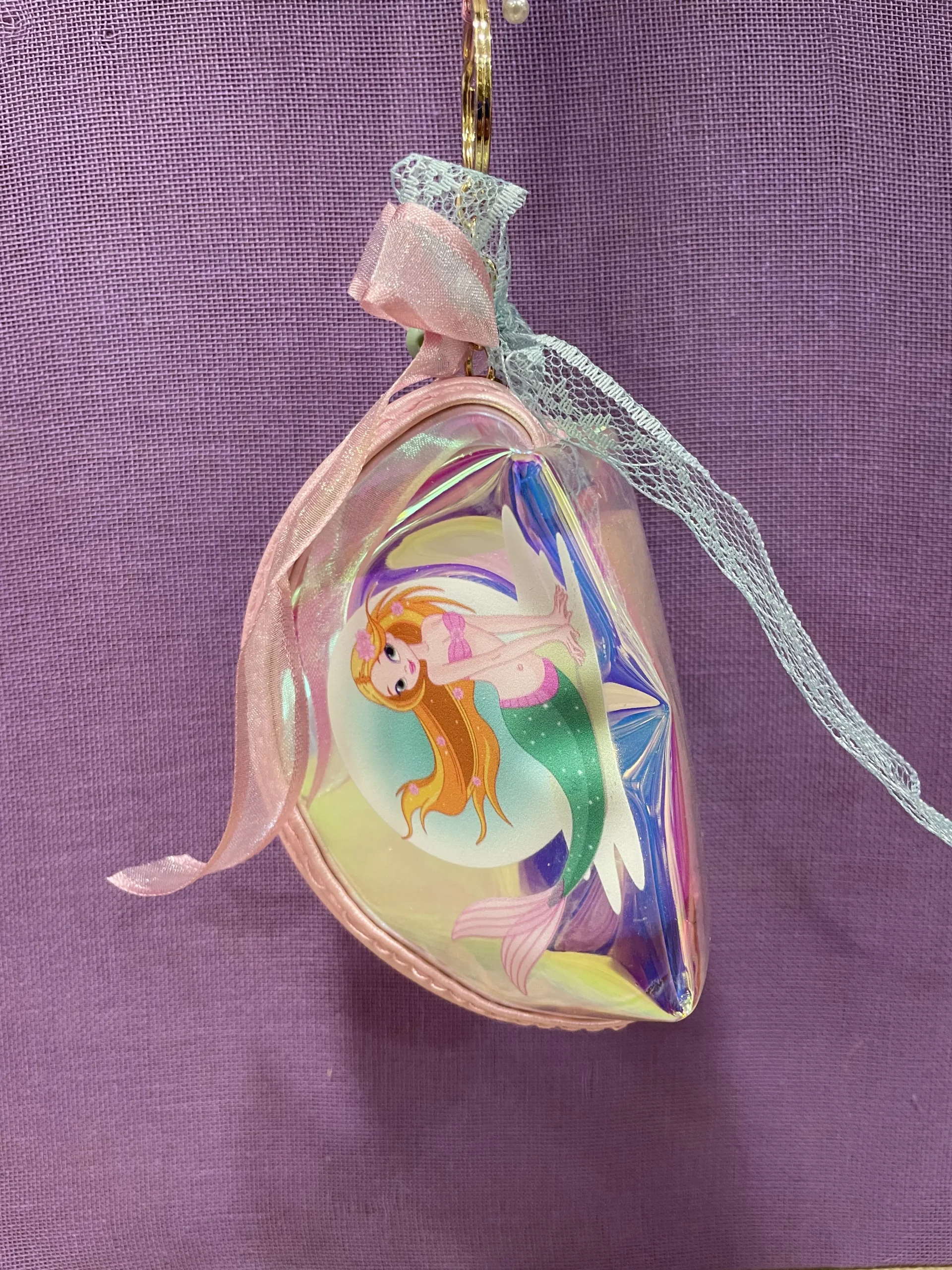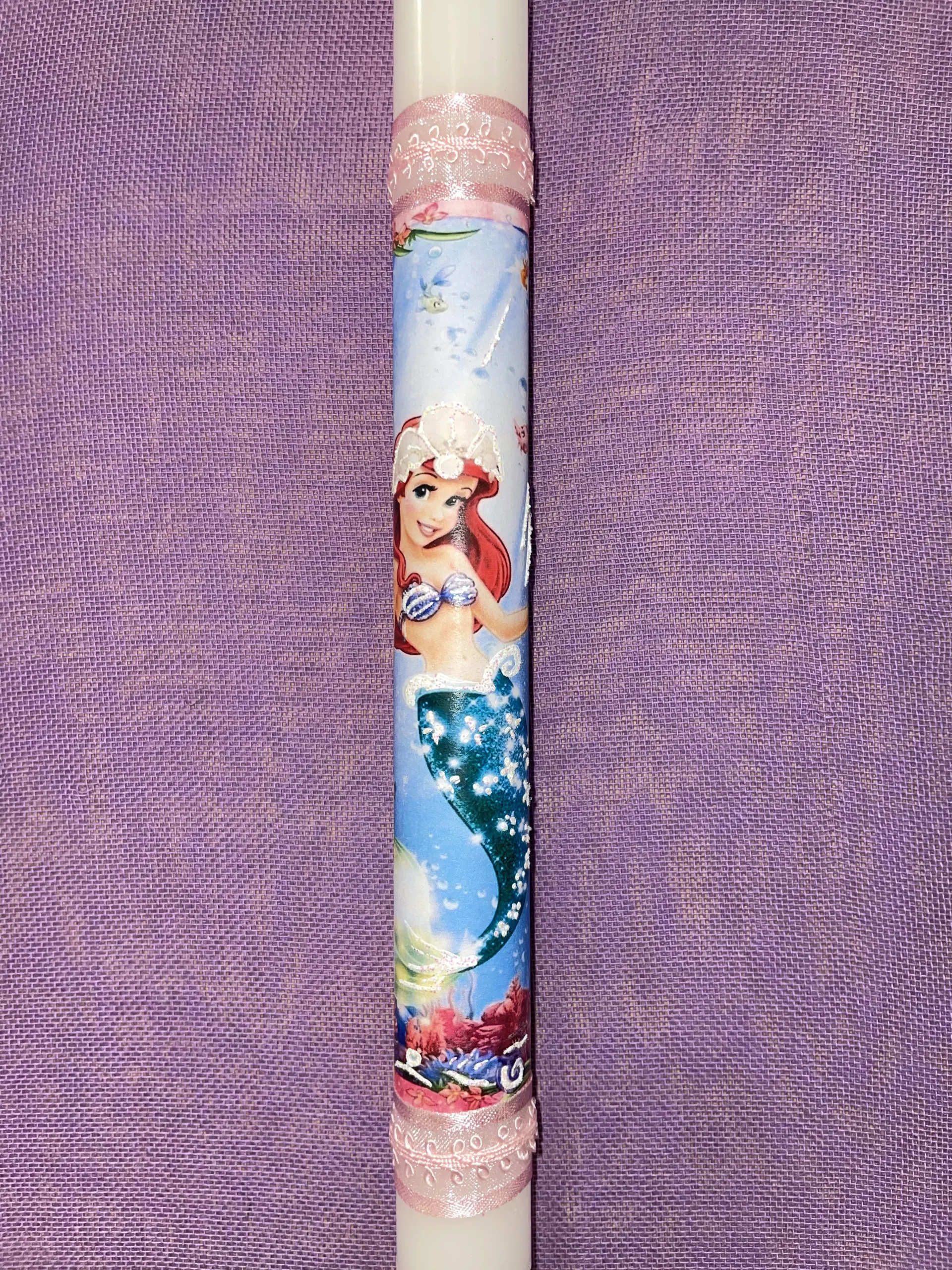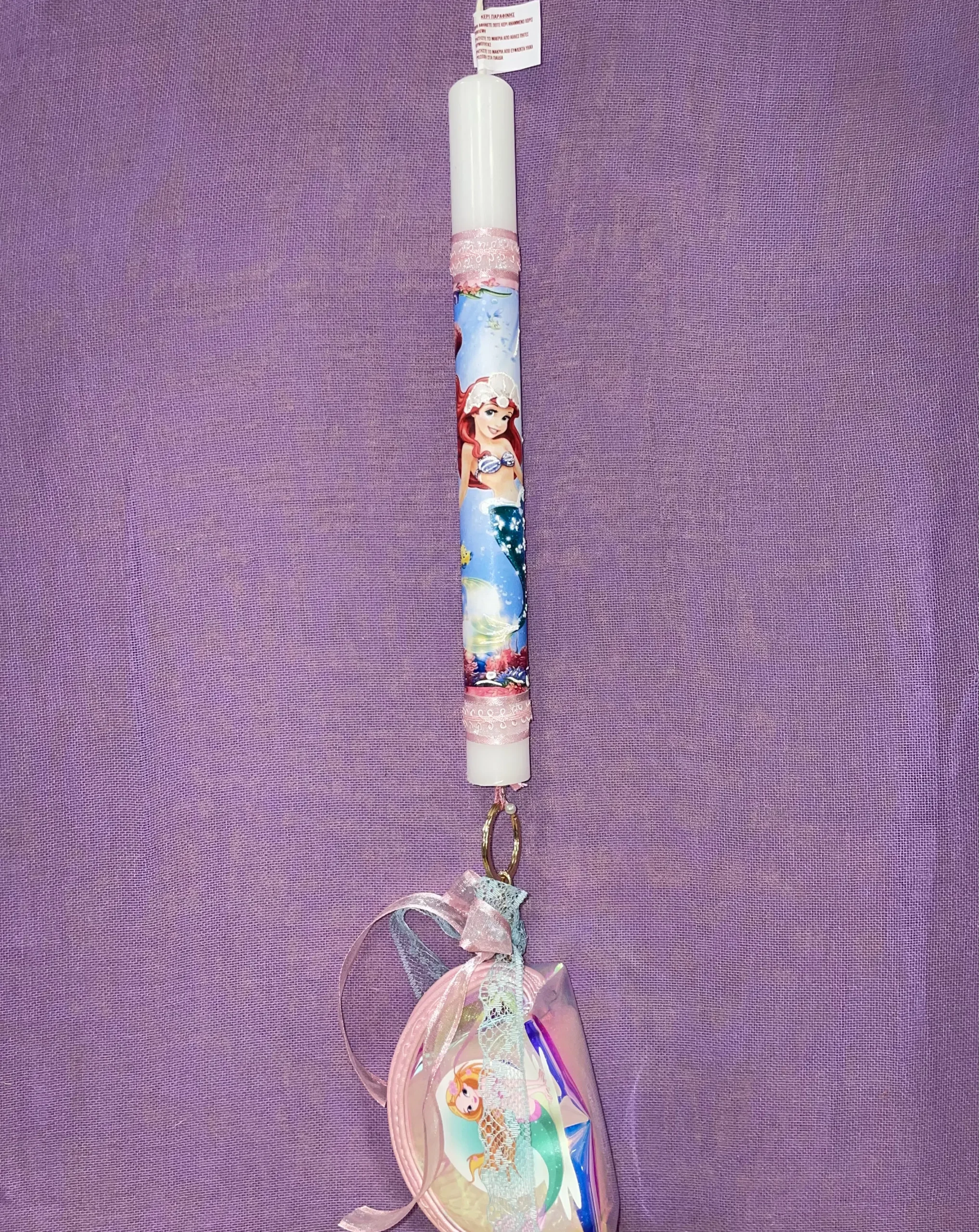 Ετικέτα: Λευκή στρογγυλή λαμπάδα με ζωγραφισμένη Ariel και κρεμαστό πορτοφολάκι