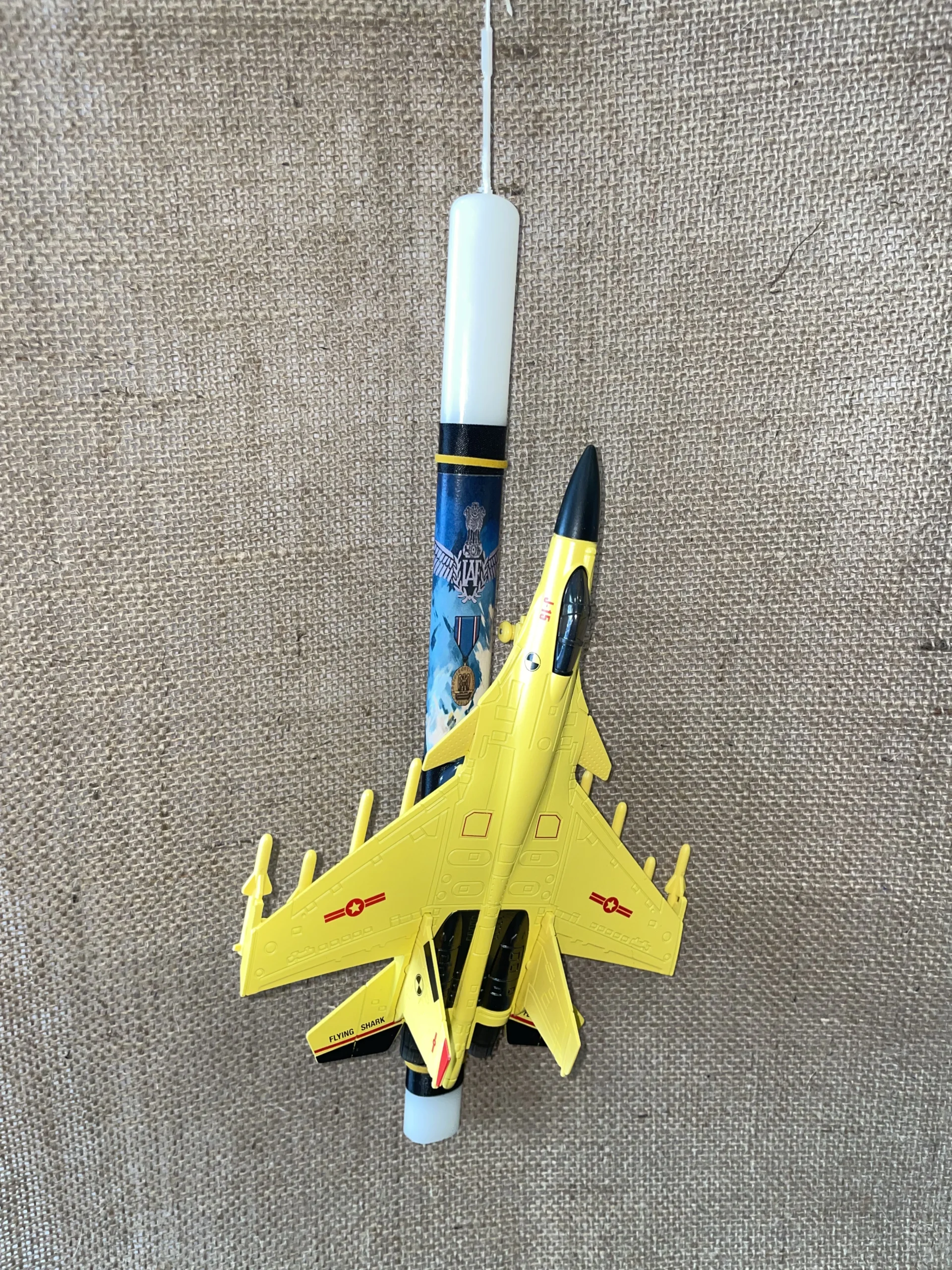 Λευκή στρογγυλή λαμπάδα με κίτρινο μεγάλο μαχητικό αεροπλάνο