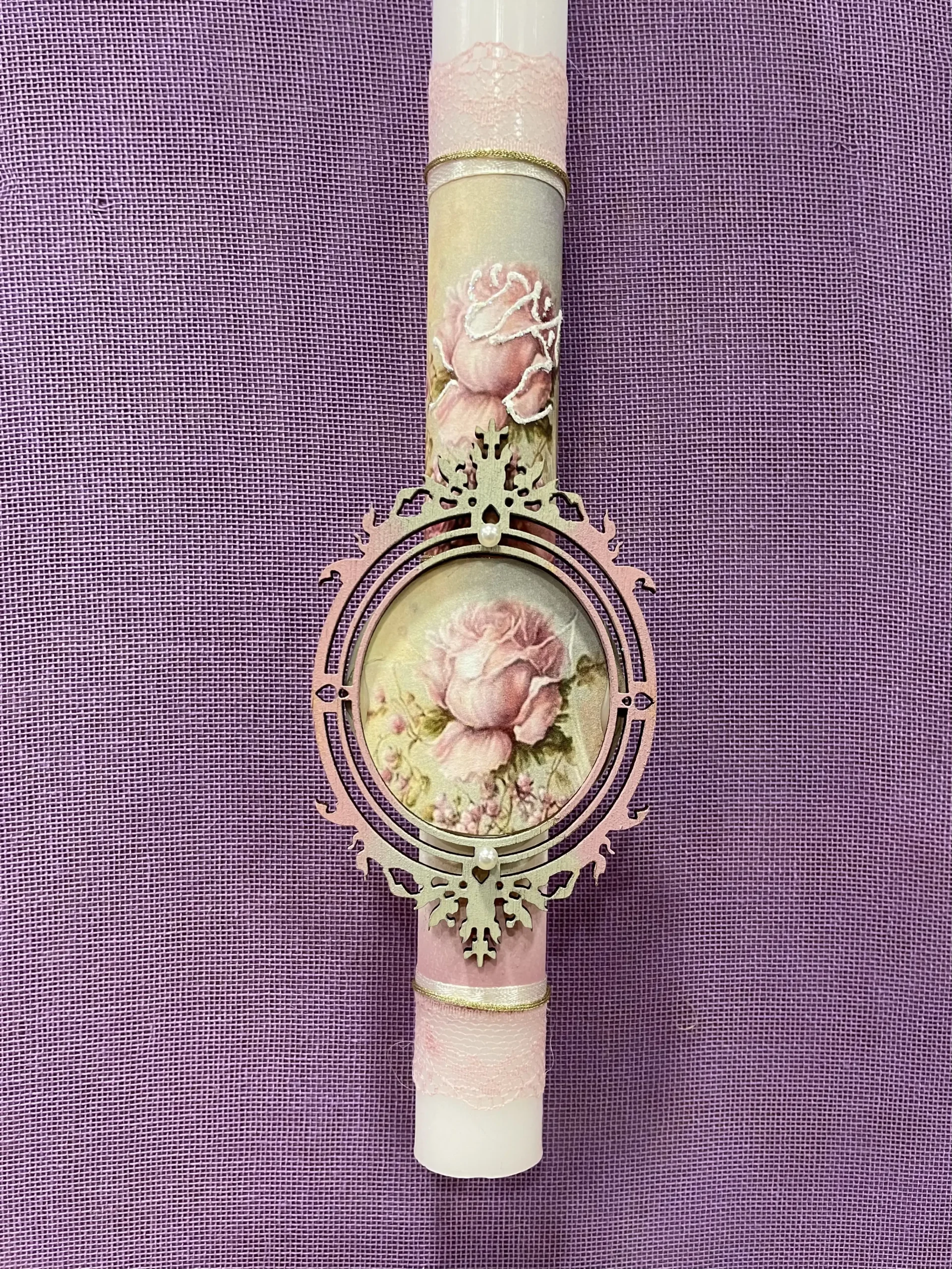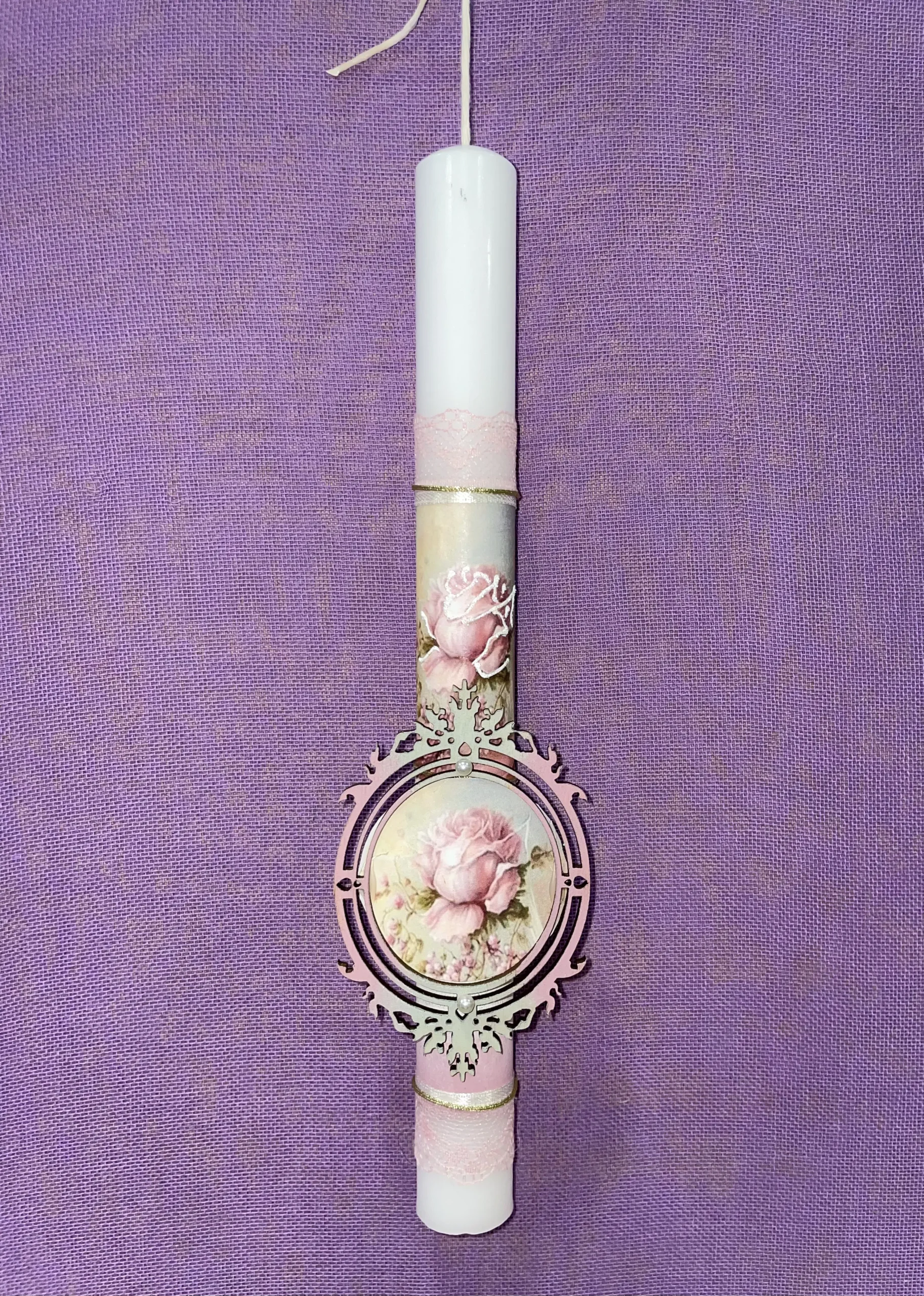Ετικέτα: Λευκή στρογγυλή λαμπάδα με καδράκι με τριαντάφυλλο