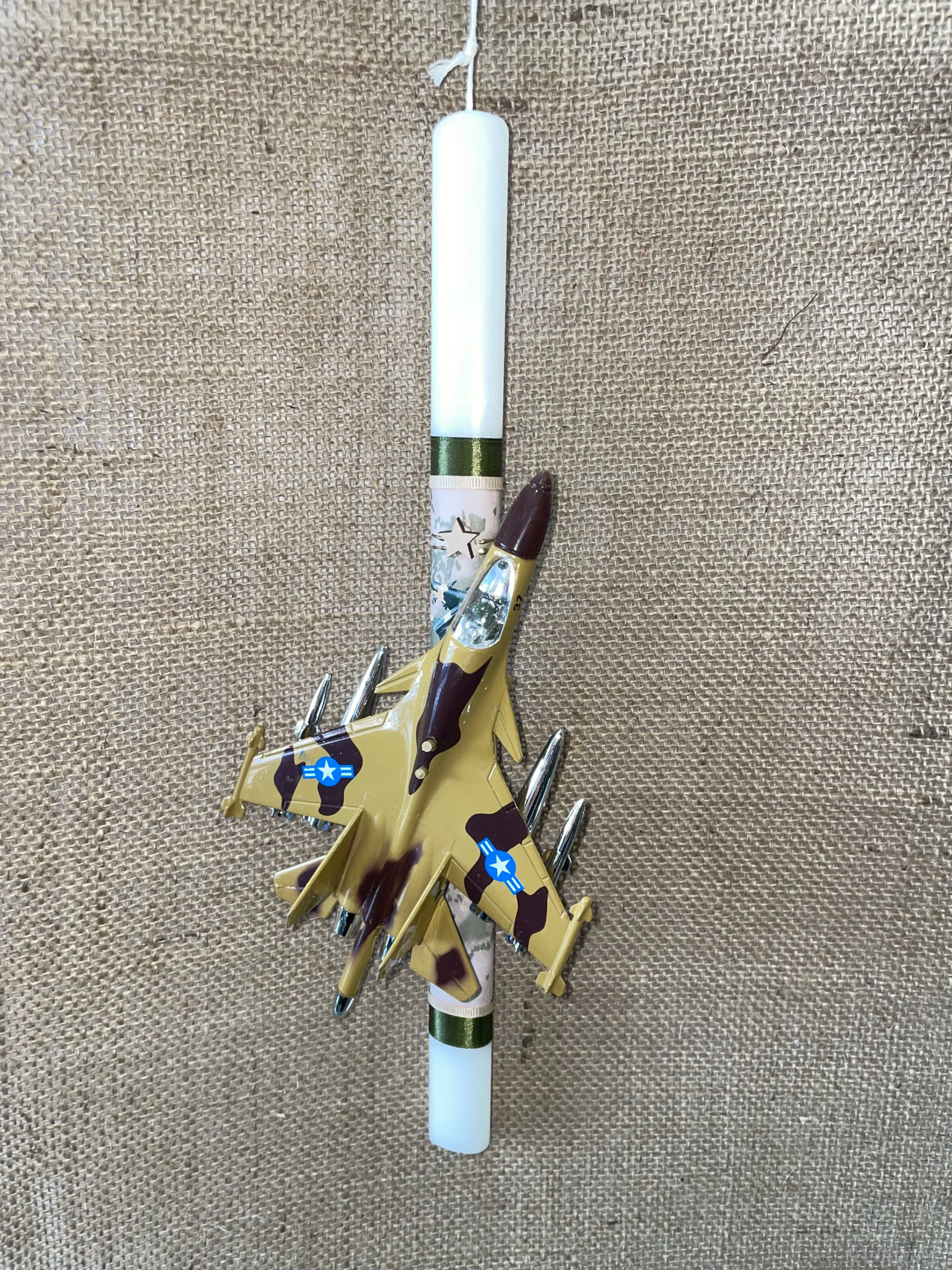 Ετικέτα: Λευκή στρογγυλή λαμπάδα με καφέ μαχητικό αεροπλάνο