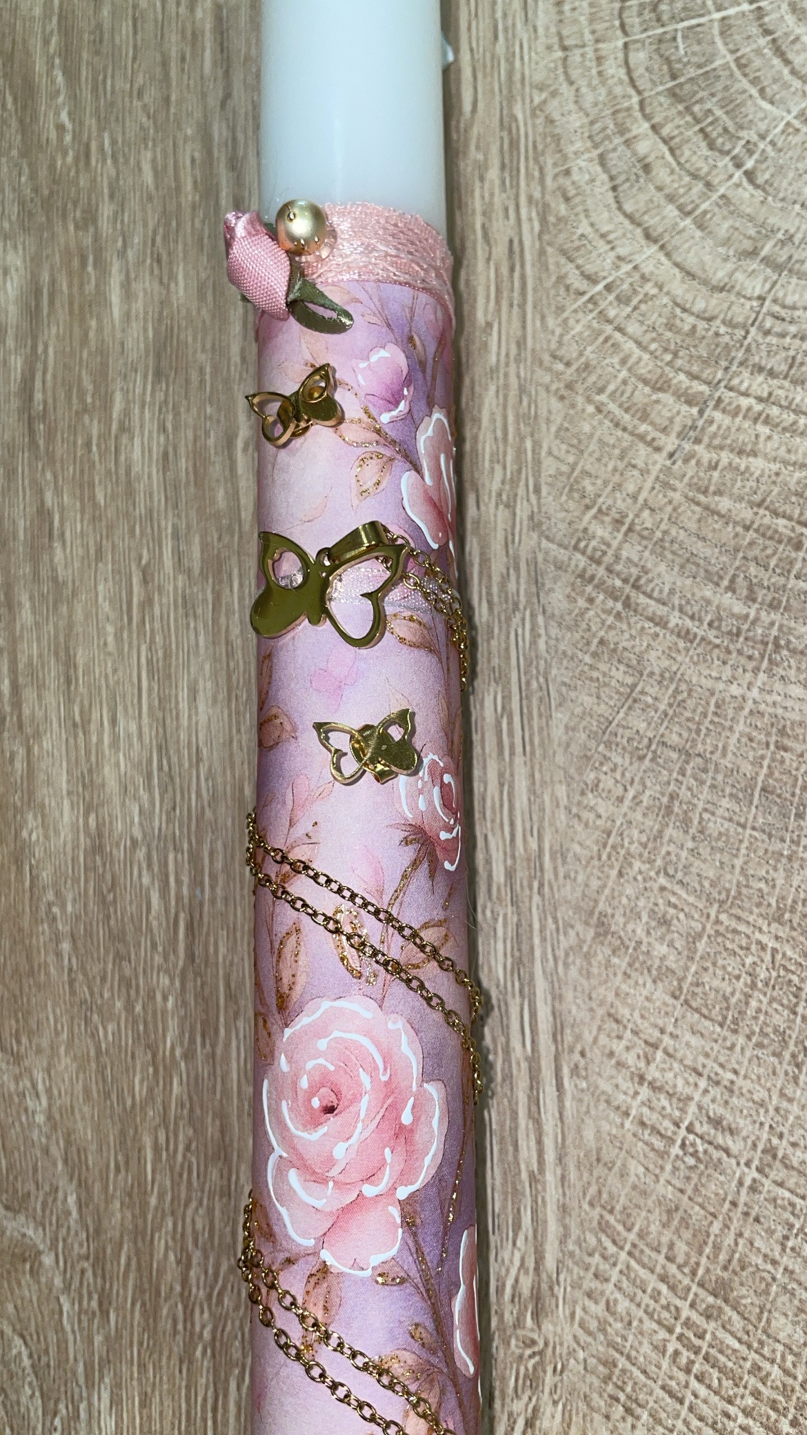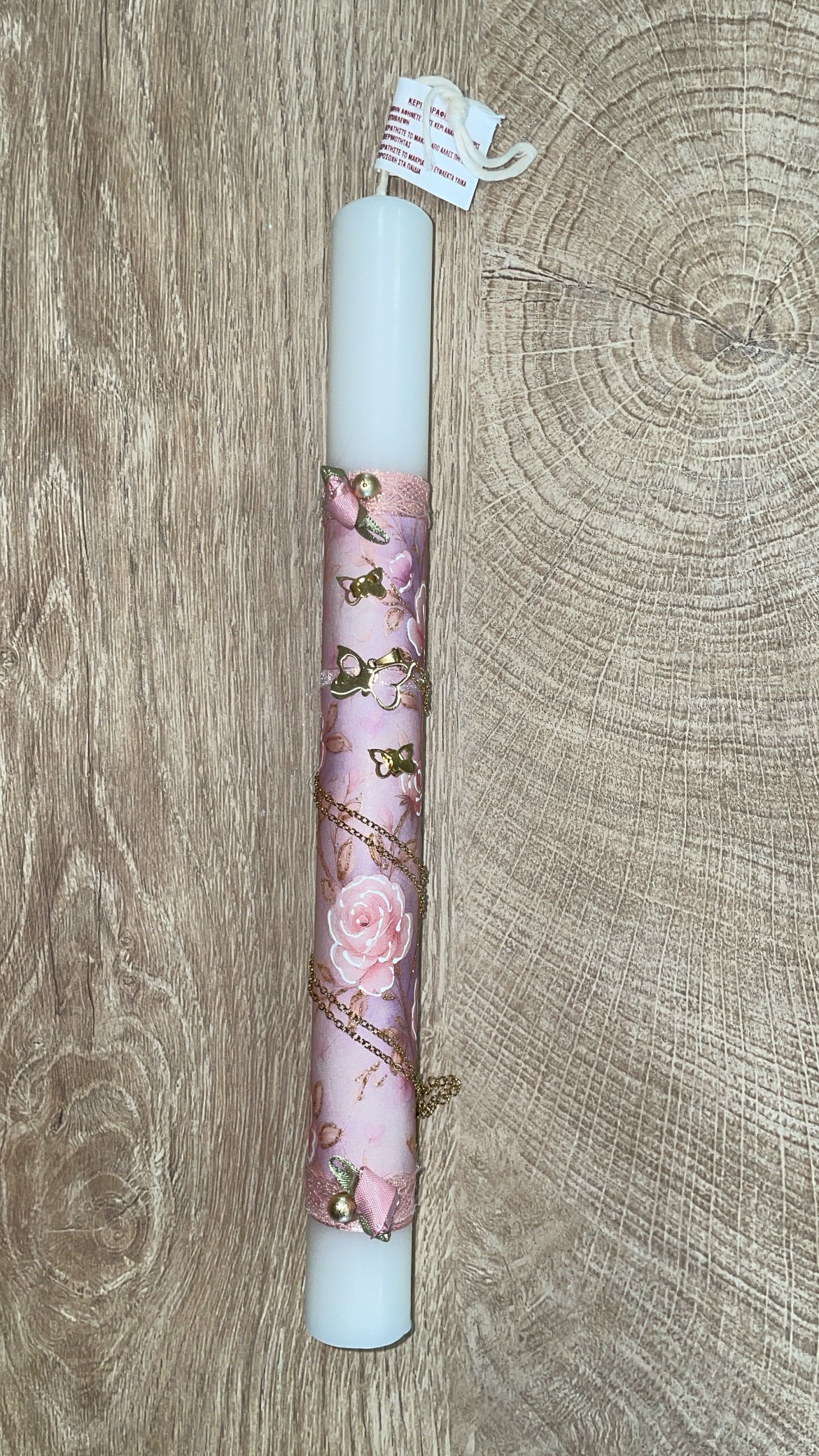Λευκή στρογγυλή λαμπάδα με κολιέ και σκουλαρίκια πεταλούδα