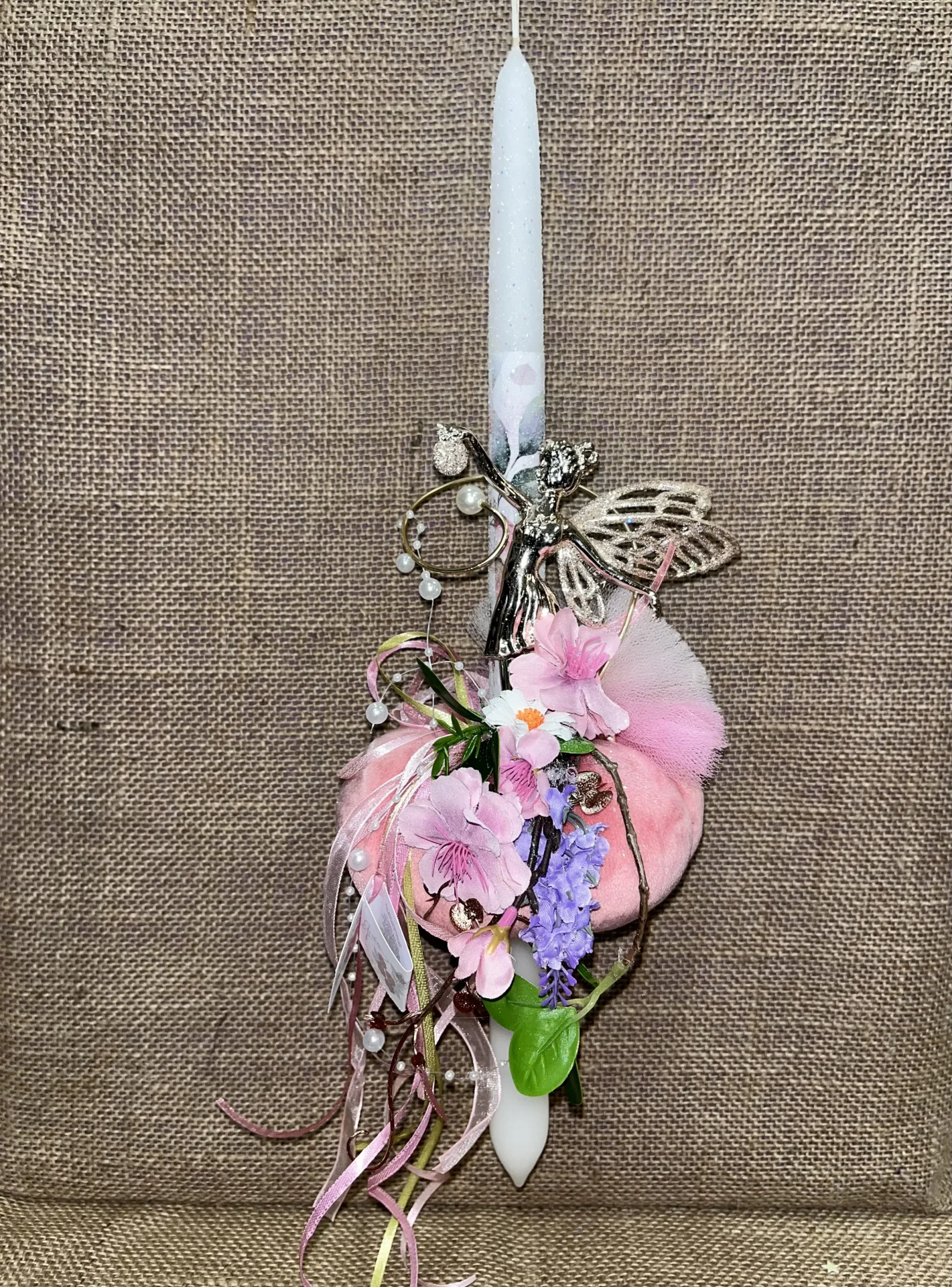 Λευκή στρογγυλή λαμπάδα με κολοκύθα και χρυσή νεράϊδα