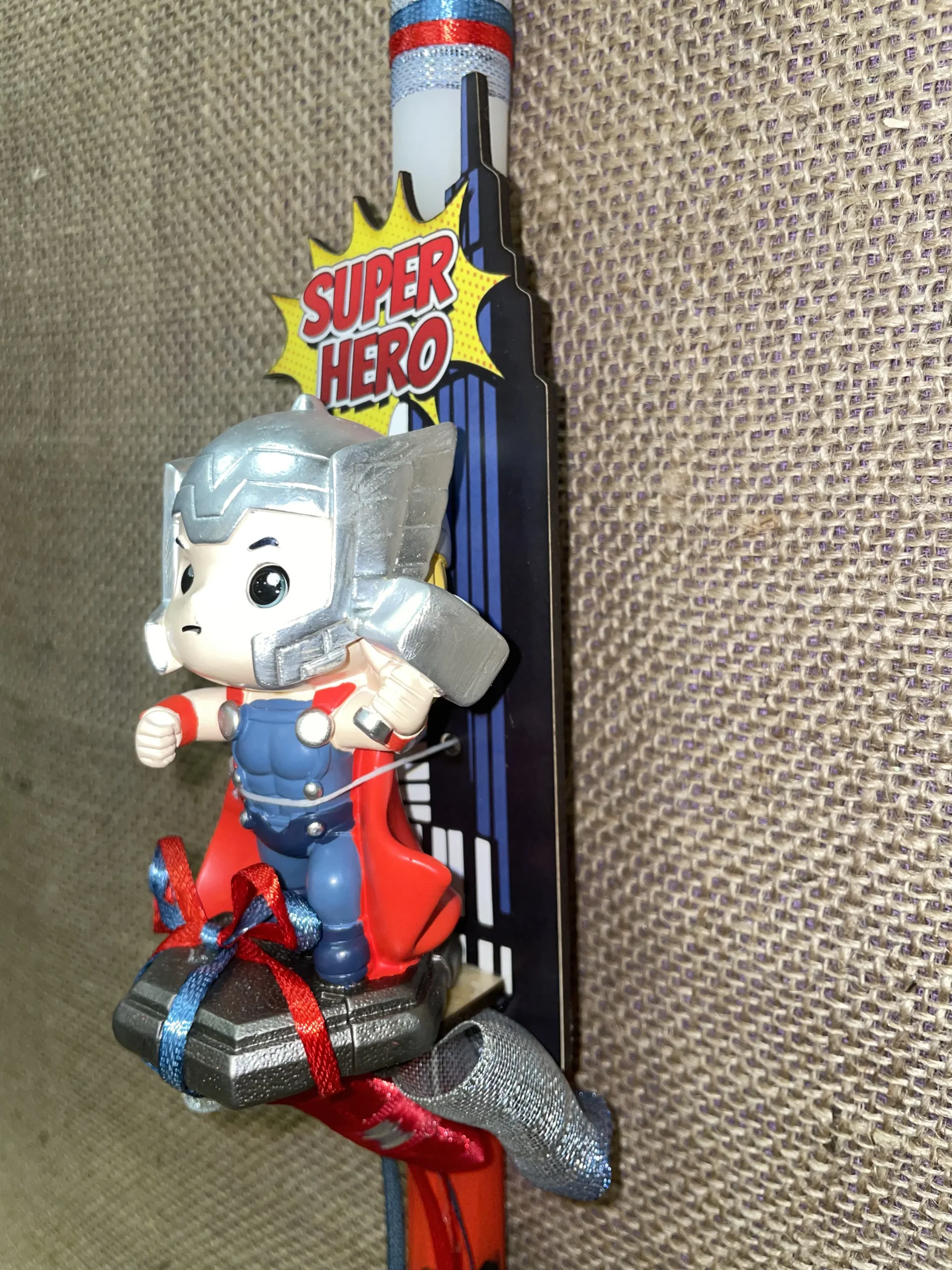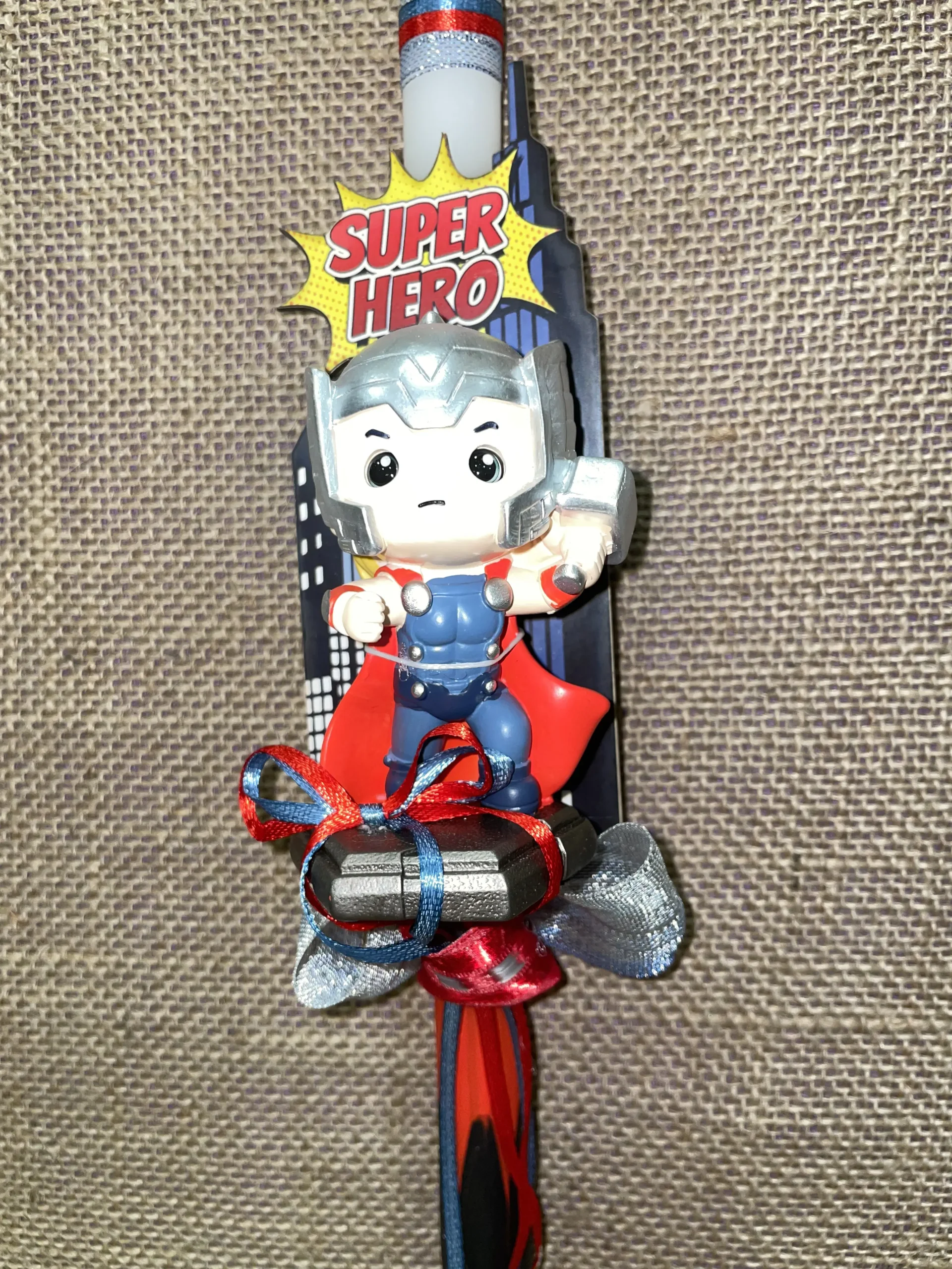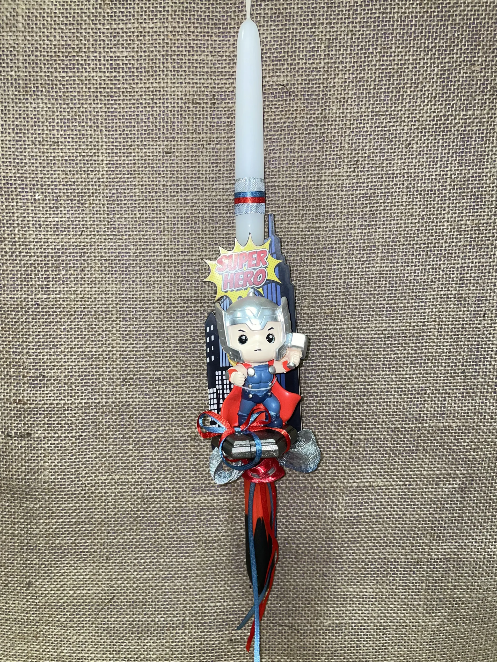 Ετικέτα: Λευκή στρογγυλή λαμπάδα με κόκκινο και μάυρο και τρισδιάστατο ήρωα Thunder Thor