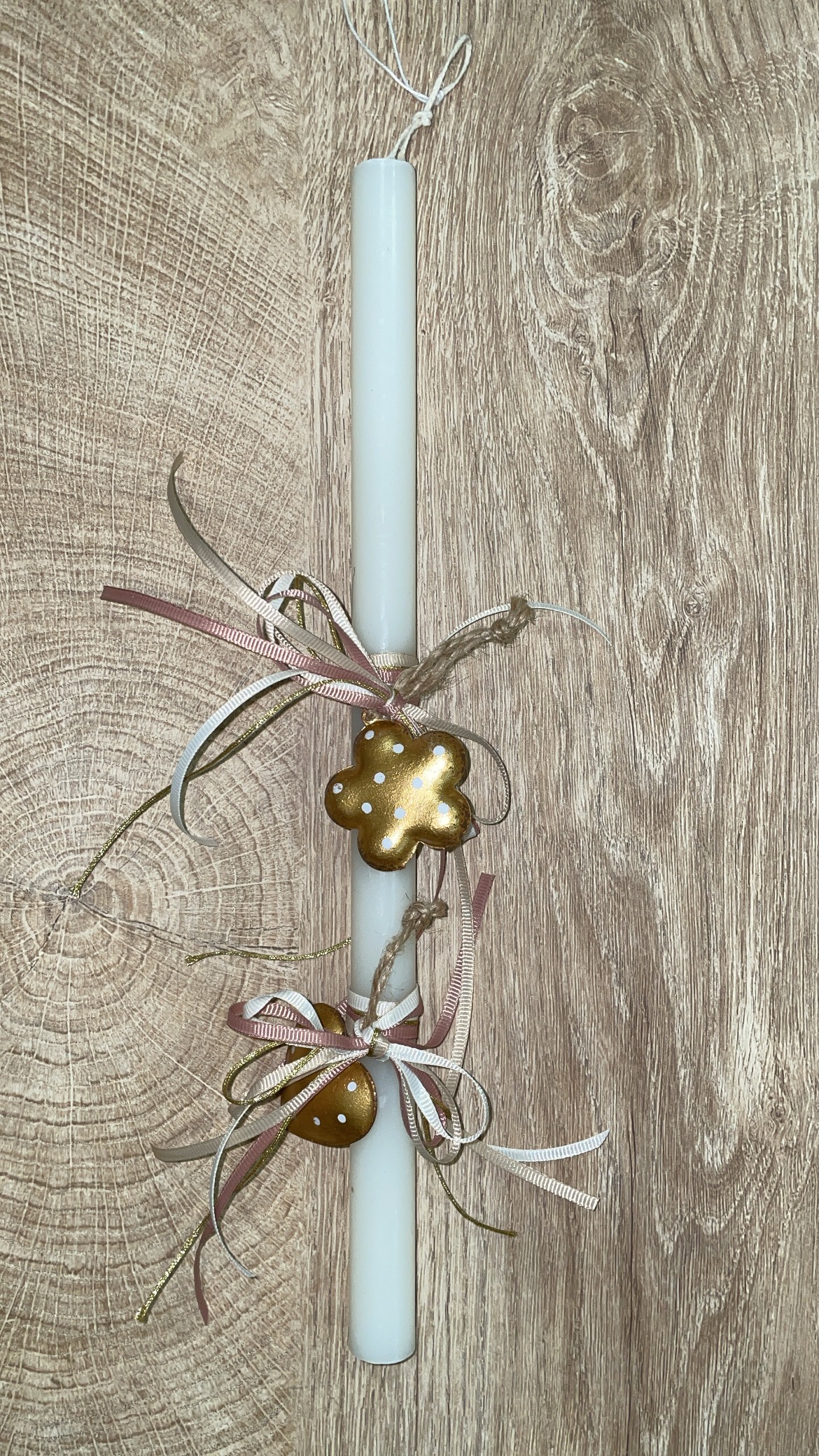 Λευκή στρογγυλή λαμπάδα με μεταλλικό λουλούδι και καρδιά