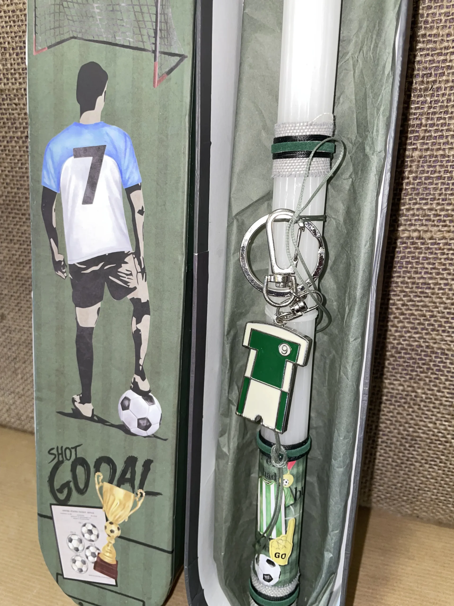 Λευκή στρογγυλή λαμπάδα με μπρελόκ πράσινη φανέλα – ΠΑΟ