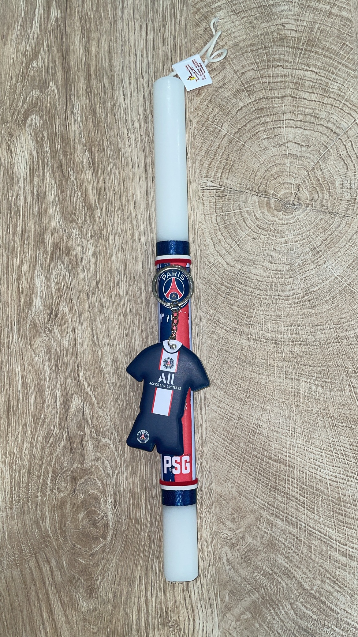 Λευκή στρογγυλή λαμπάδα με μπρελόκ φανέλα Paris Saint-Germain